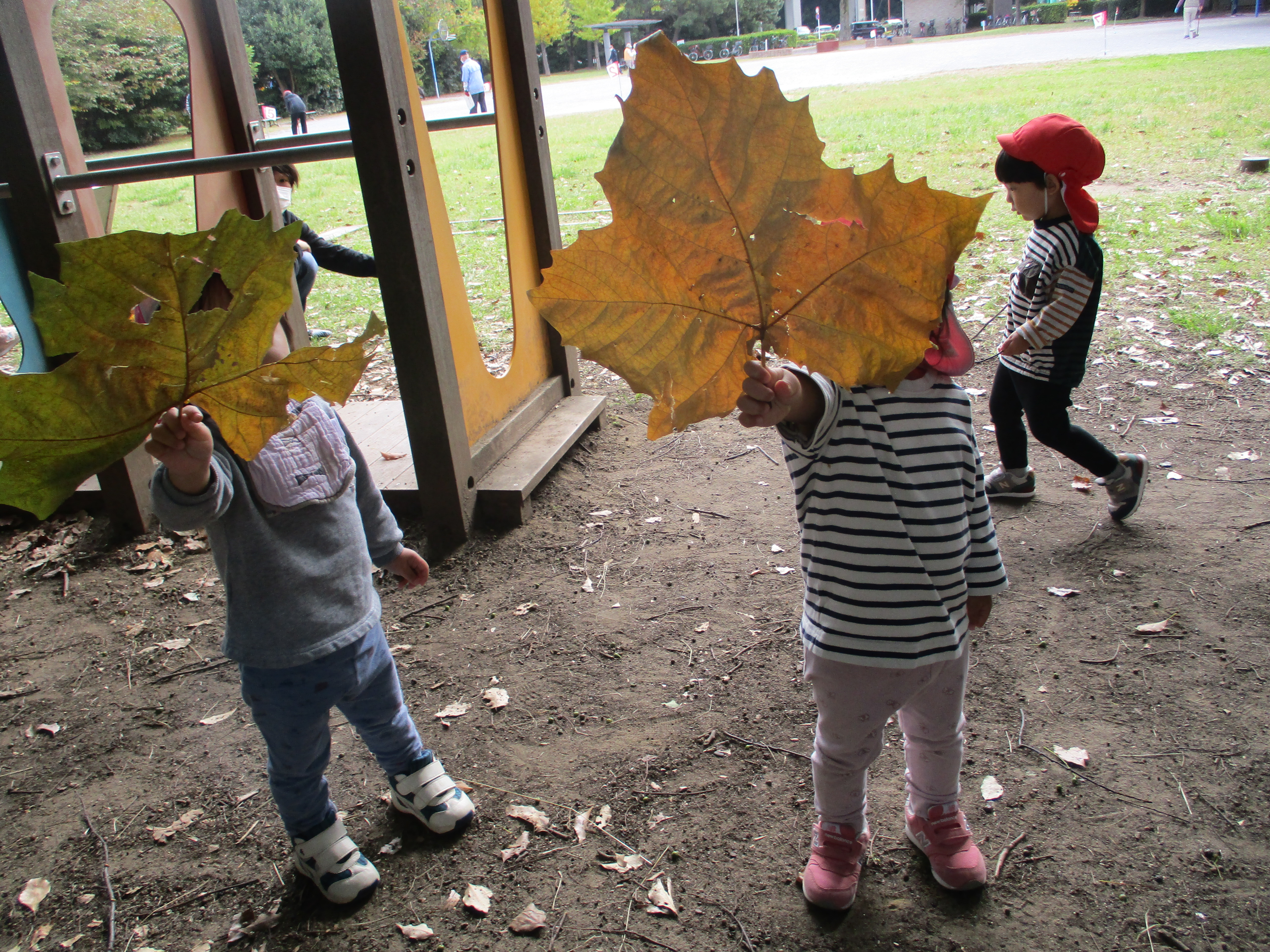 「見て!大きい!」と見つけた大きなプラタナスの葉を見せてくれたり、ドングリを集めて「あげる」と渡してくれたりしましたよ。あっちにもこっちにも沢山の発見がありました。