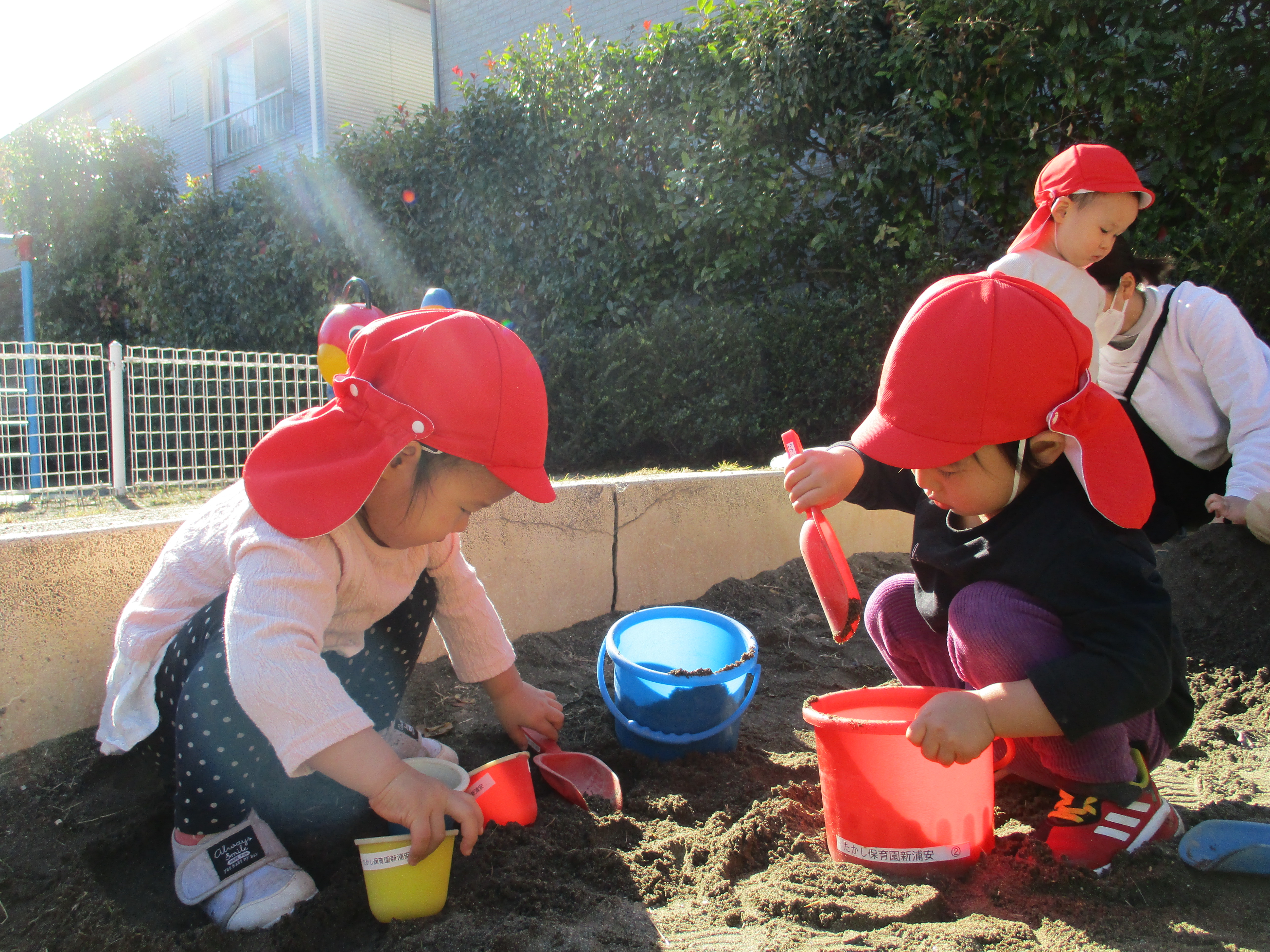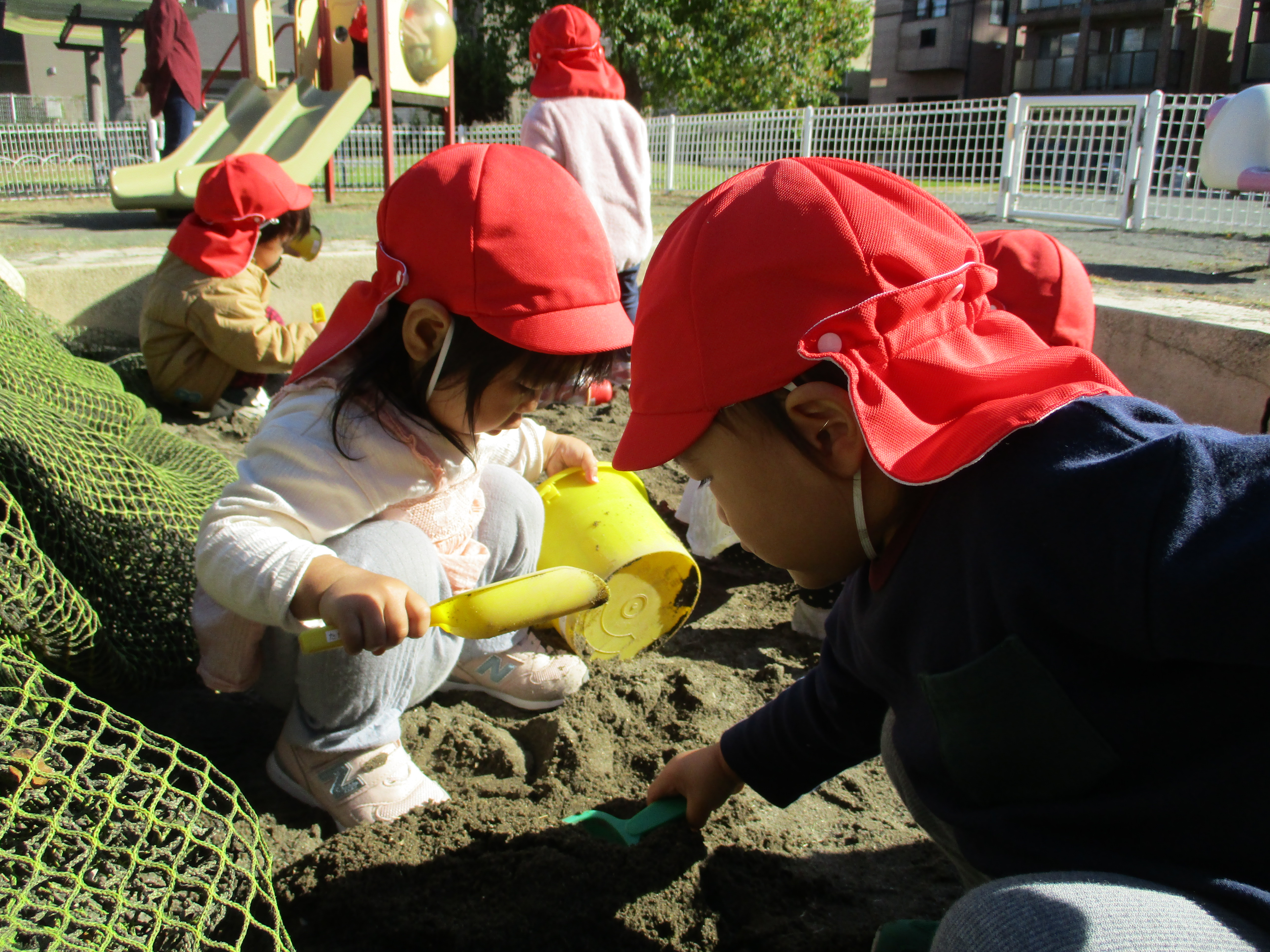 砂場では、スコップを上手に使って砂を入れてケーキを作り、木の実を乗せて楽しんでいました。