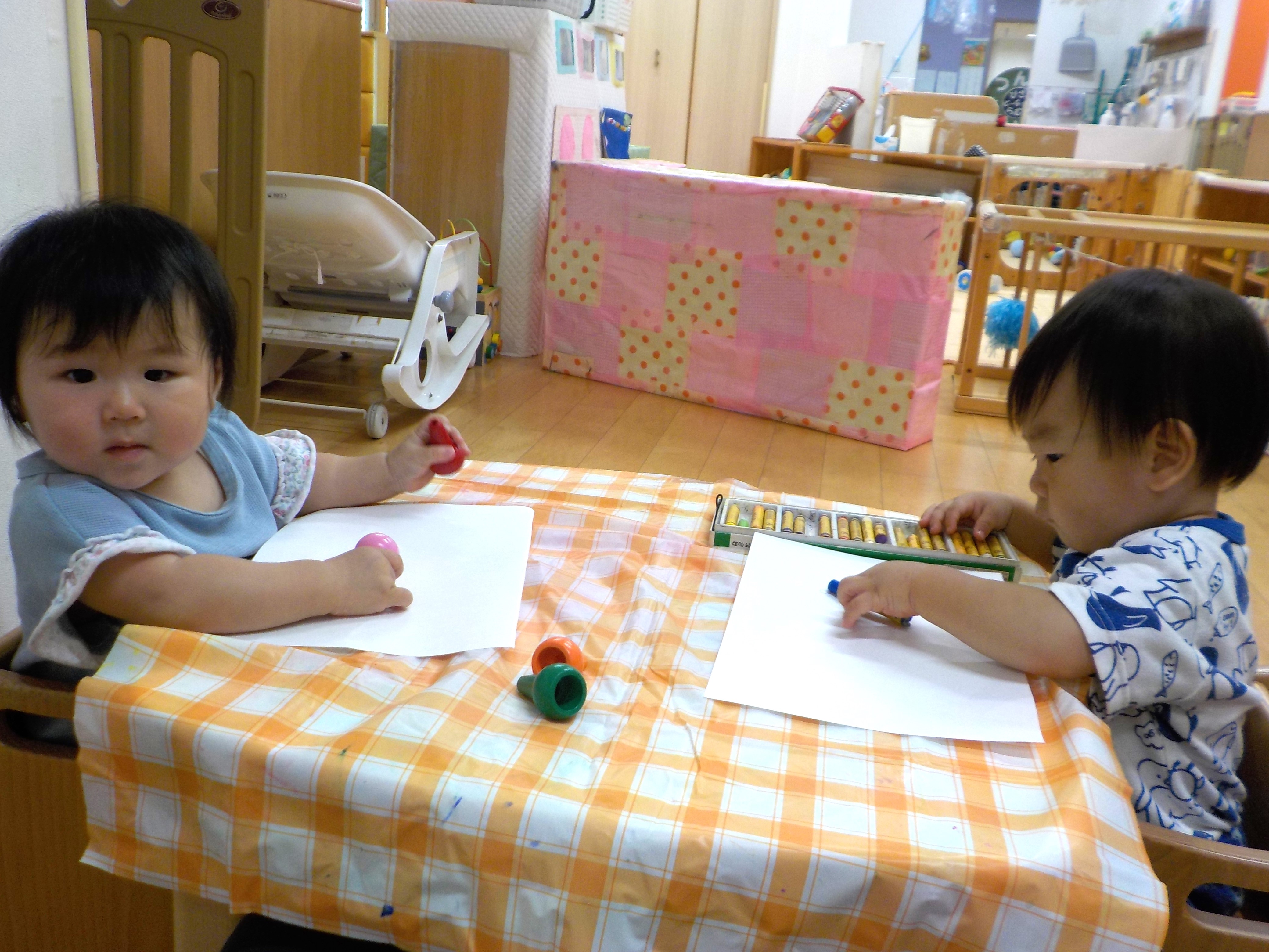 9月も暑い日が多く戸外に行けない日が続いたので、室内でゆったりとしたり、身体を動かしたりして過ごしました。クレヨンに初挑戦! 手に取り保育者と一緒に描いてみると、色が紙に出て不思議そうにしていました。慣れてくると自分で色を選び、お絵描きを楽しんでいました。