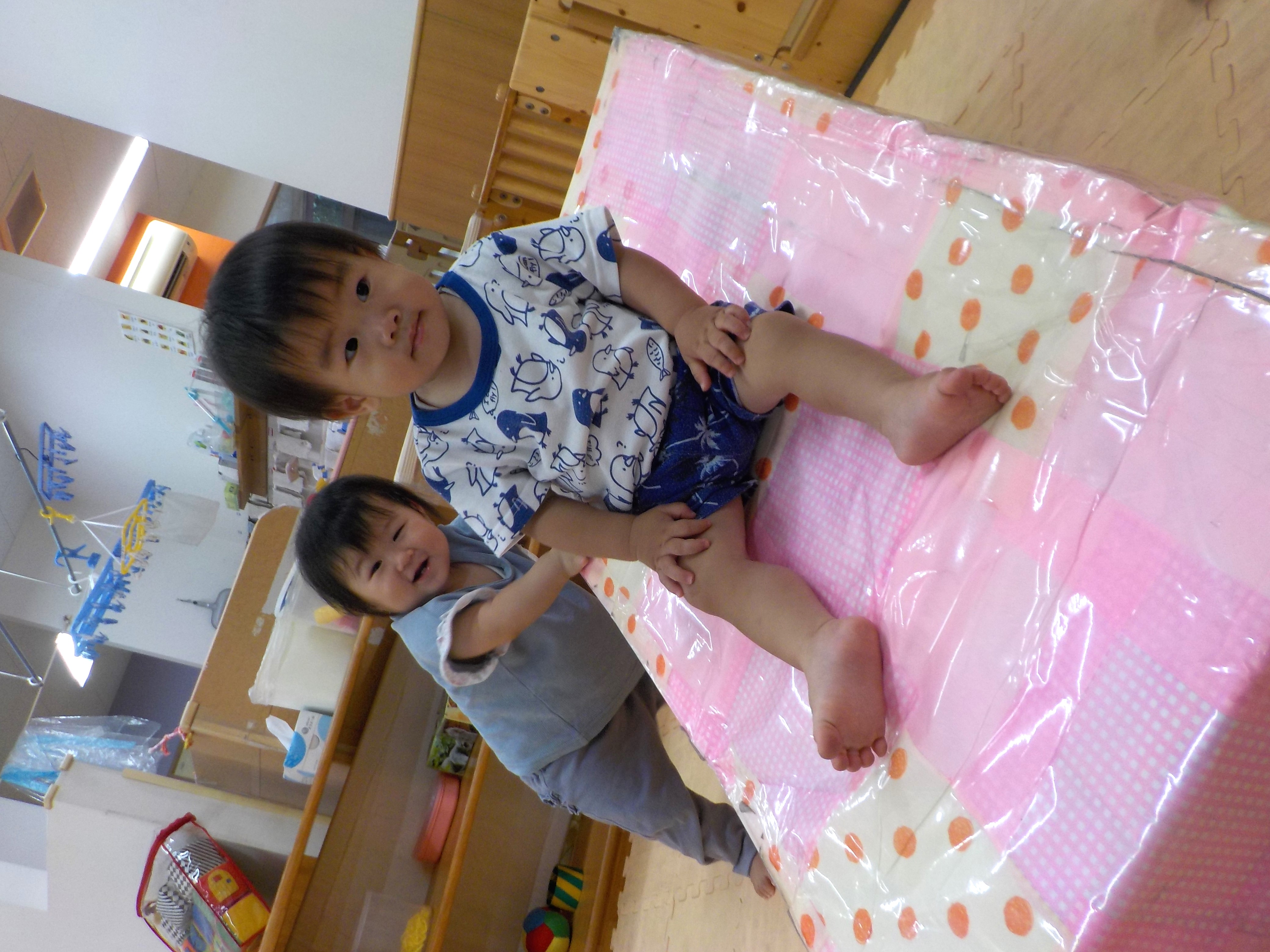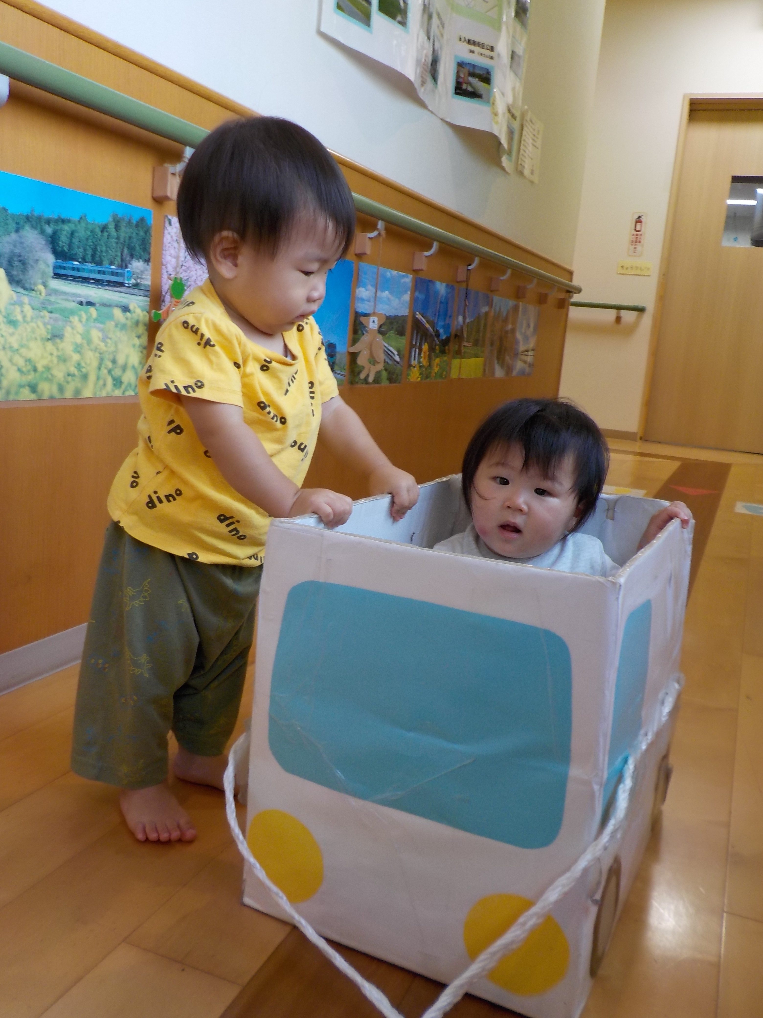 少し涼しい日には廊下に出てボール遊びをしたり、手作り電車に乗ったりしました。