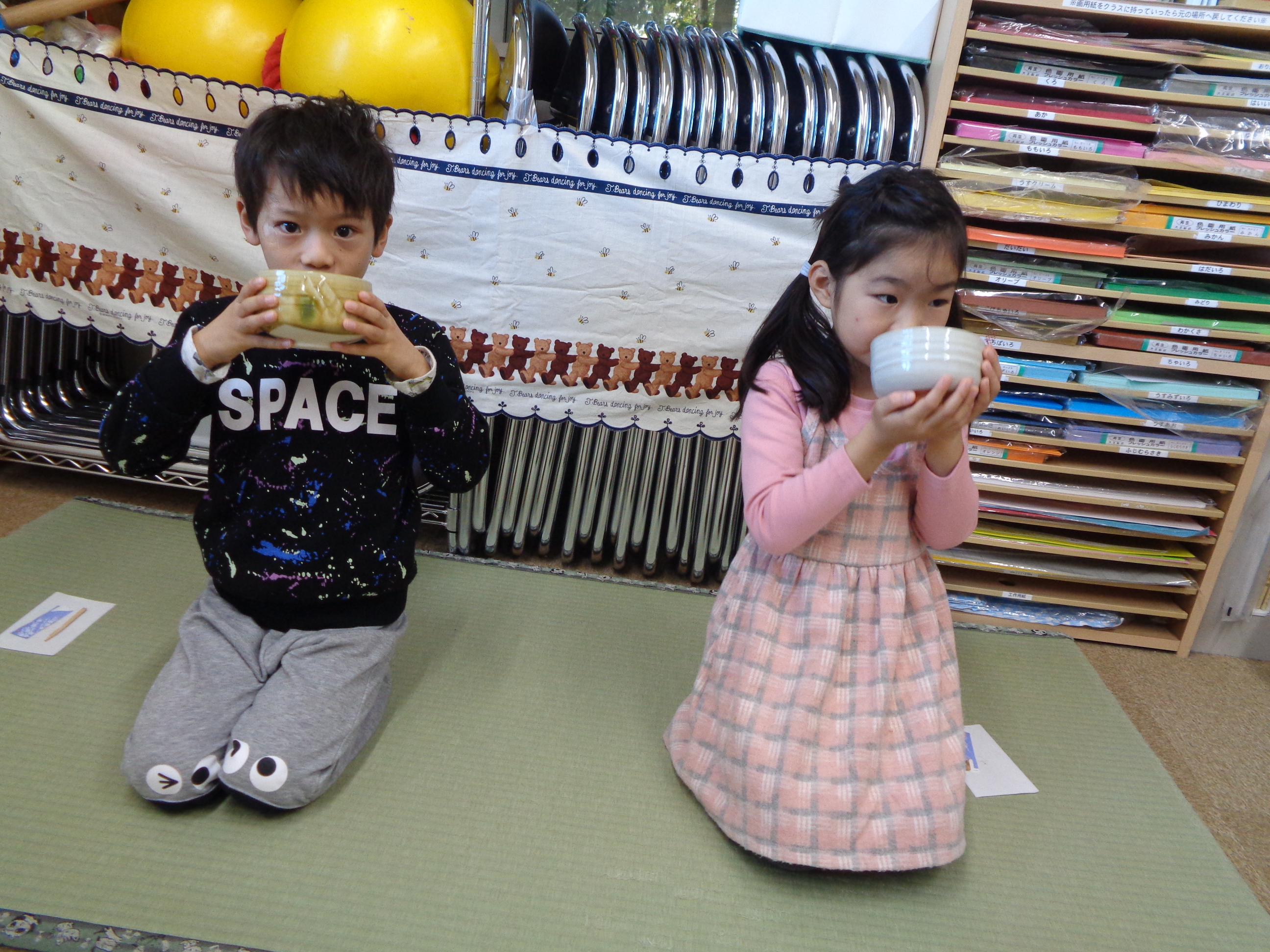 4歳さんたちは、ご挨拶もきちんとし、お友だちとようかんや抹茶の味わいを伝え合って楽しく行っていました。