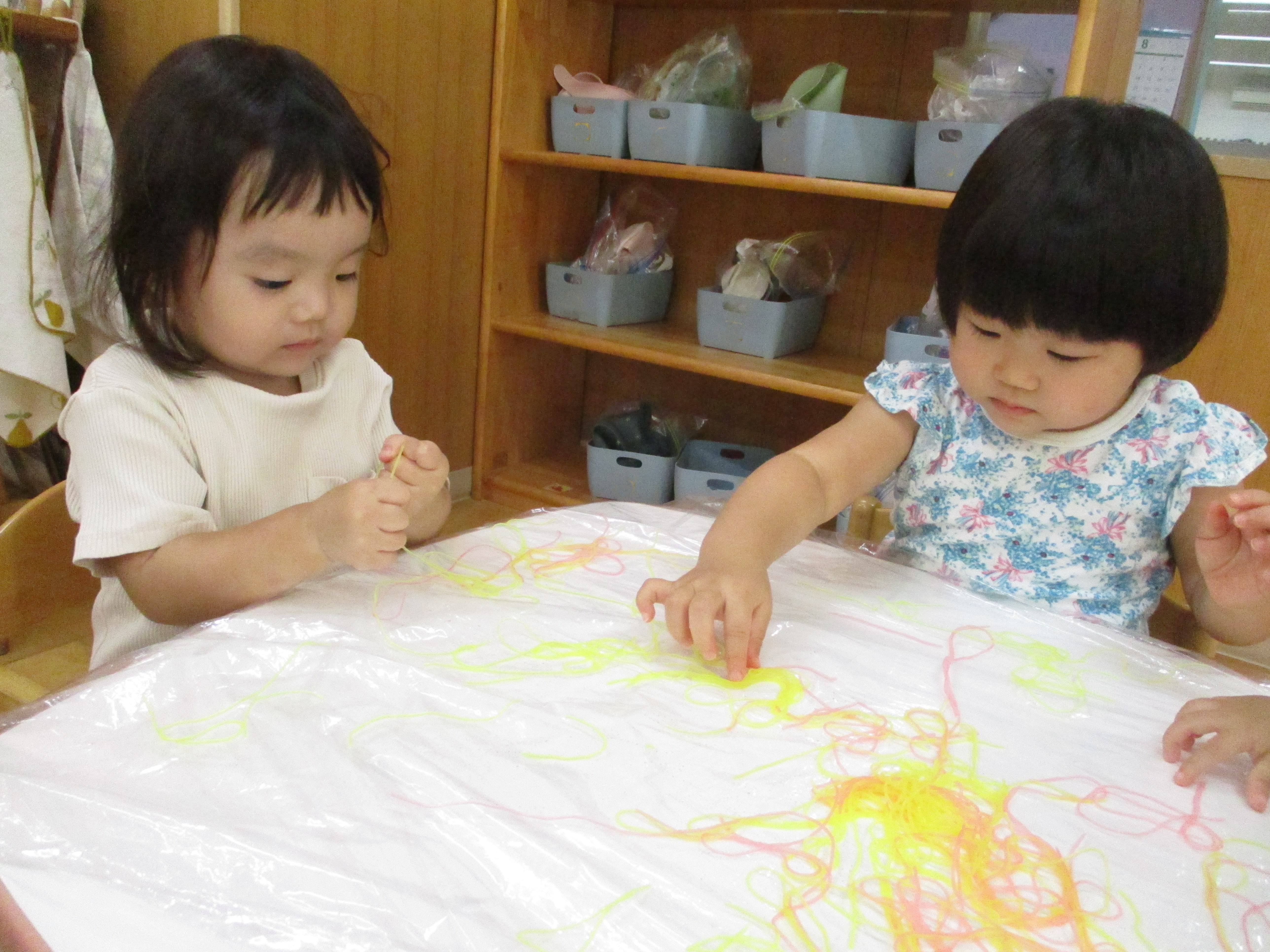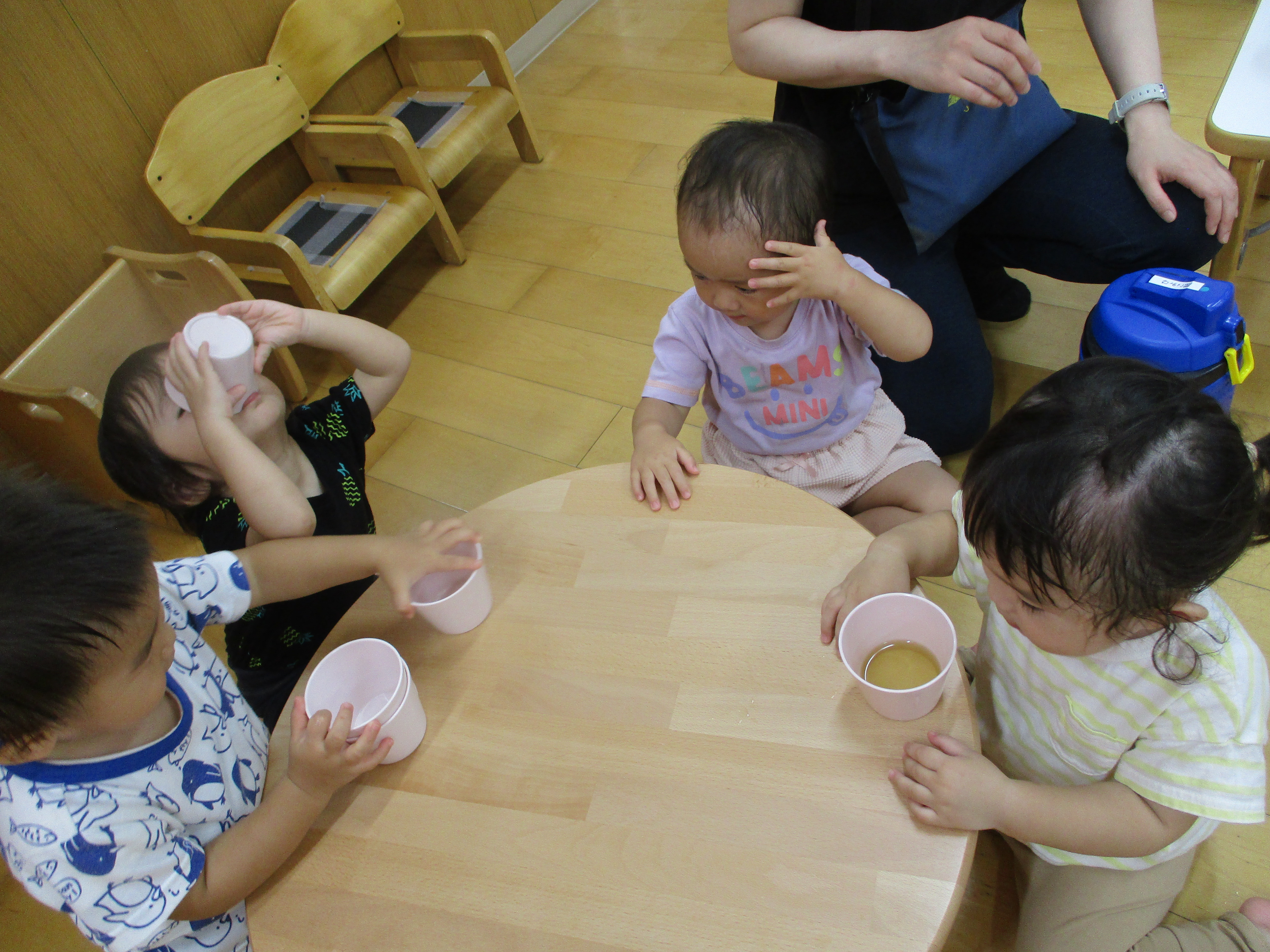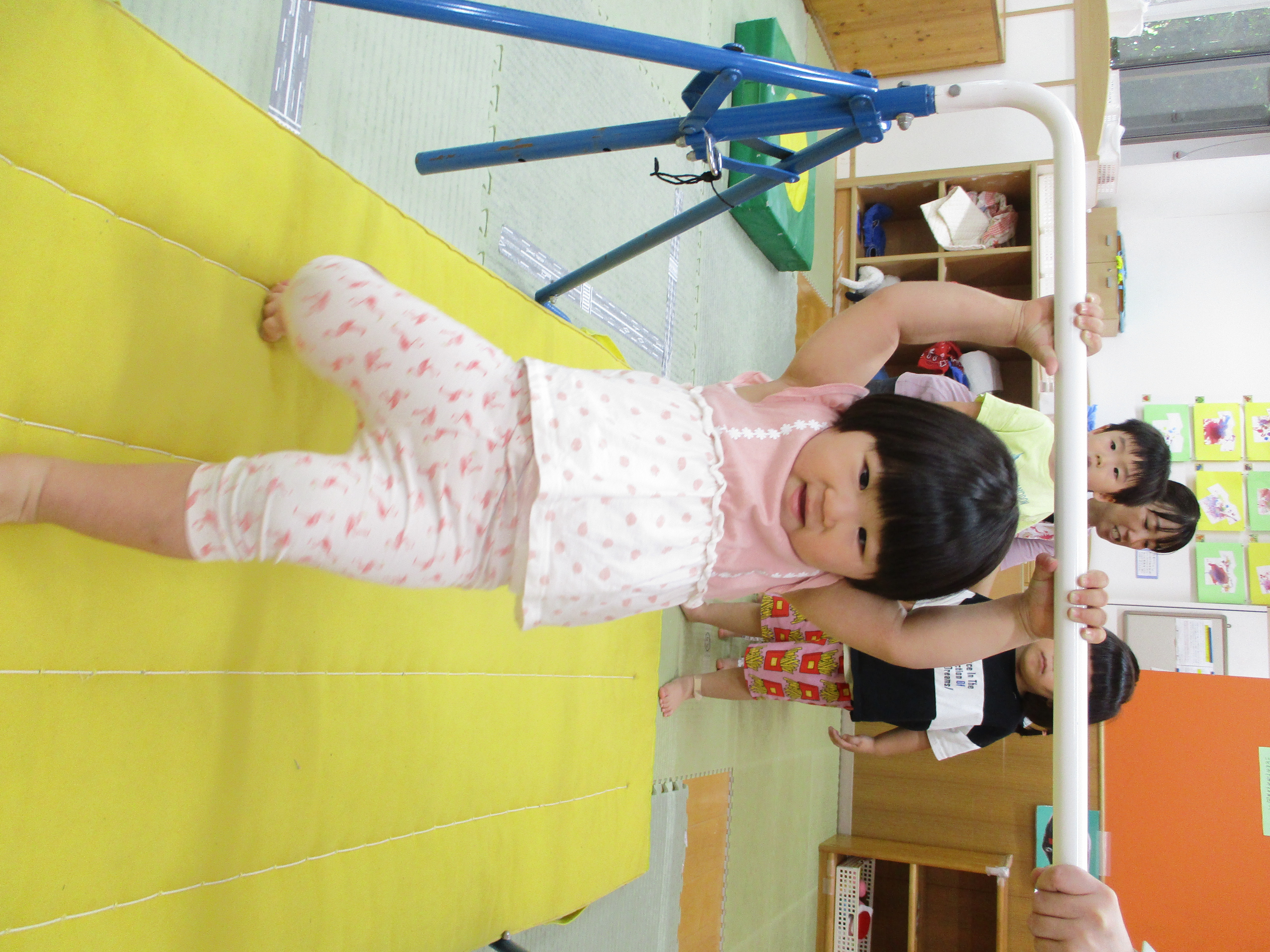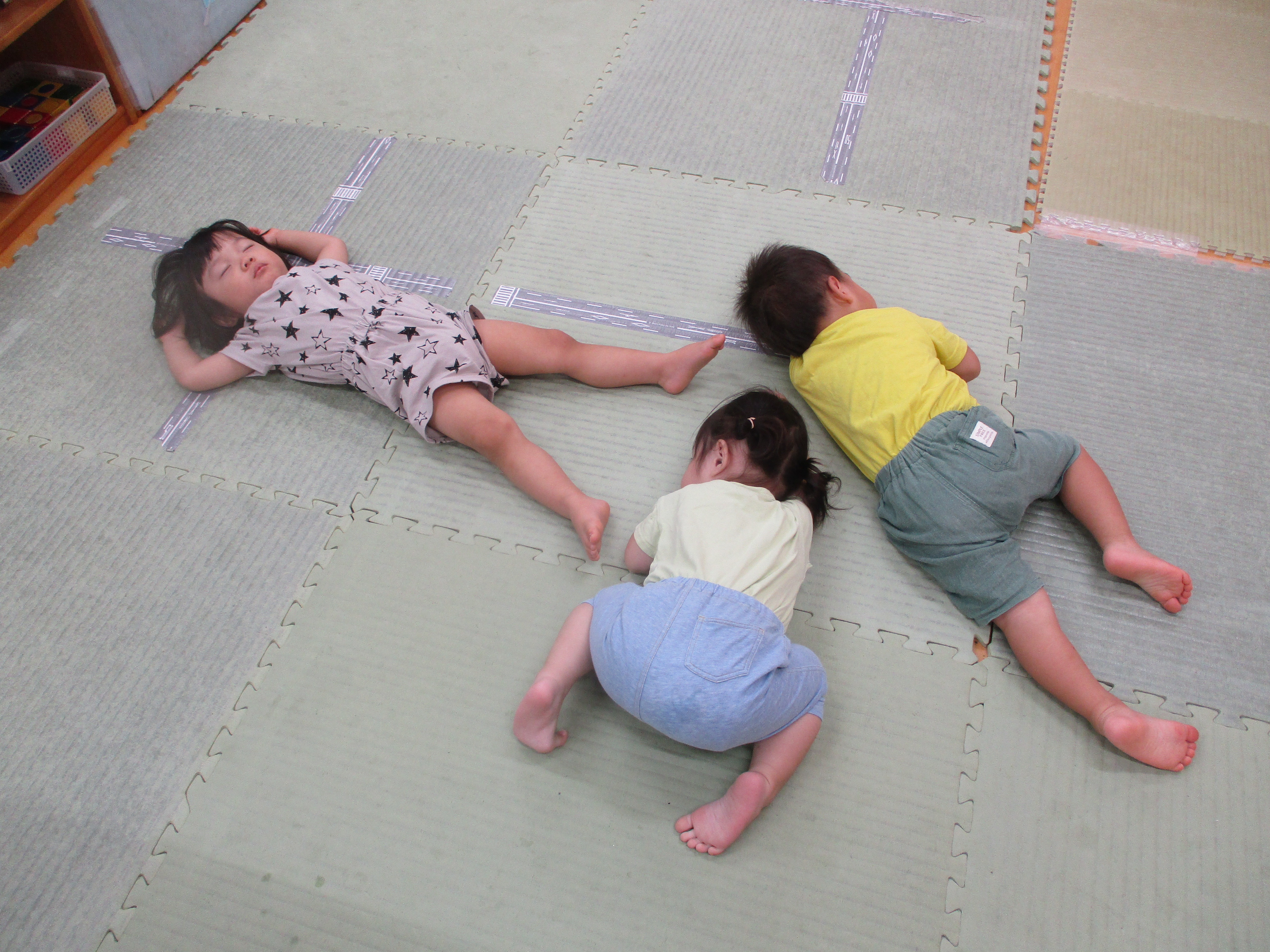 暑い日が続き戸外へ行けなかったですが、廊下やお部屋で沢山体を動かしました。走るのが上手になったり、ジャンプを1人で出来るようになったり様々な成長が見られました。体を動かした後は、しっかりと水分補給や休息をして暑い夏を乗り切りました。