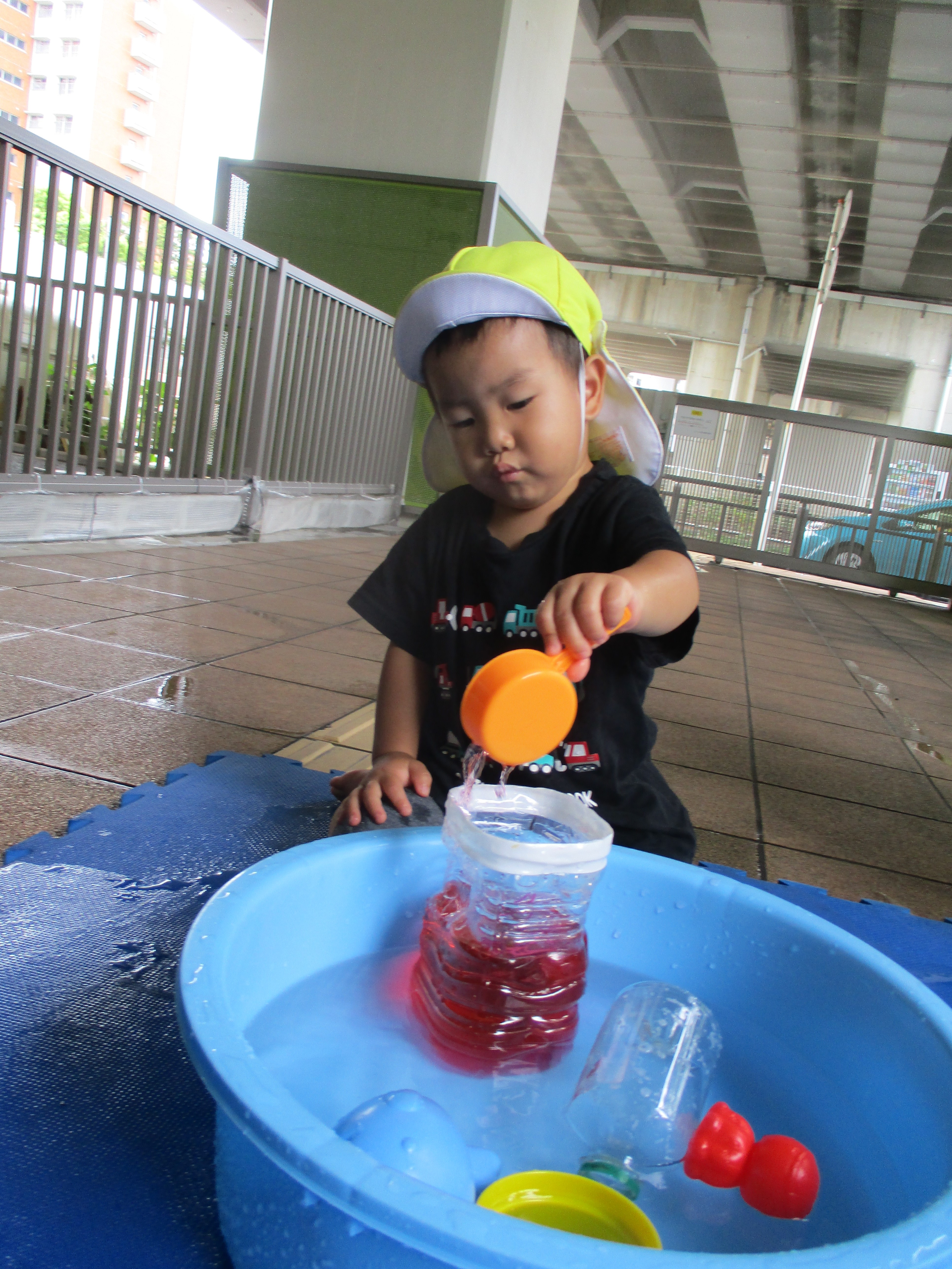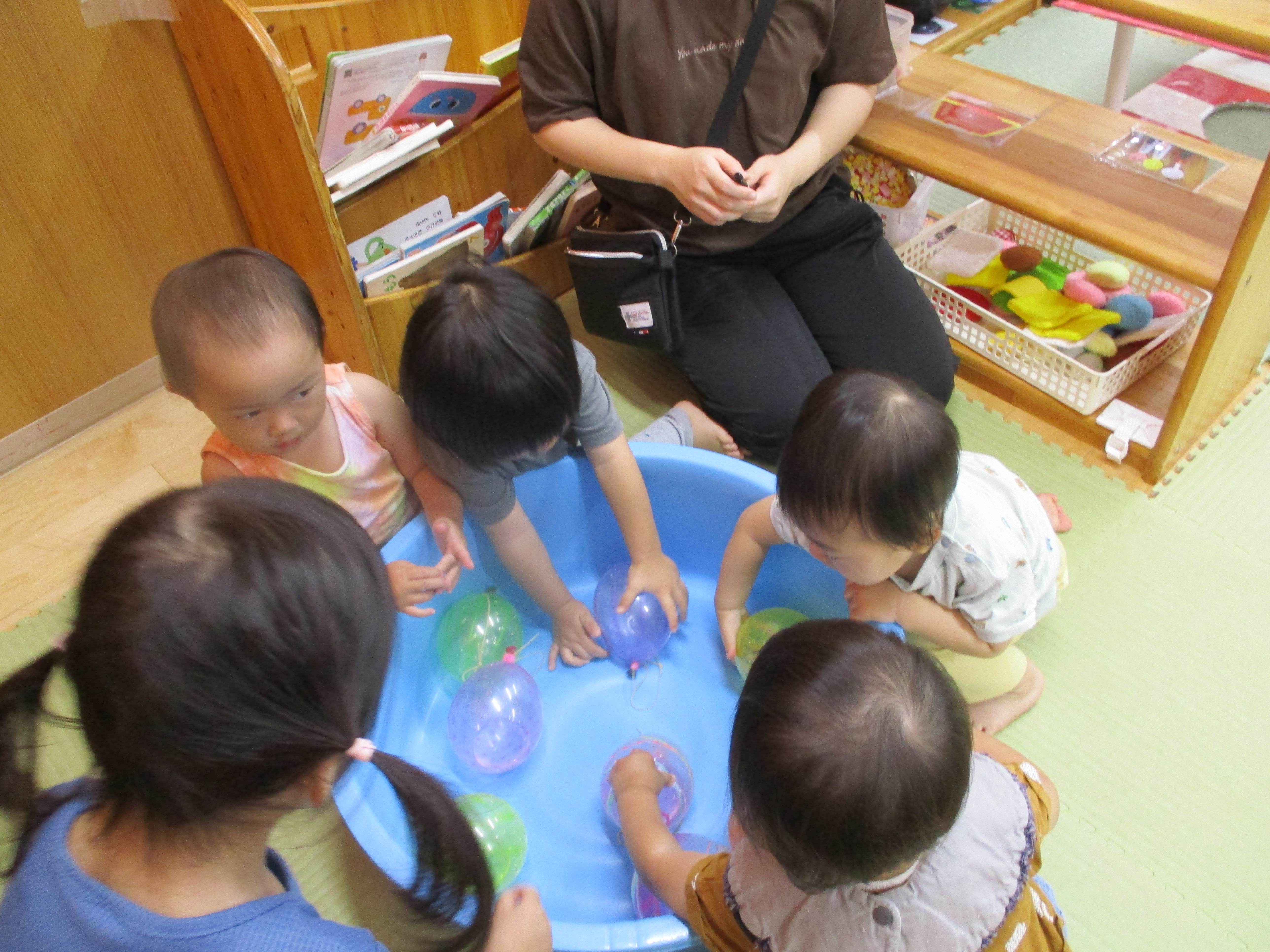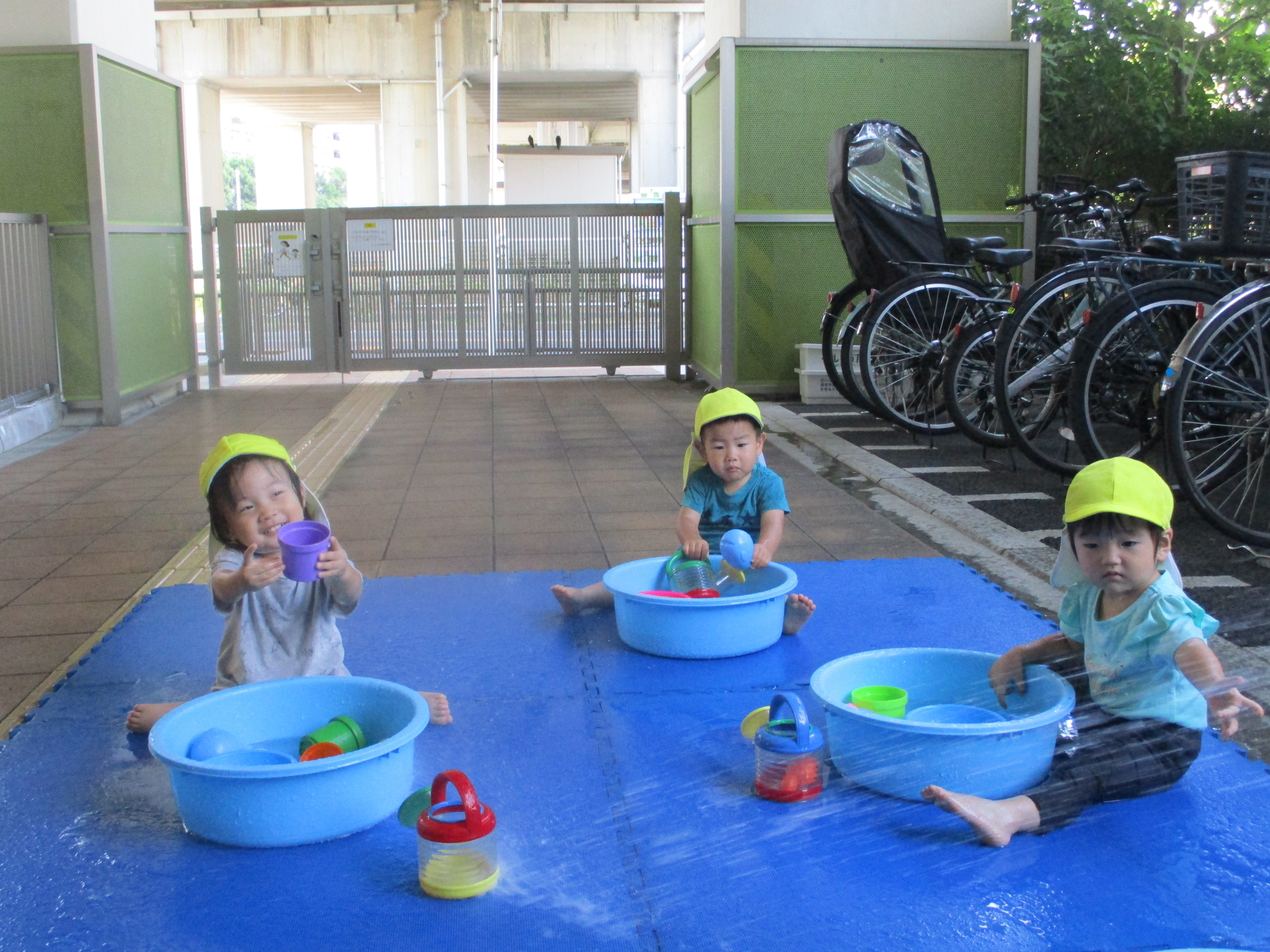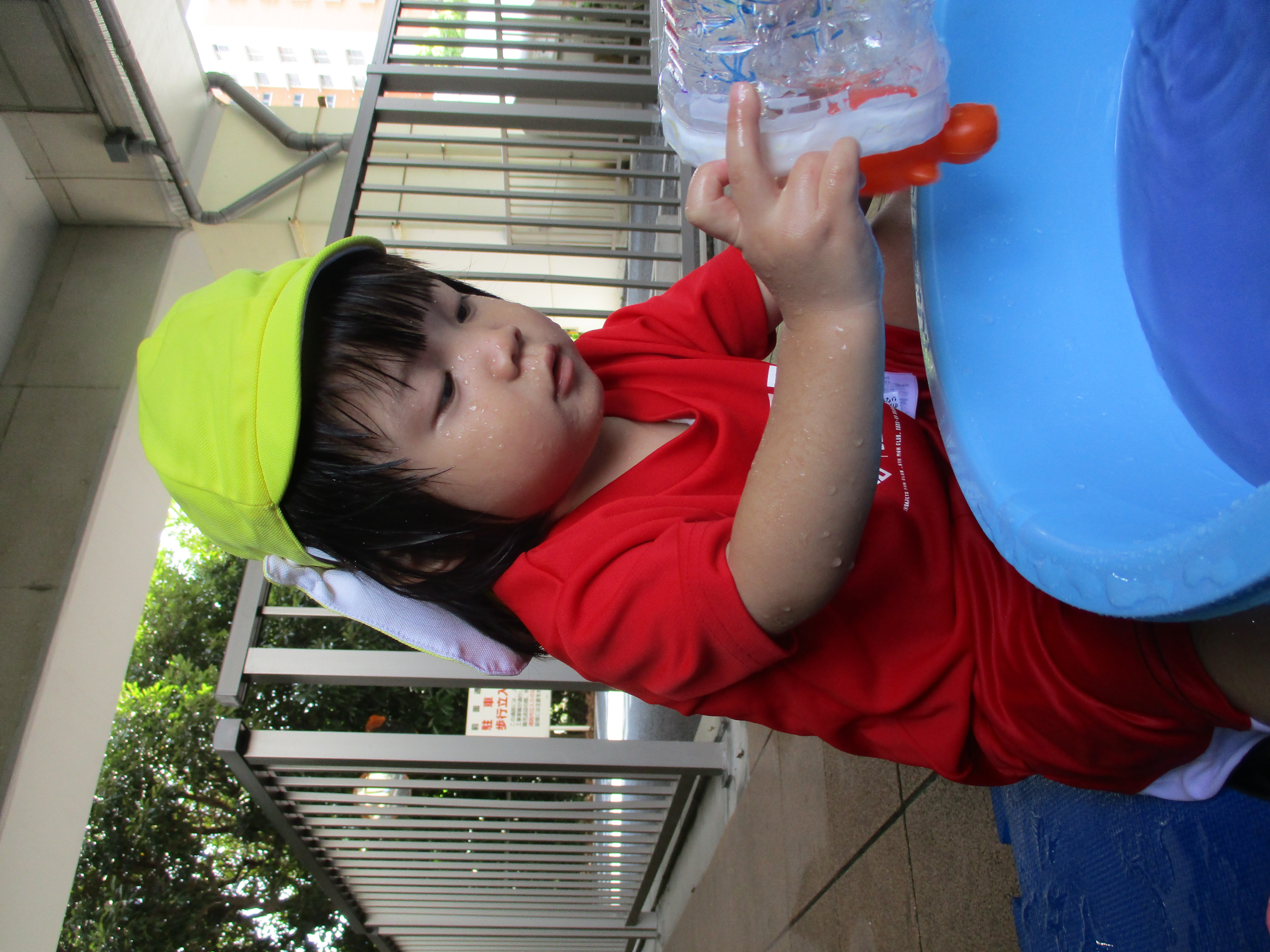 7月に比べ、沢山水の活動を行うことができました。「今日は、水遊びの日だよ」と伝えたり、水の活動の前に行う❝元気イチバンバン❞を流したりすると嬉しそうにするこどもたち。容器に水を入れ自分で腕や足にかけたり保育者に水をかけて貰ったりして水に濡れることを楽しんでいました。氷や色水などにも触れました。「つめたい」と冷たさを感じたり「あお、あか」と色を選んでジュースに見立てたりして遊びました。