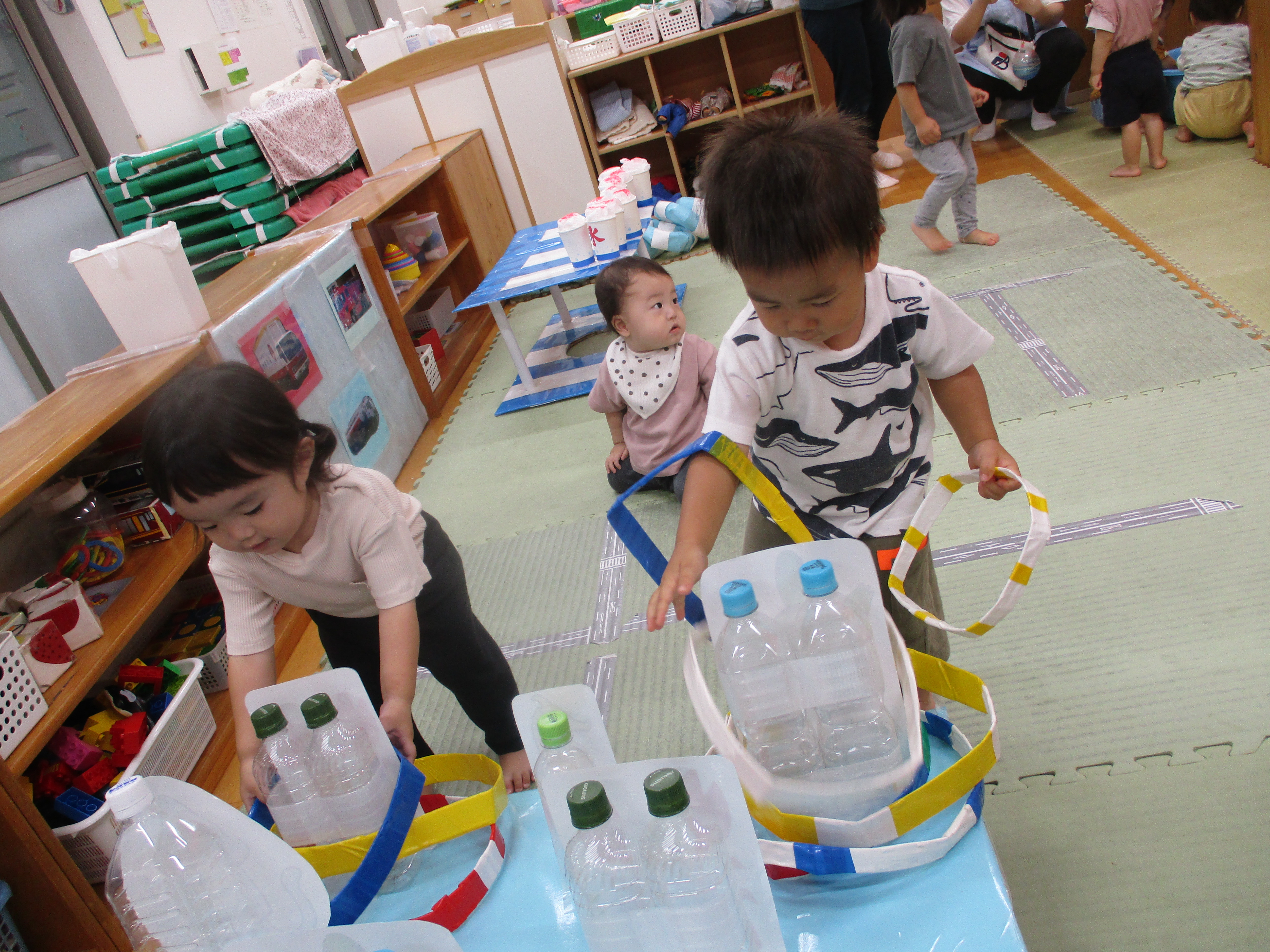 <夏祭り>日中の活動で、たまご組さんと一緒に夏祭りをしました。ヨーヨーや輪投げ、虫捕りなどをしました。ヨーヨーでは何色にしようかなと真剣に選んでいたり、捕まえた虫を虫かごに入れるのを嬉しそうにして行ったりしました。「えい」と言いながら的にめがけて輪投げも楽しんでいましたよ。