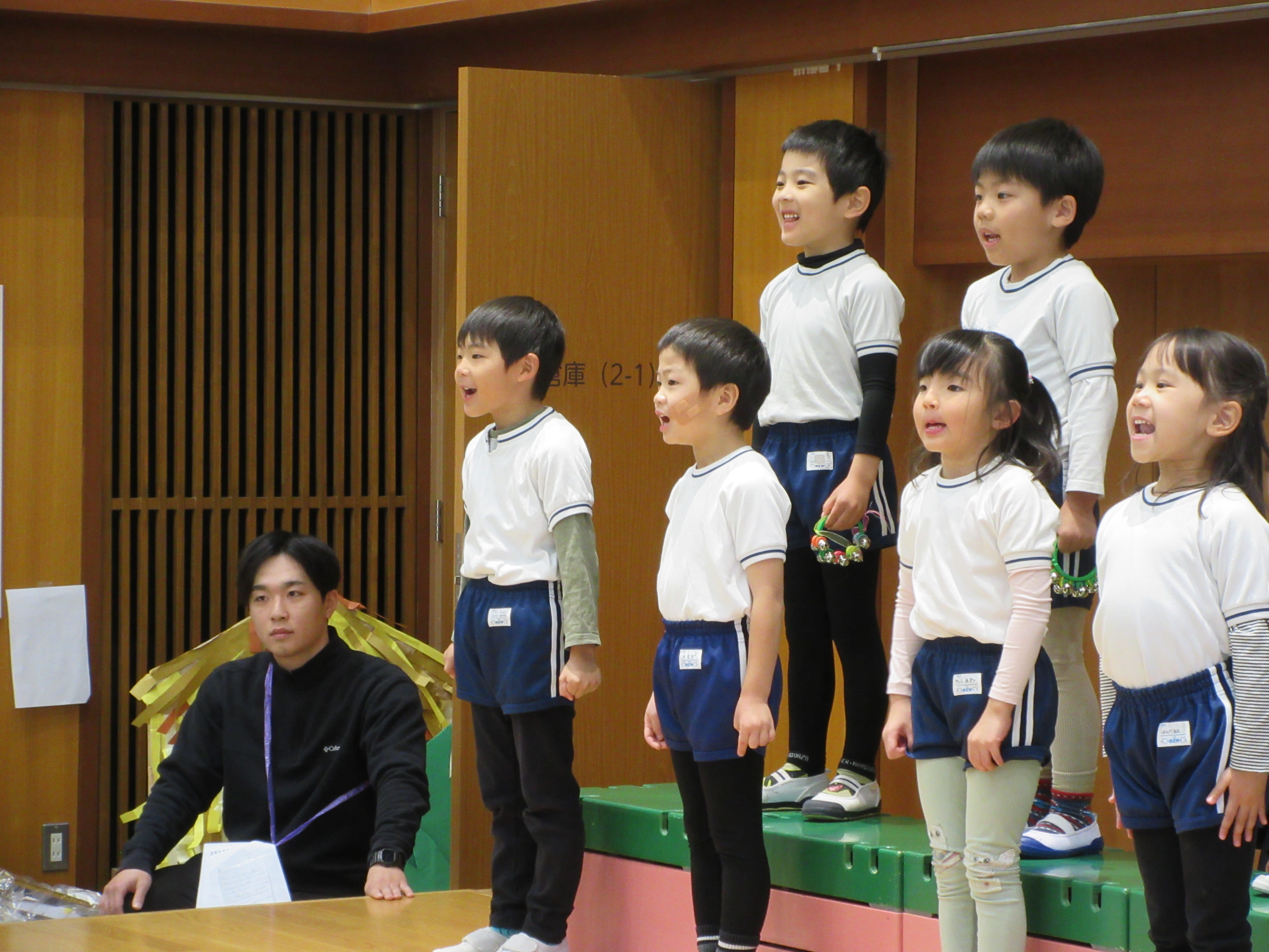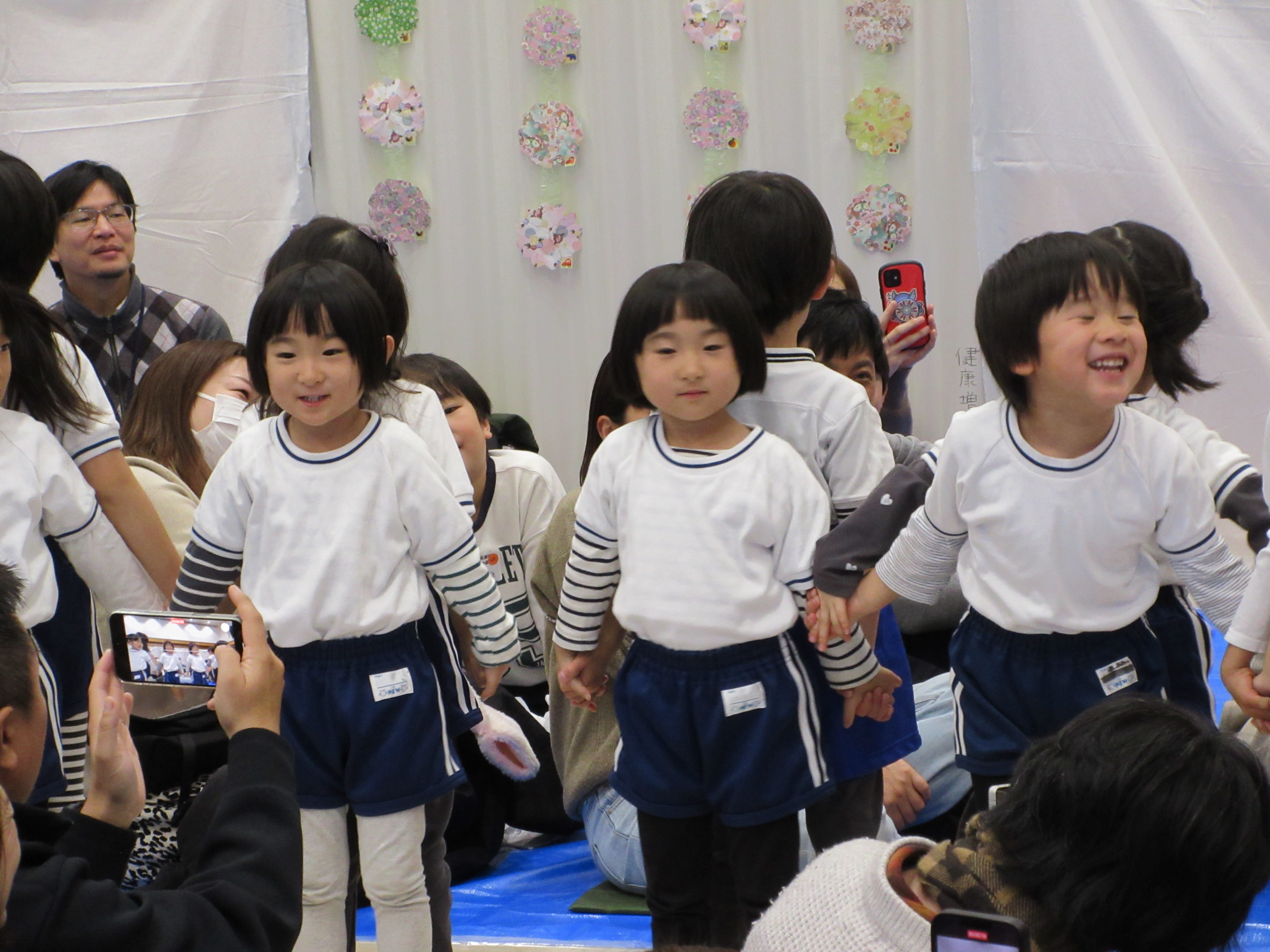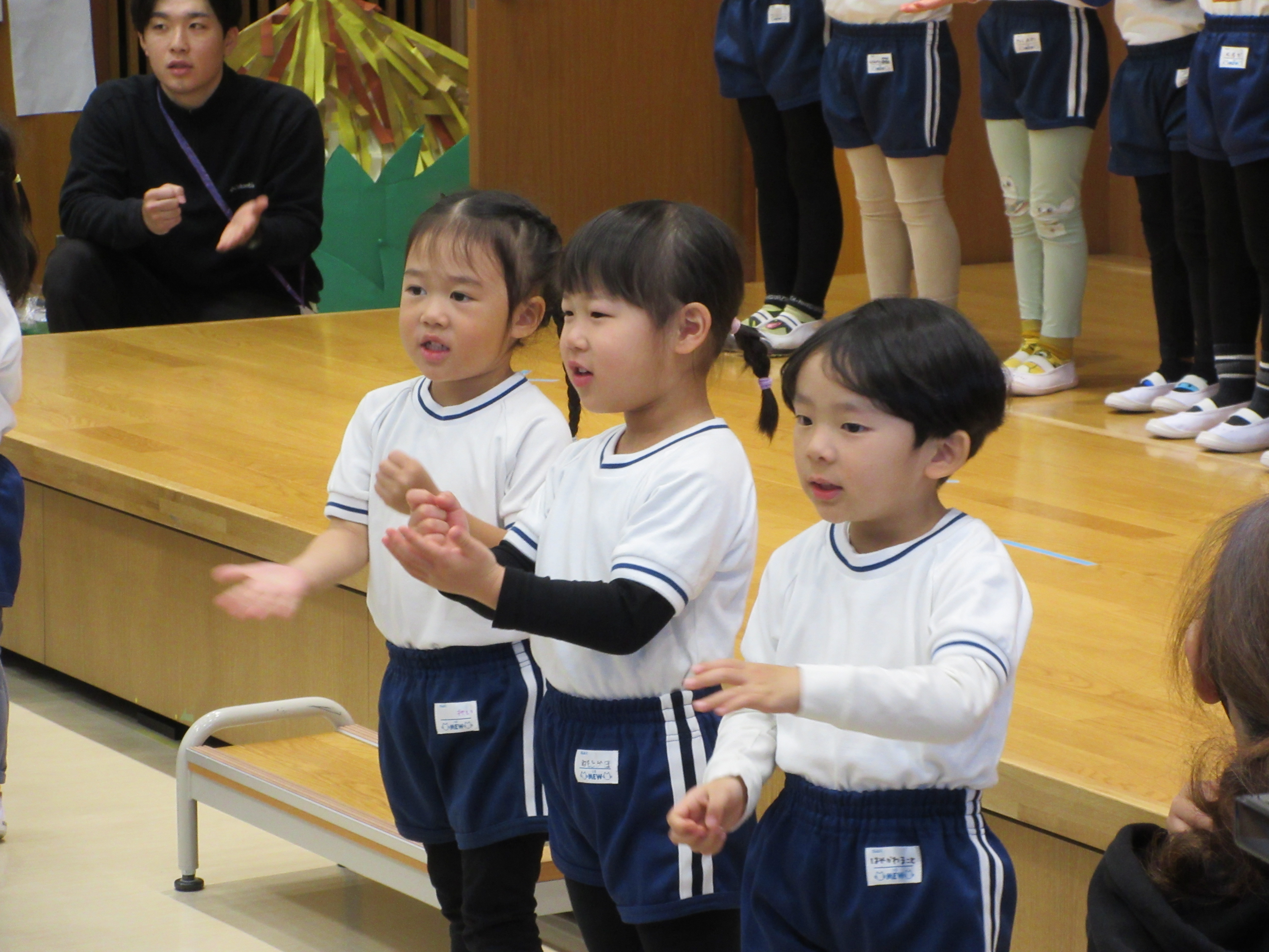 集まりの場で普段から遊んでいることもあり、笑顔で楽しみながら発表している姿がどの学年でも見られました。なべなべそこぬけは、ペアの子と回る方向を合わせることに苦戦している様子が見られましたが、何度か遊んでいくなかで自然と気持ちが合うようになっていきました。5歳児の詩は、言葉の意味を一緒に考えながら取り組んでいき、本番も丁寧に詩を詠むことができて良かったです。
