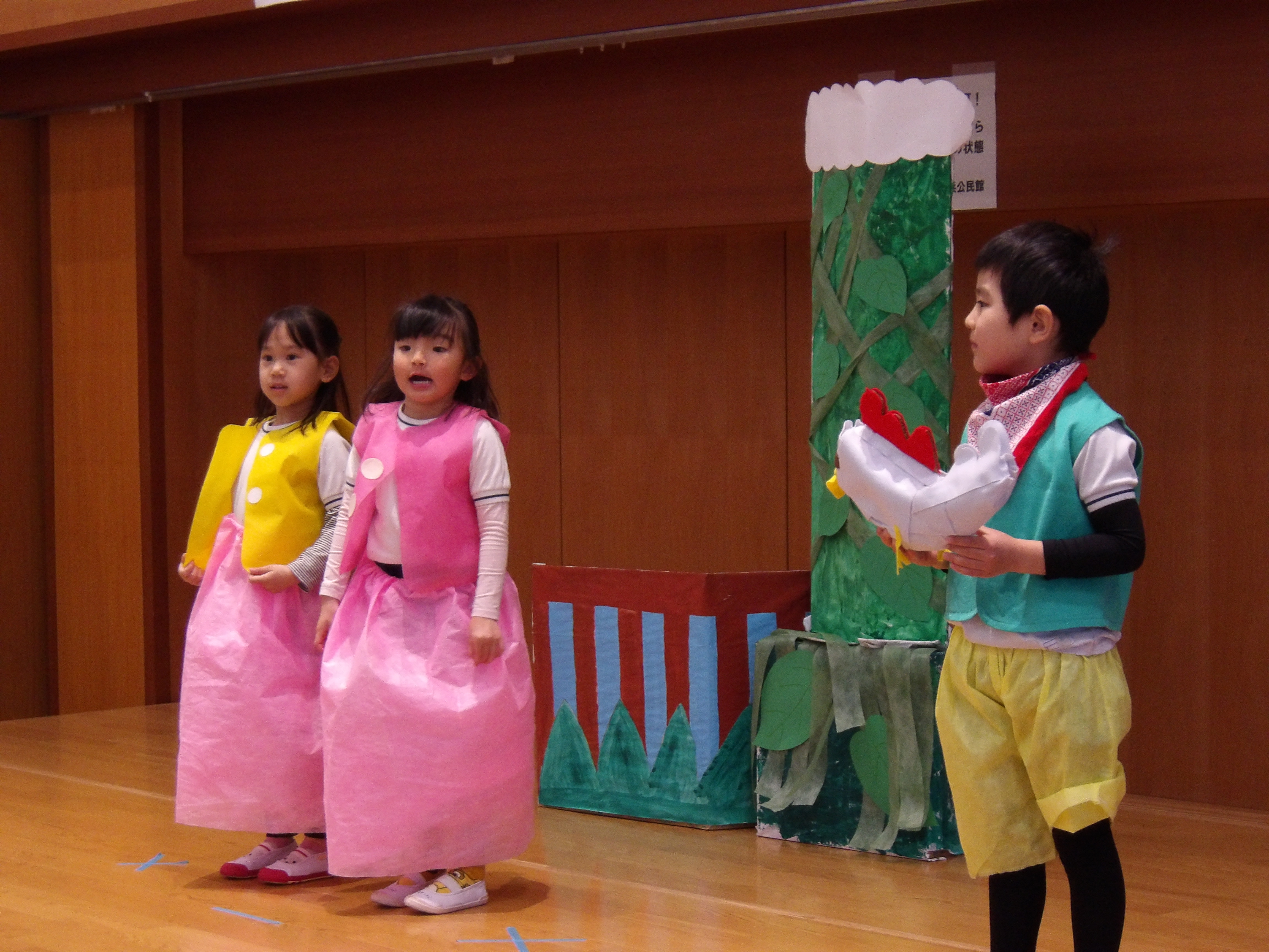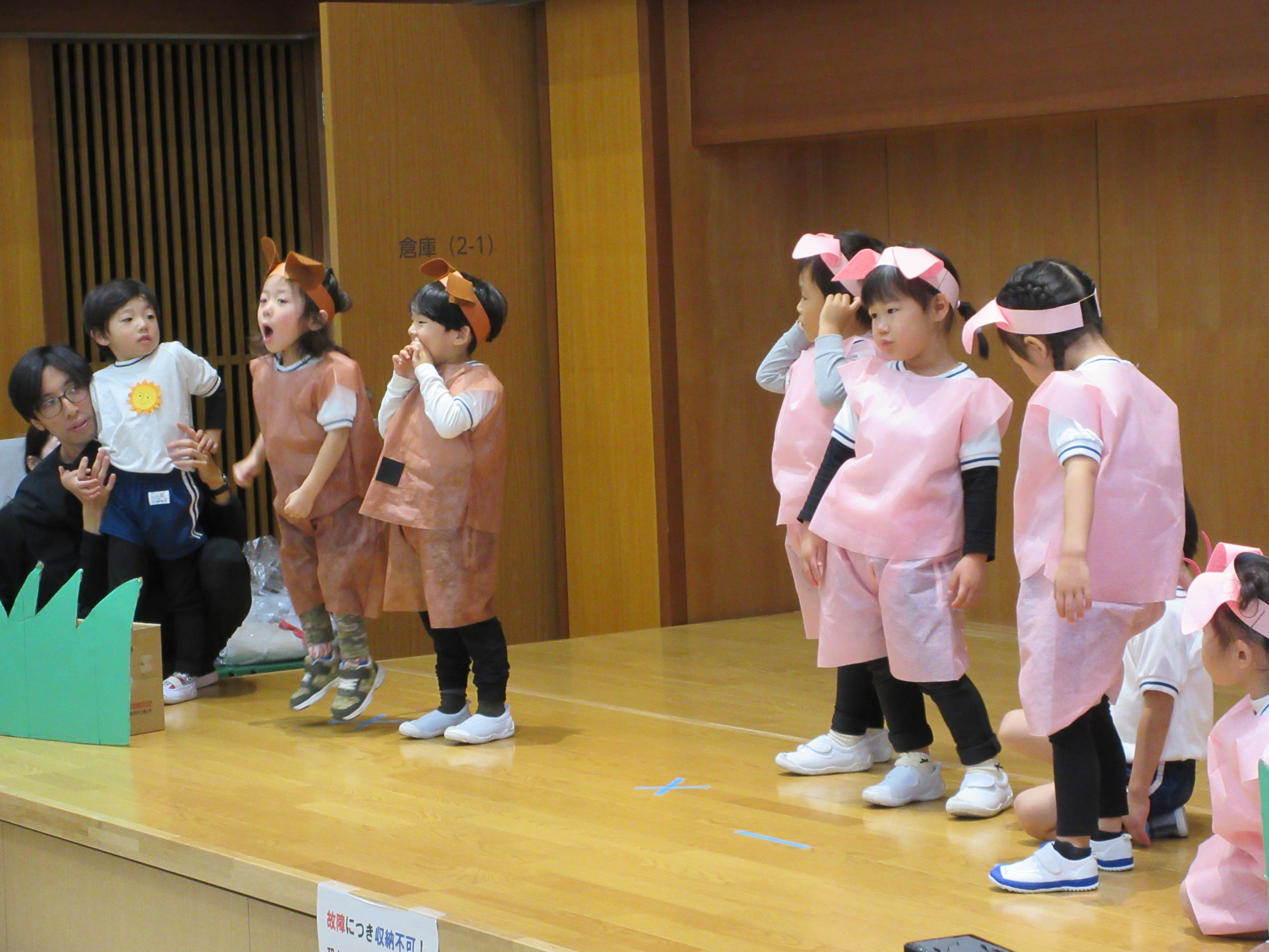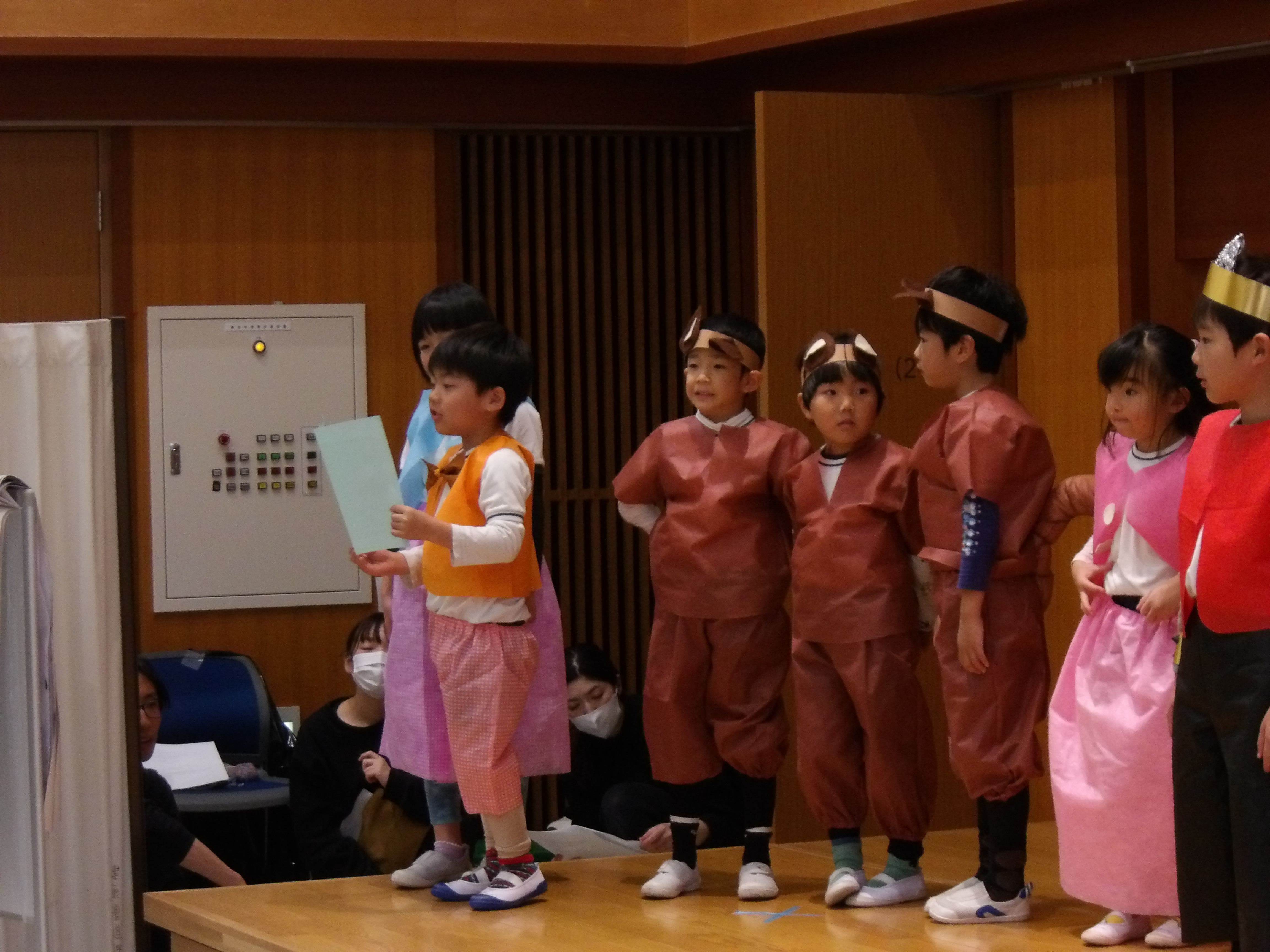 遊びながら「めっきらもっきら」と皆で歌う等、楽しんでくれていた4歳さんです。取り組み中は、忘れたセリフを教え合う、優しい場面が何度も見られました。当日には「全然緊張してないよ」と、頼もしい姿がありました。時々甘えながらも、しっかり大きな声で発表しようとする姿に成長を感じました。