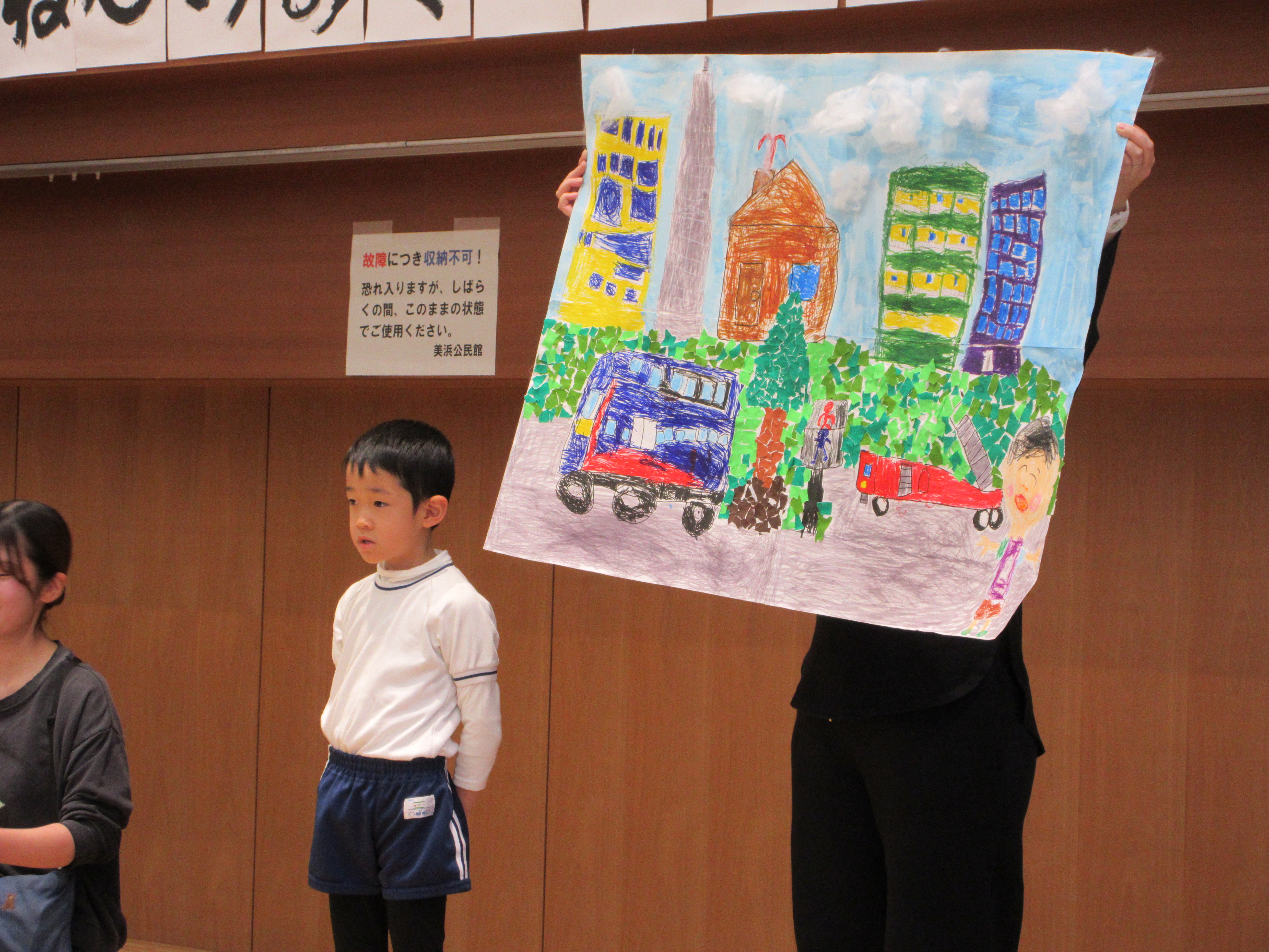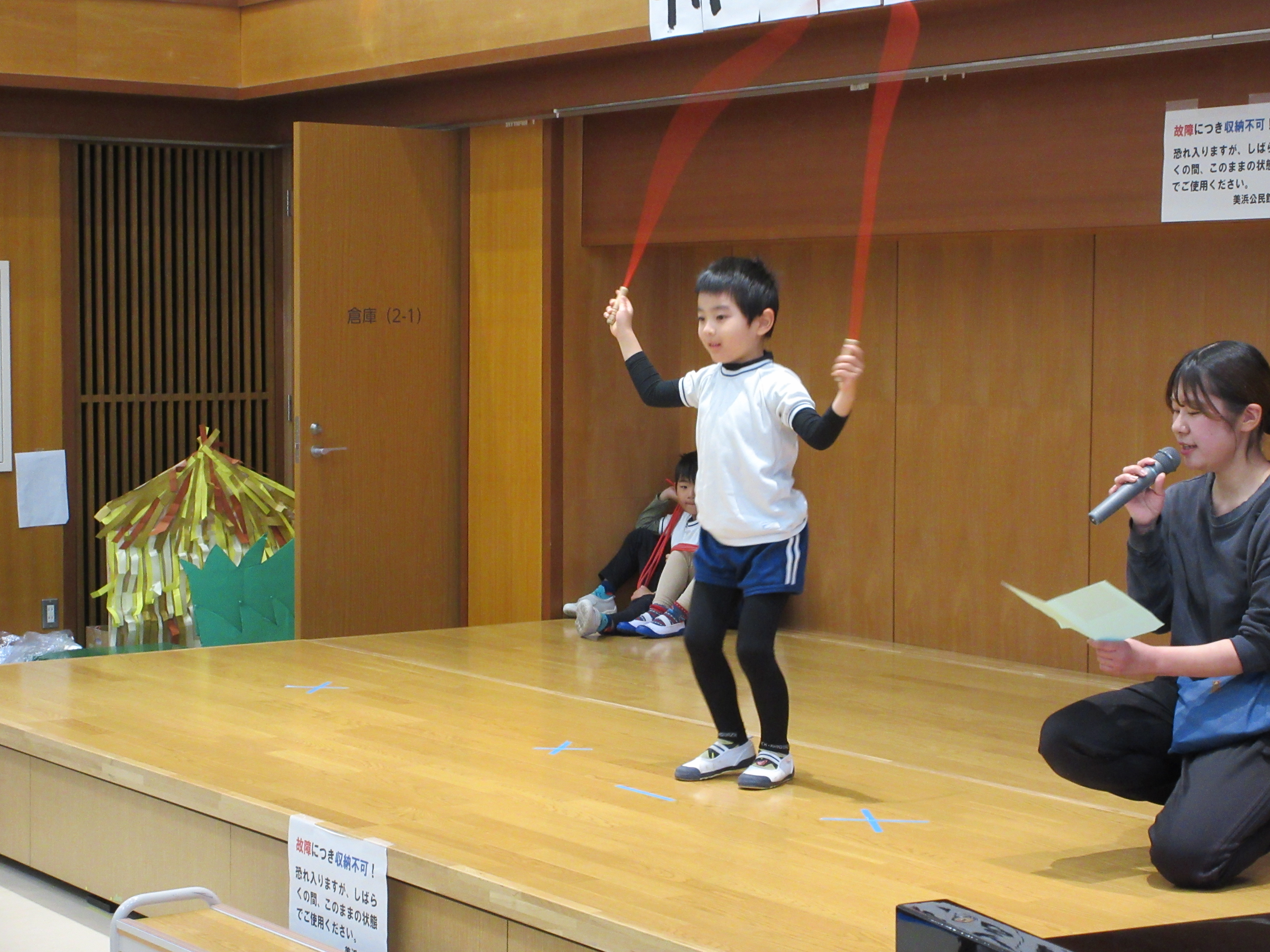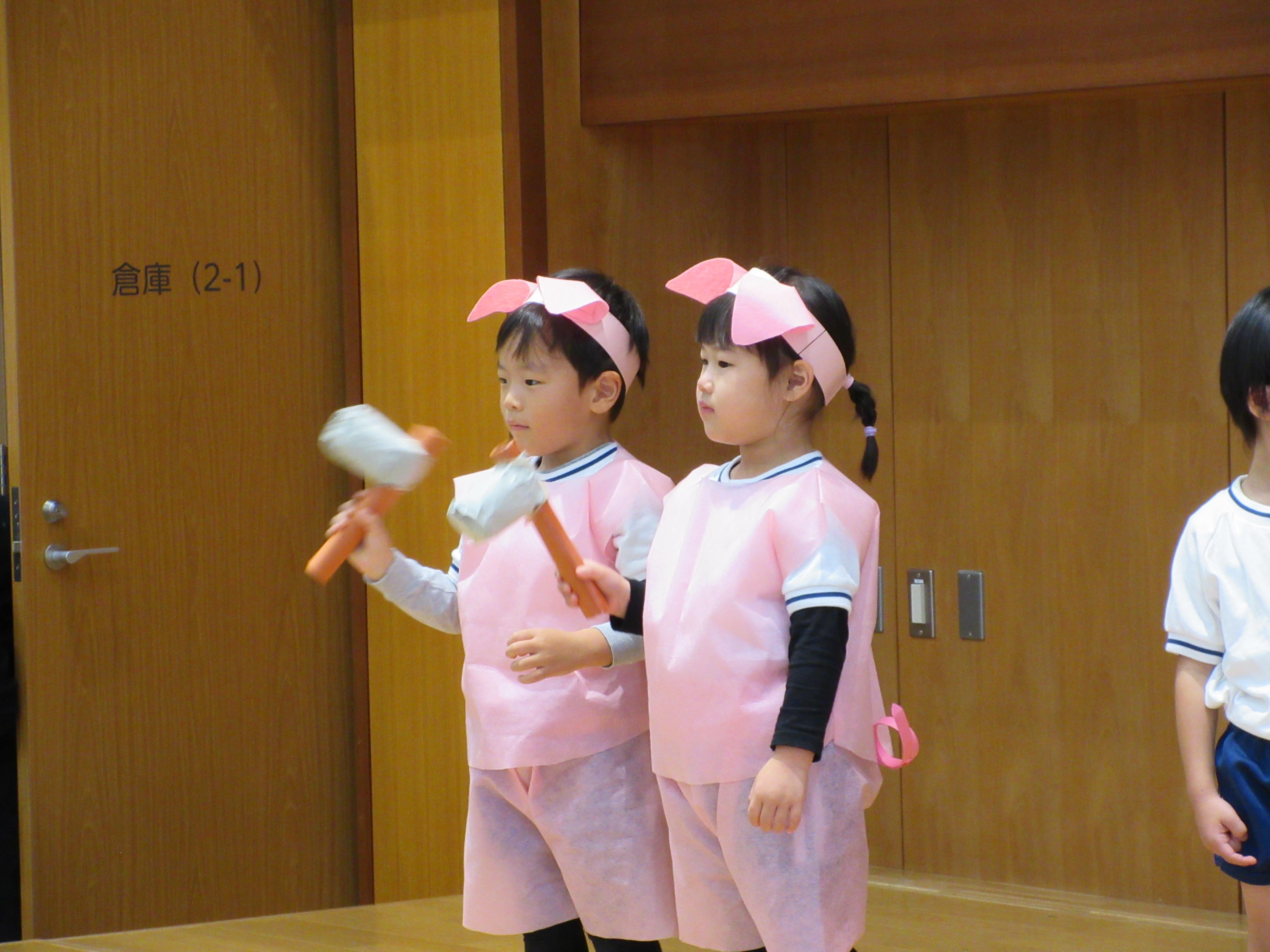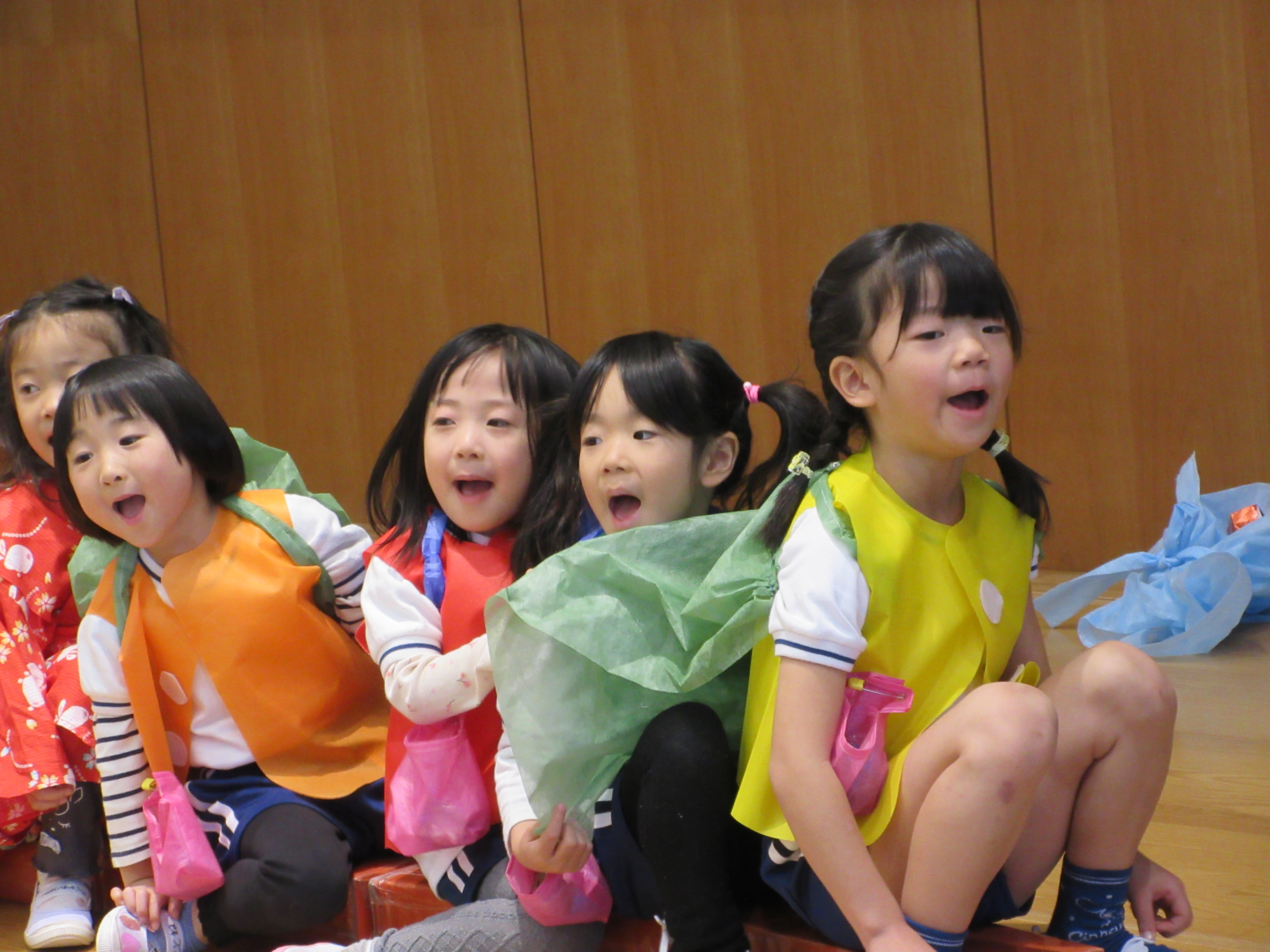 遊びながら「めっきらもっきら」と皆で歌う等、楽しんでくれていた4歳さんです。取り組み中は、忘れたセリフを教え合う、優しい場面が何度も見られました。当日には「全然緊張してないよ」と、頼もしい姿がありました。時々甘えながらも、しっかり大きな声で発表しようとする姿に成長を感じました。
