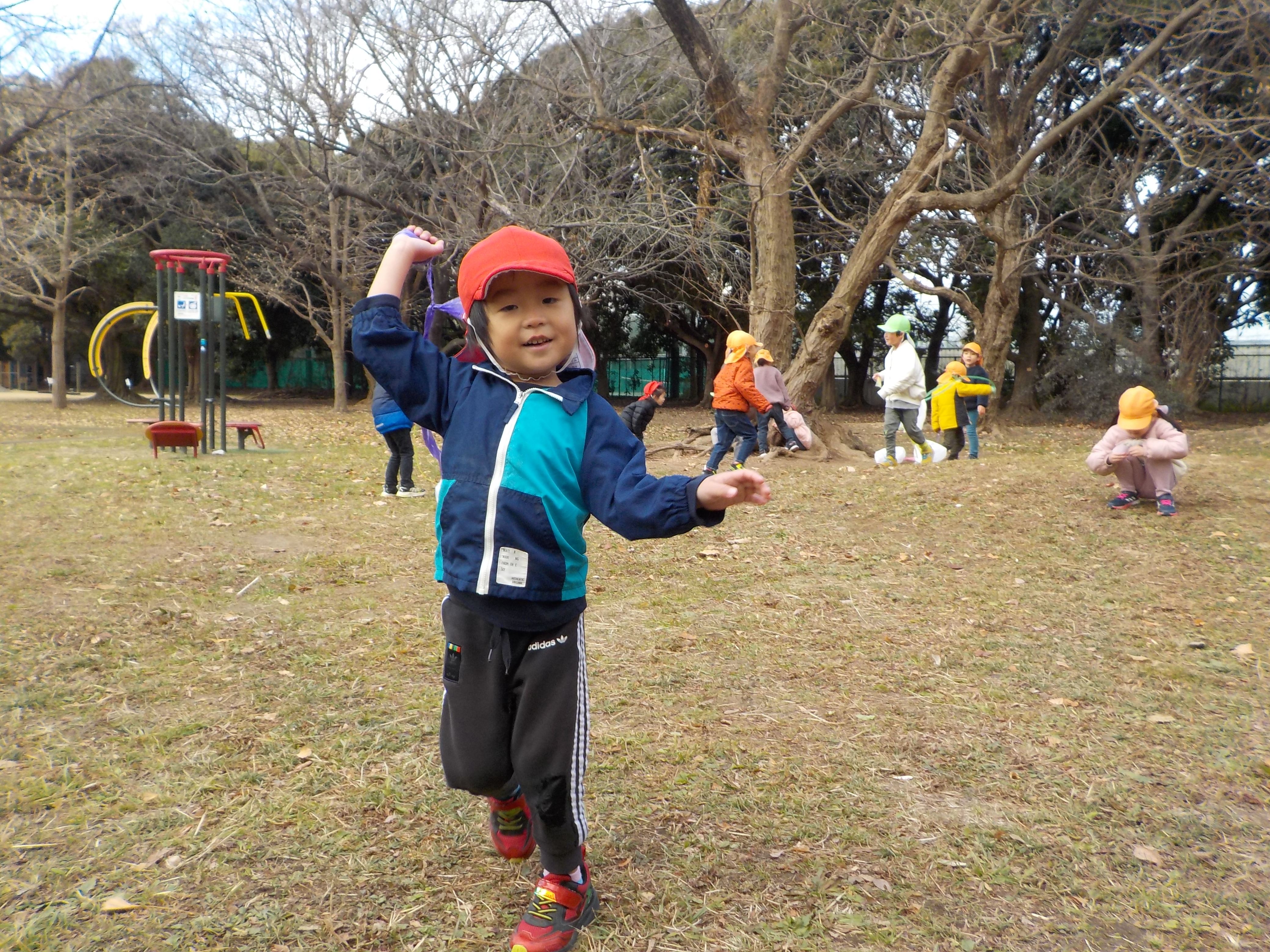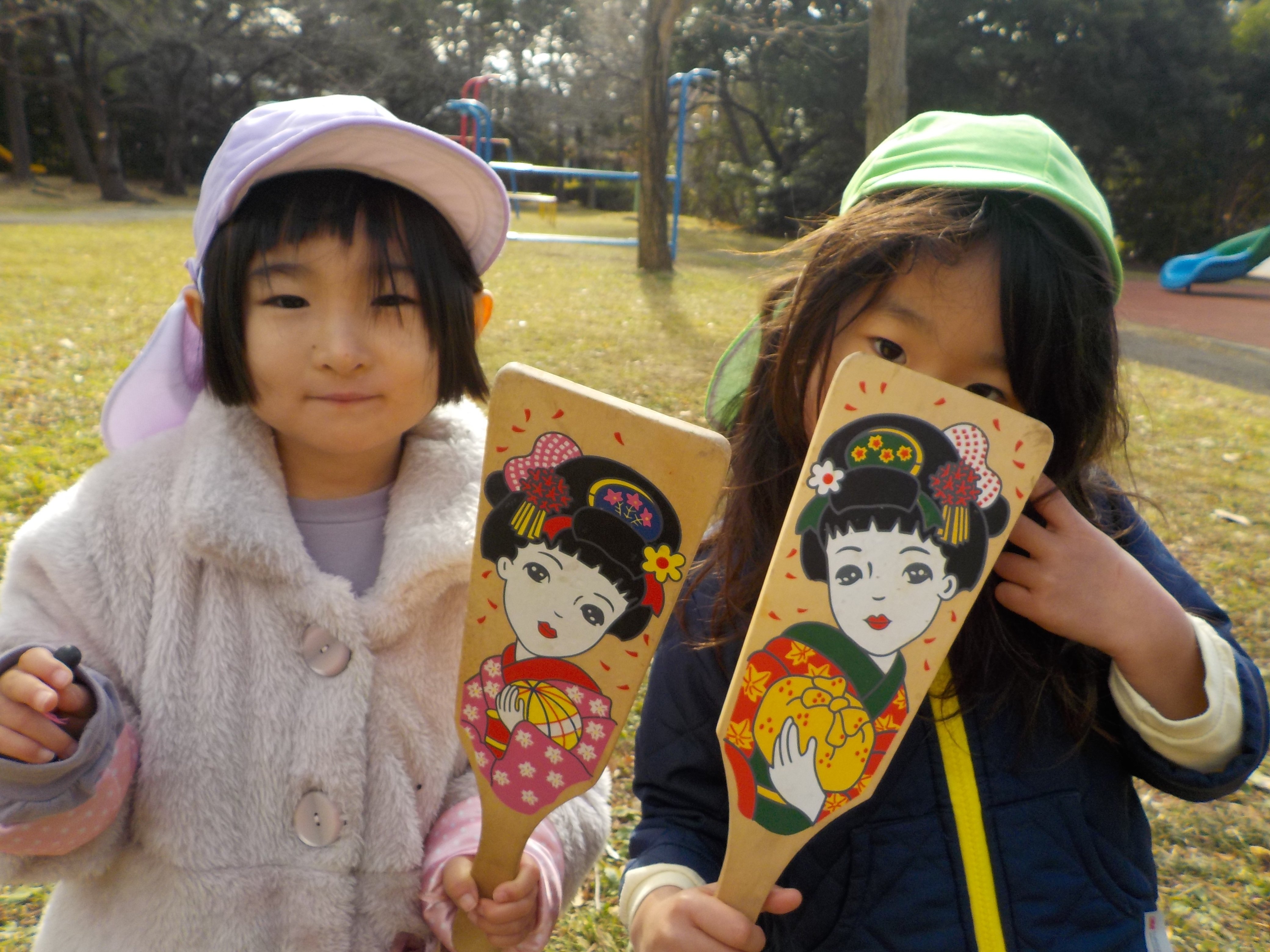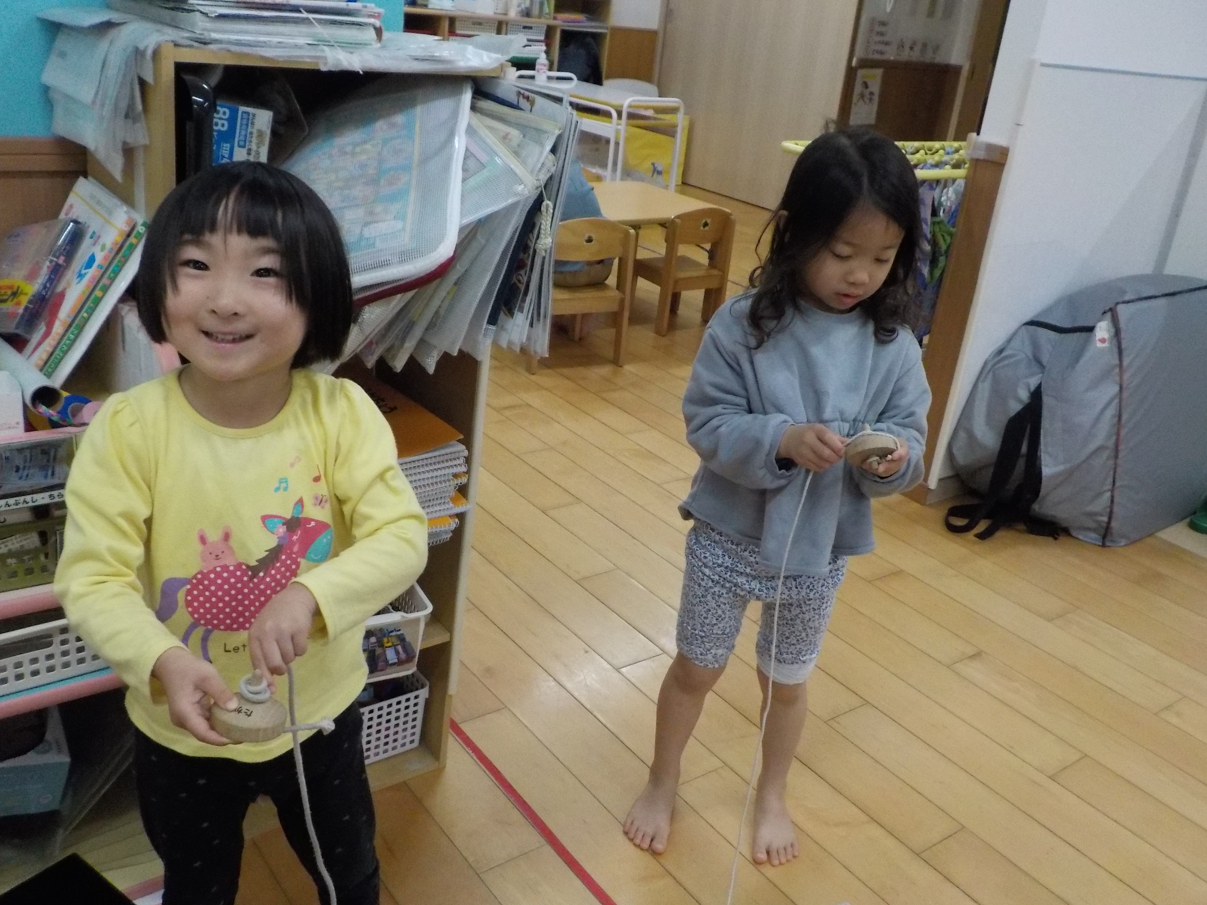 新しい年が始まり、一段と寒さを感じる頃となりましたが、きりん組のこどもたちは変わらず元気に過ごしています。戸外では、はねつきや手作りのたこあげ、室内ではこま回しなどの、正月ならではの遊びを楽しむ姿が見られました。コツを掴むまでは友だちや保育者と一緒に工夫しながら繰り返し遊び込んでいました。