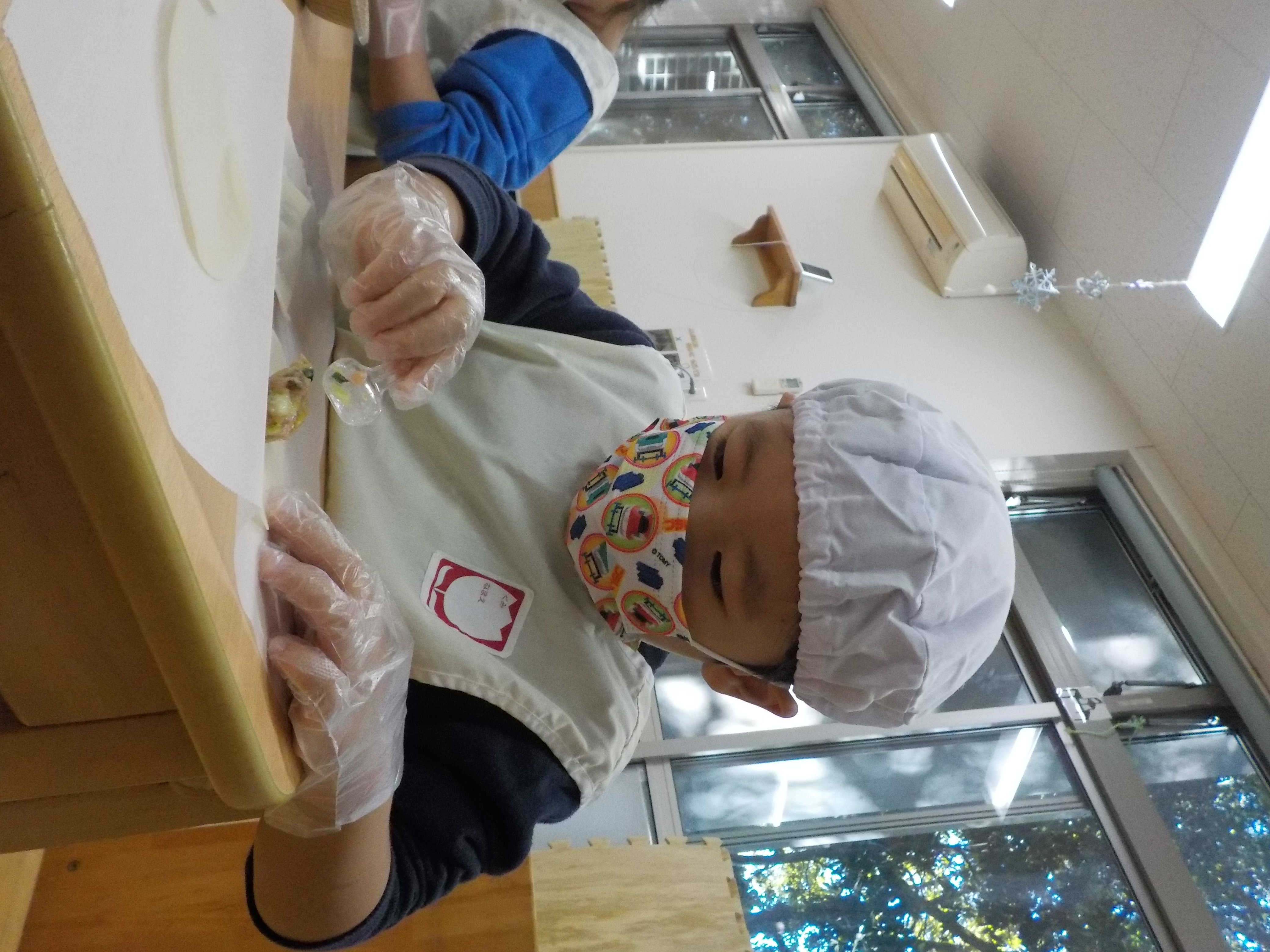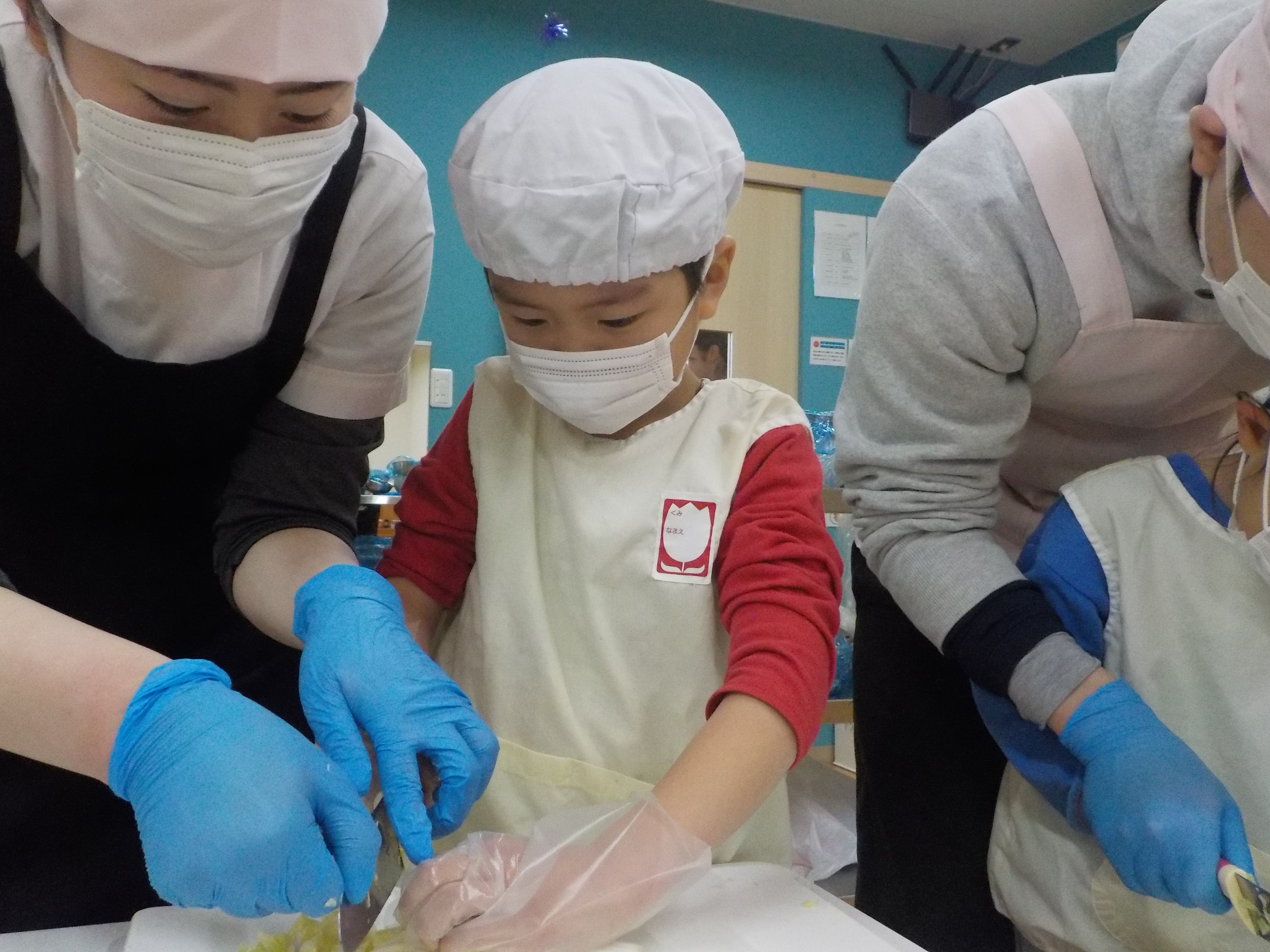 クッキングの餃子作りでは、5歳児は包丁を使って、餃子に包むキャベツや白菜などの具材を大人と一緒に切りました。初めて包丁を扱う子も多く、持ち方や食材を押さえる手の形など、栄養士に教わりながら切っていきました。堅い部分は切るのが難しかったようですが、ざくざくとした切る感触が心地良かったようです。「もっとやりたい!」と話す姿も見られました。