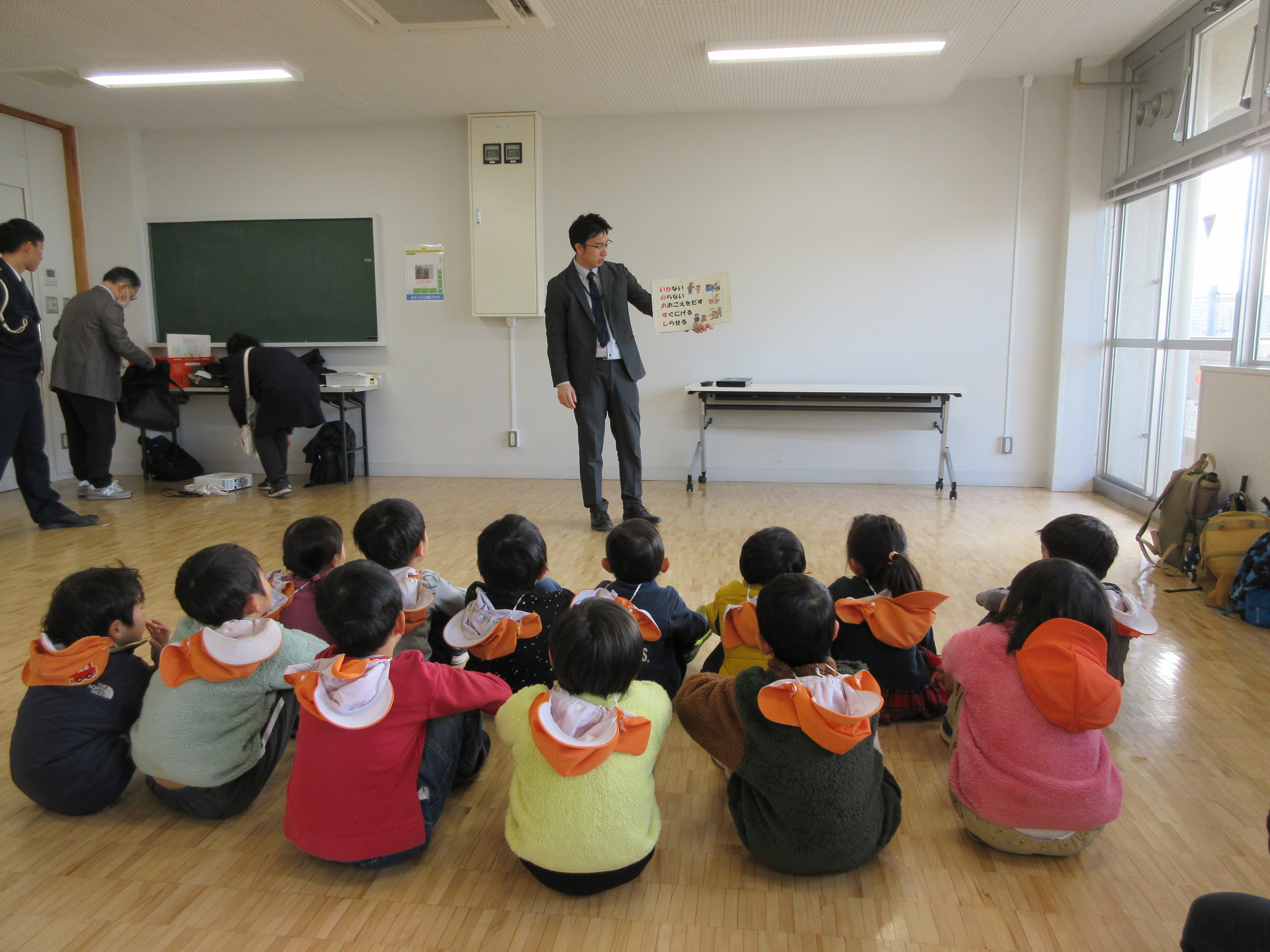 1月28日(火)にまちづくり活動プラザにて、5歳さんが交通安全防犯教室に参加してきました。小学校に進学する前に「交通安全」と「防犯」について、警察署の方、浦安市役所の方からお話をしていただきました。始めに防犯についてのDVDを鑑賞し、怪しい人に会ったらどうするか、どう動けばいいか等を教えていただきました。DVDを観ながら友だちと「こうするんだよね」と確認し合う姿も見られました。