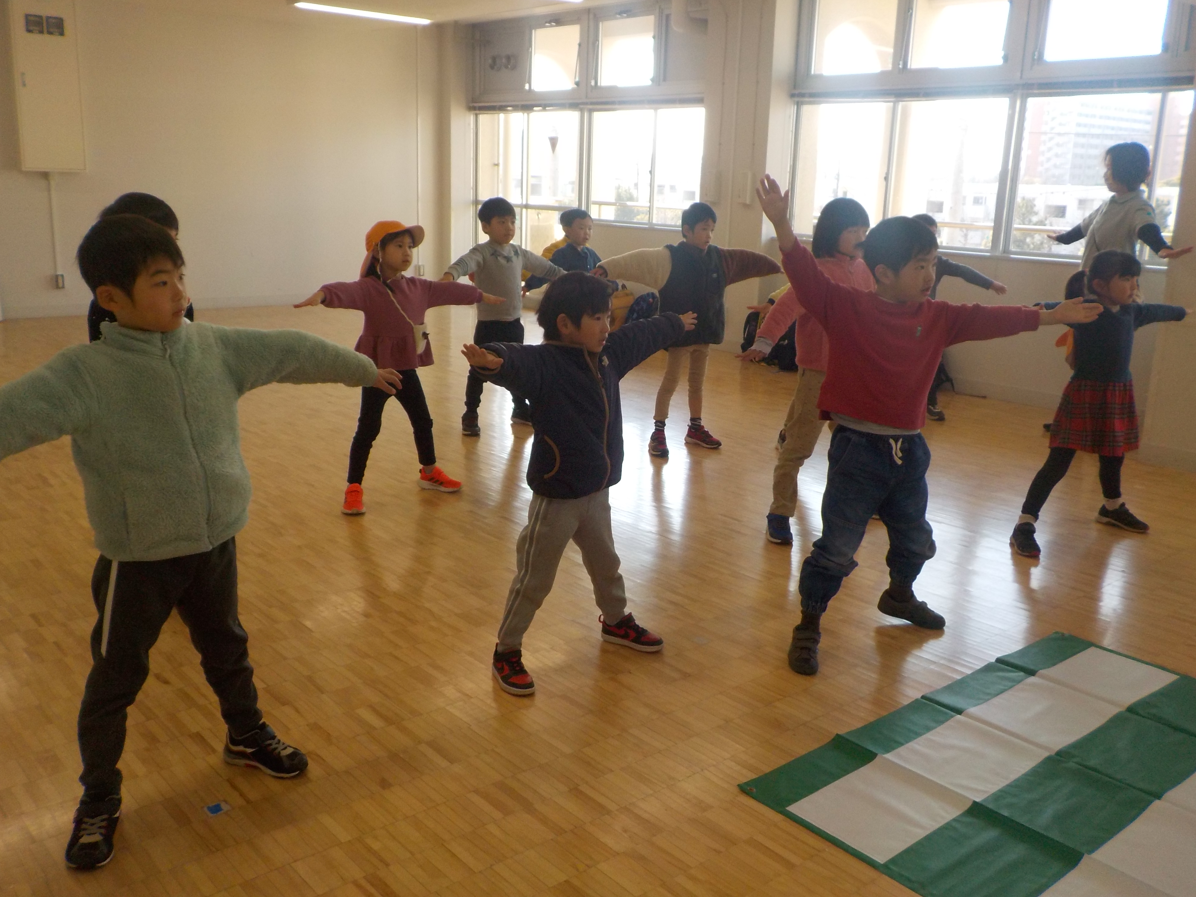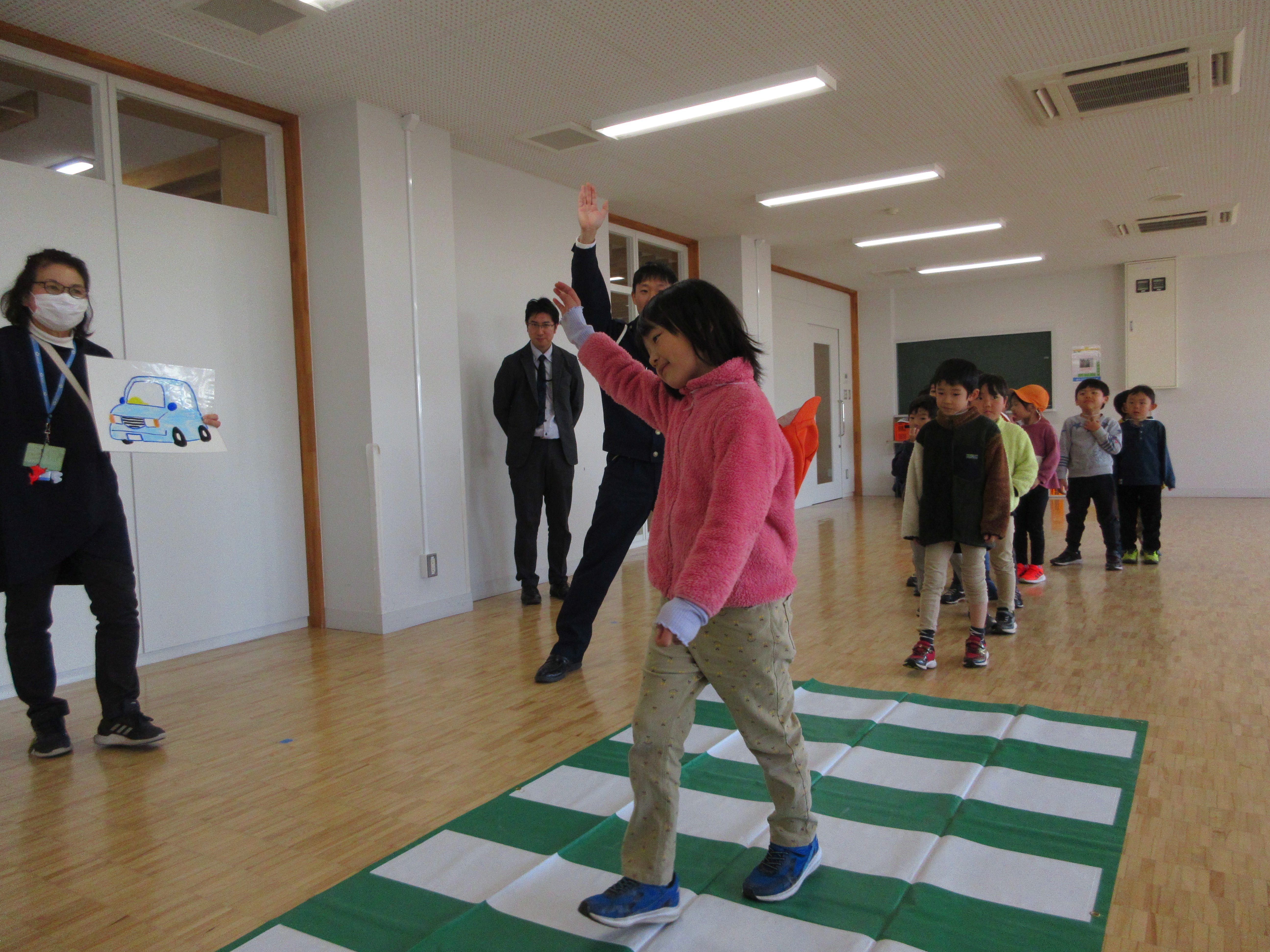 次に交通安全についてのお話を聞きました。横断歩道を渡る前に信号が点滅した時と渡っている途中に点滅した時で動きが違っていたり、同じ渡っている途中でも自分がいる場所によって動きが違っていたり、今まで知らなかったこともあったのでとても真剣に聞いていました。その後は信号を渡る前にすることをリズムに乗せて体操で確認しました。以前参加した交通安全出動式でも行ったので、覚えている友だちも多かったです。