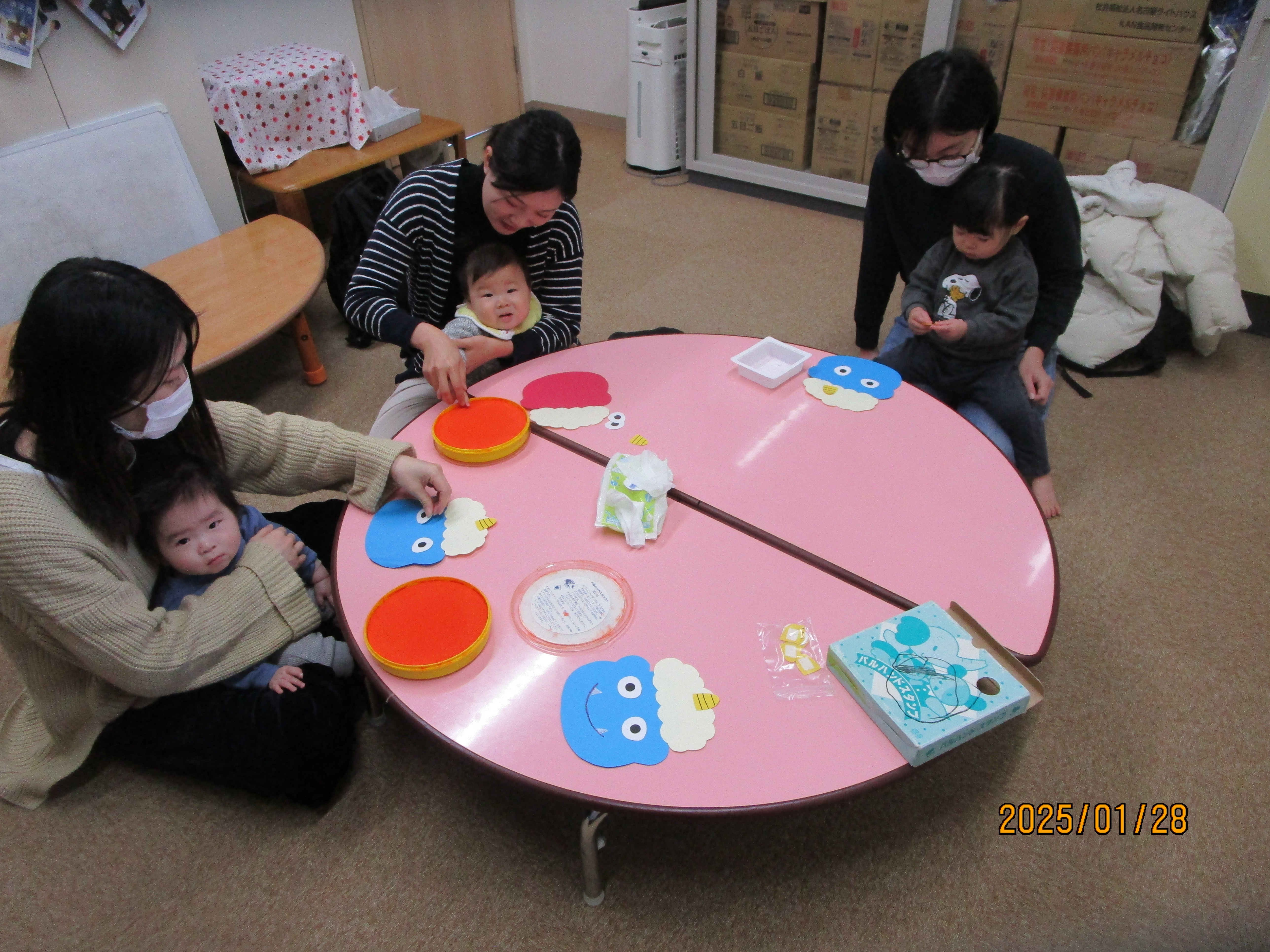 1月28日に子育て支援で節分製作を行ないました。保護者の方と一緒に指スタンプやシール貼りをして、鬼の顔を作りました。初めての感触に不思議そうにしている子やシール貼りに夢中で色々なシールを貼って楽しんでいましたよ。