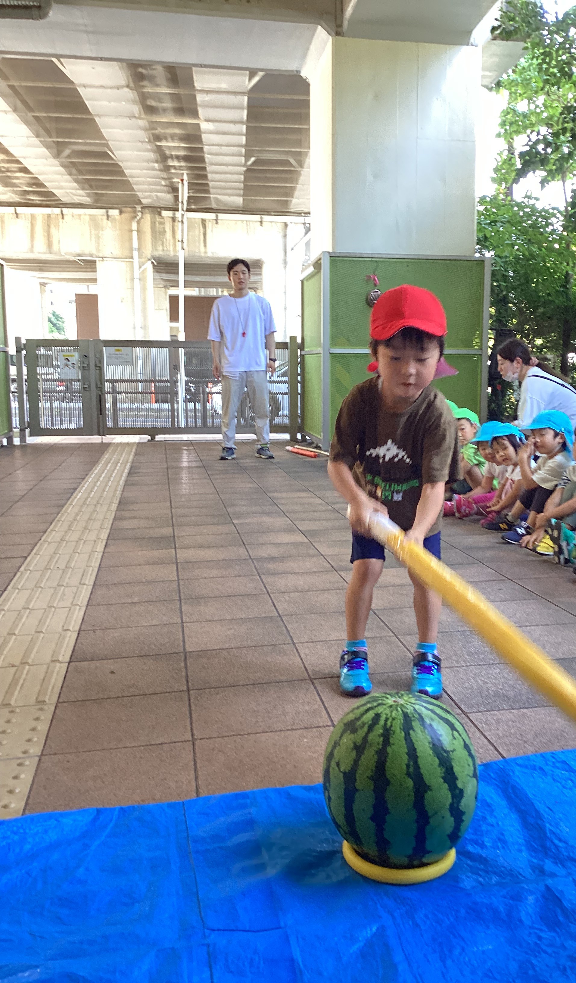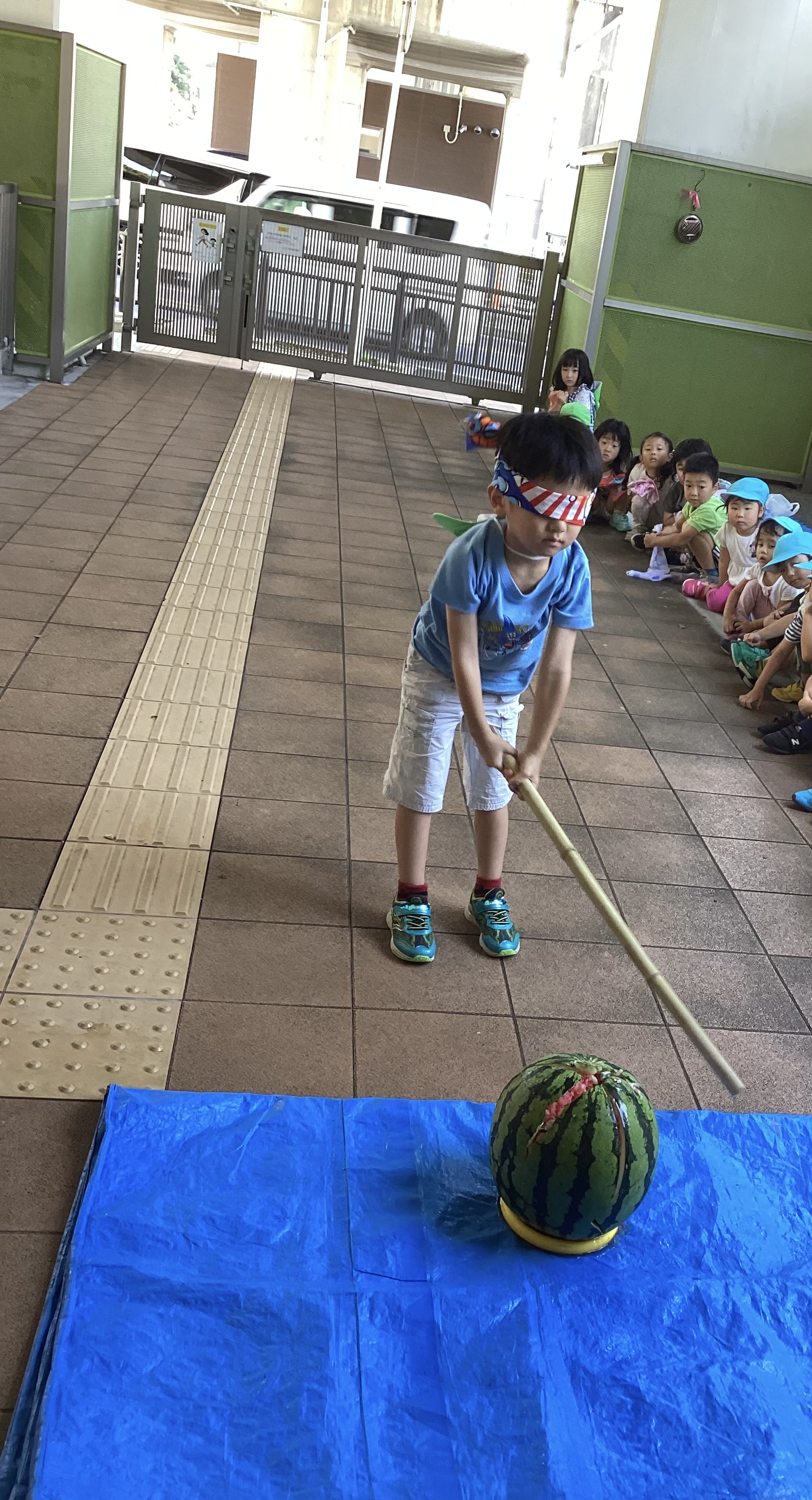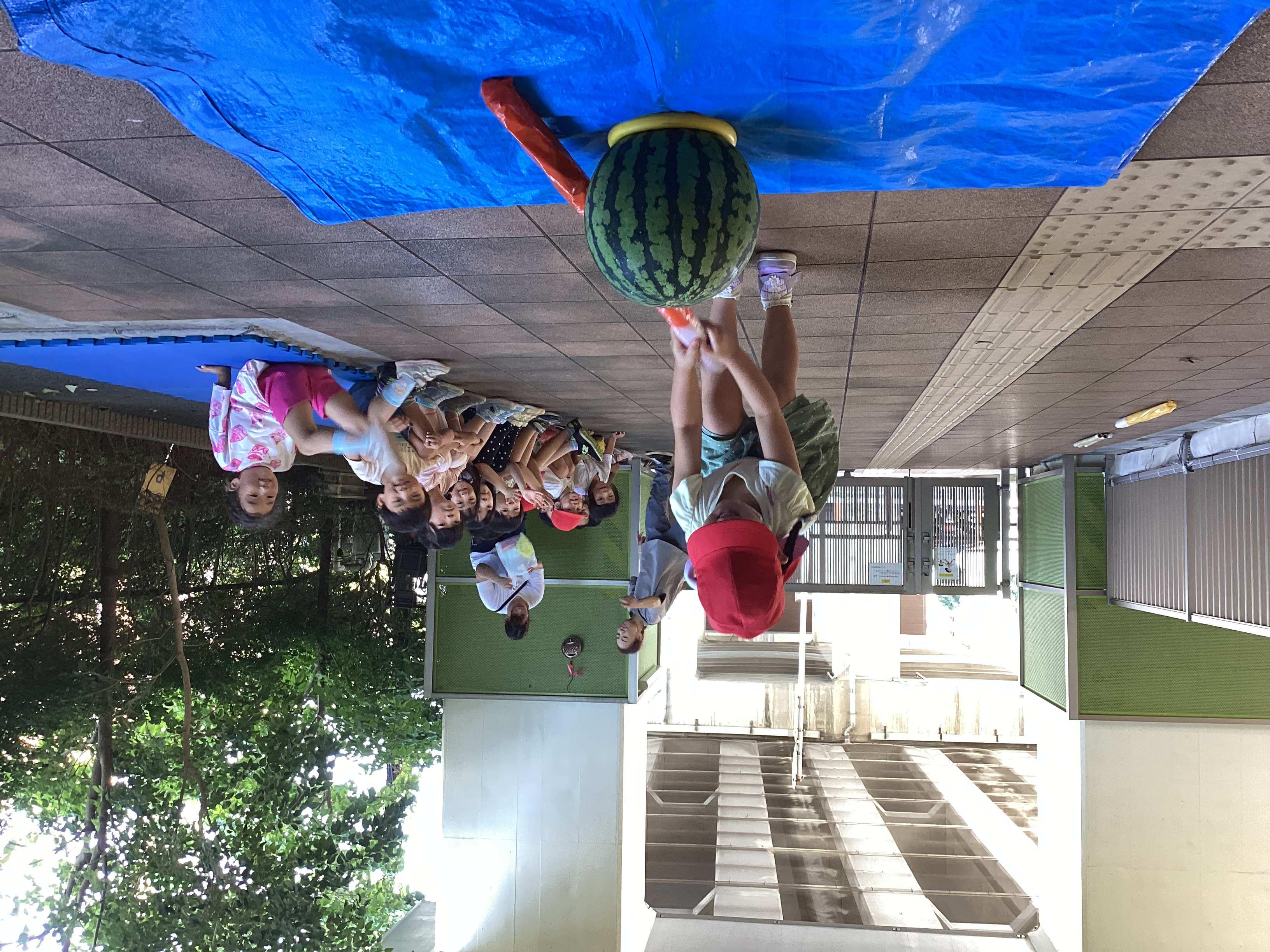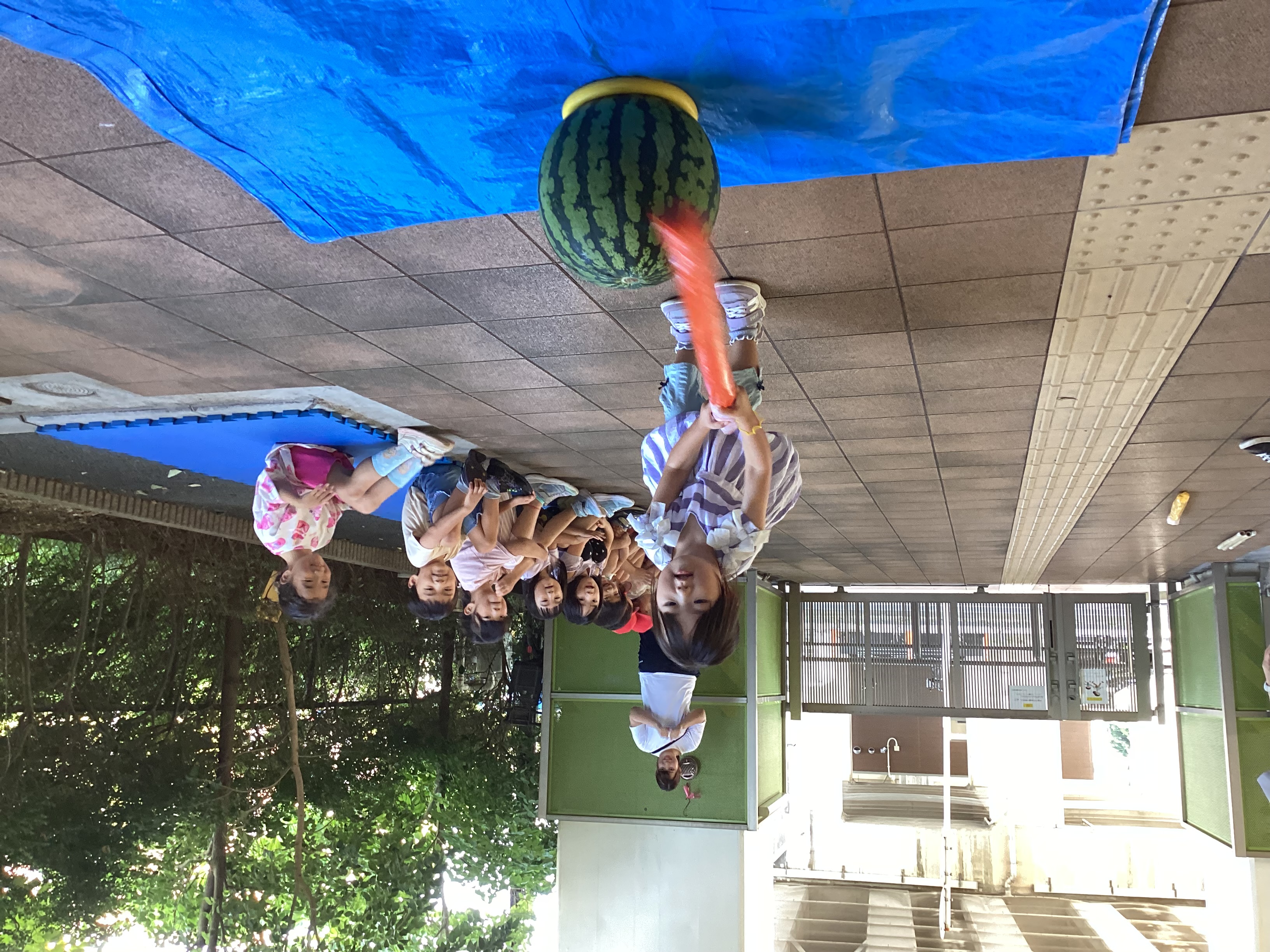 今年も7月25日にすいか割りを行いました。3.4歳児さんは新聞紙の棒、5歳児さんは竹の棒を使い一人ずつ挑戦しました。