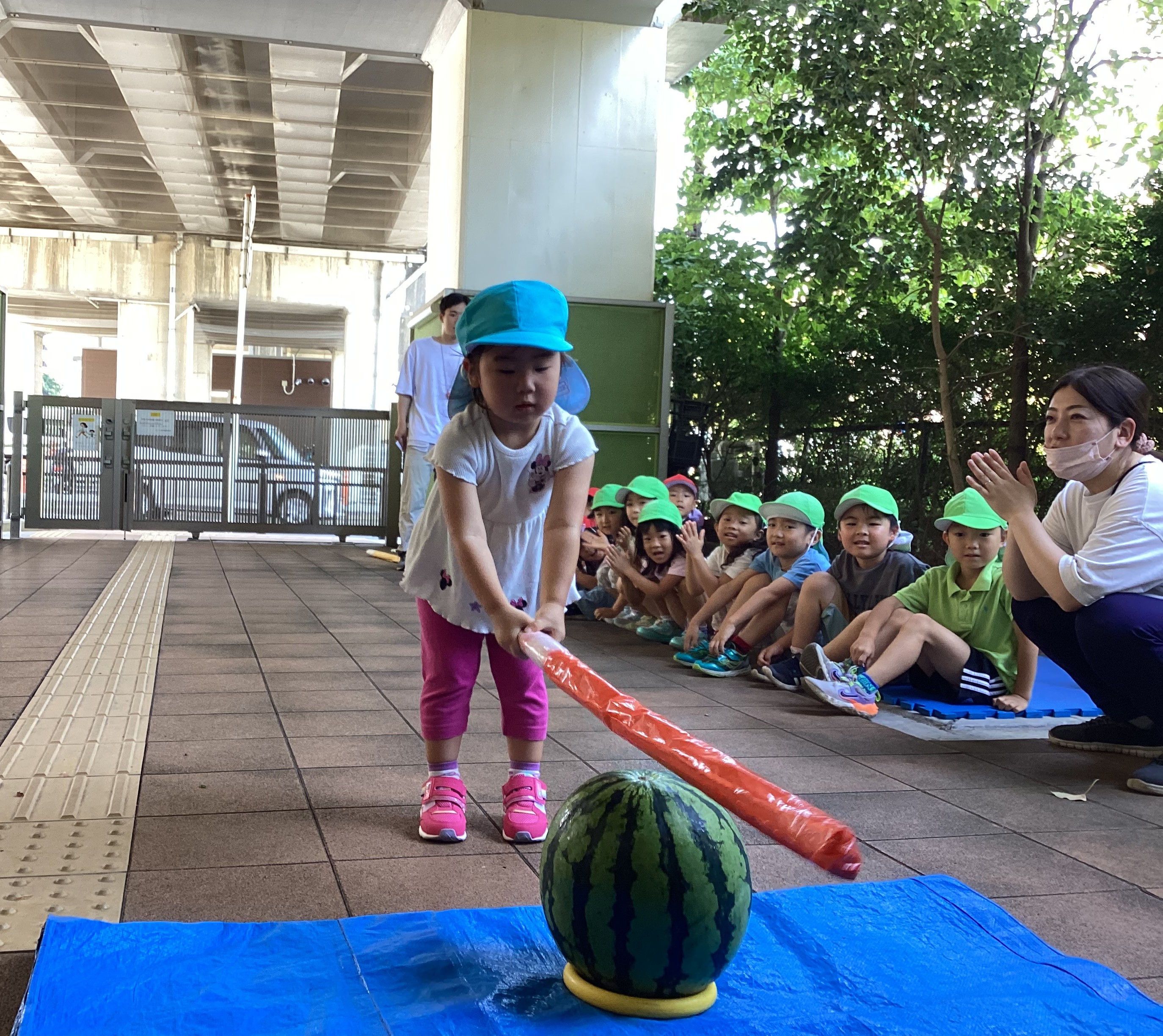 3歳児さんは、すいかに向かって一直線に歩き、力強くすいかを叩く姿が見られました。また、頑張っている友だちのことを一生懸命「がんばれ、がんばれ」と応援しすいか割りを楽しんでいました。