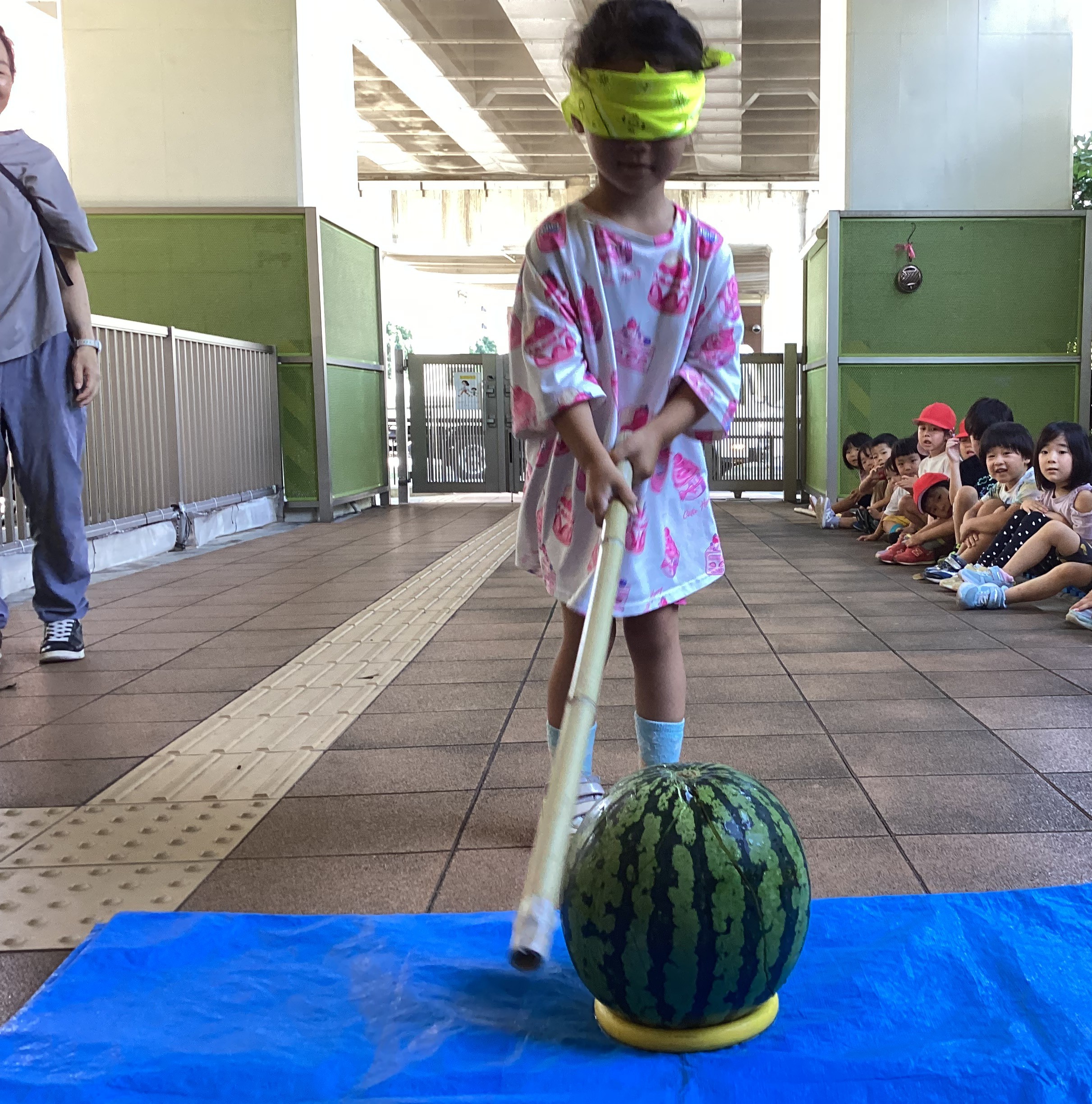 5歳児さんは全員目隠しをして挑戦しました。友だちや保育者に声を揃えて「こっちだよ!」「前だよ」等教えてもらいながら、すいかの置いてある場所を目指して頑張って歩いていました。すいかを力強く叩く姿はとてもかっこよかったです。