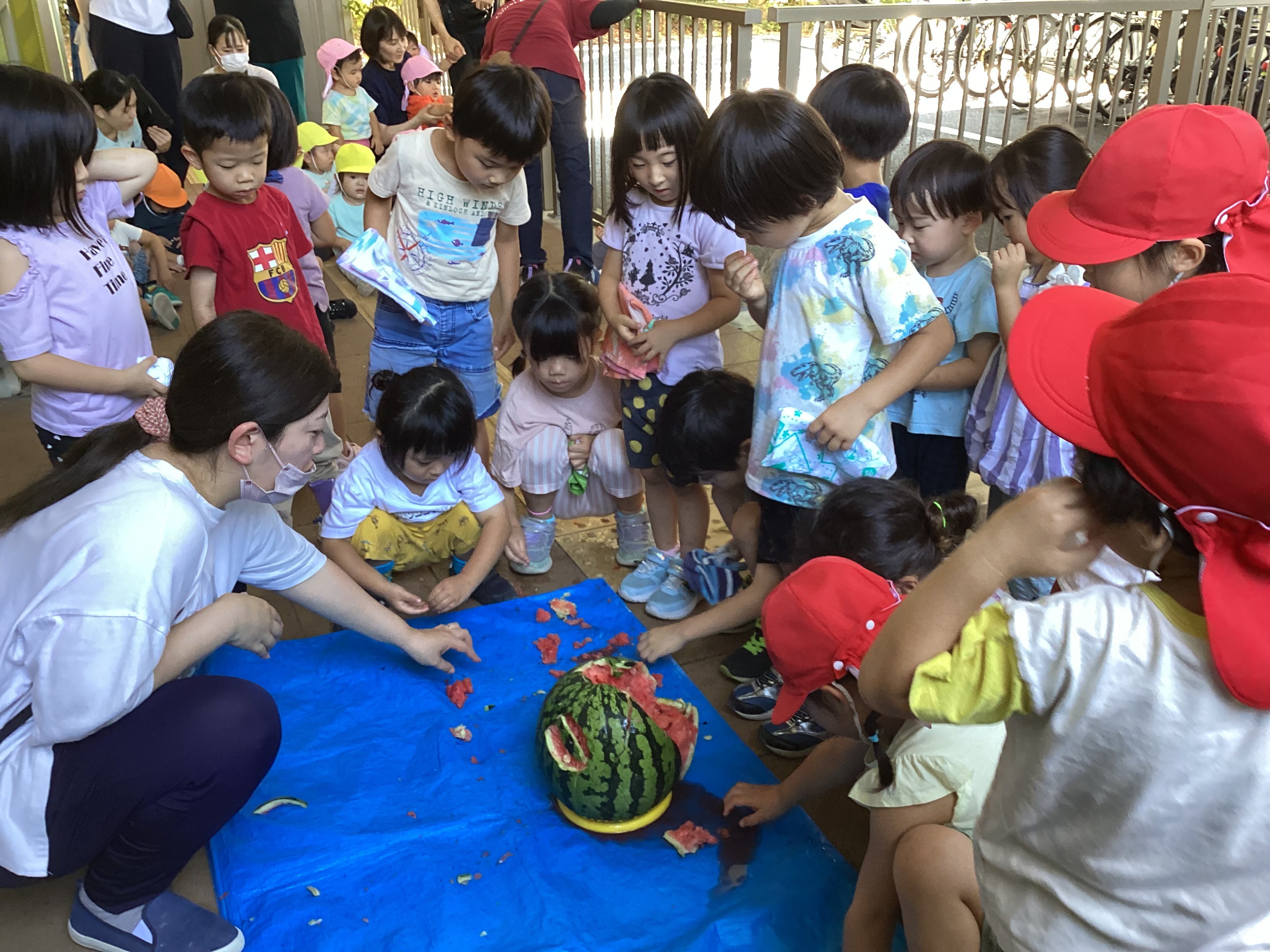 子どもたちの力だけではすいかが割れなかったため、保育者もすいか割りに参加しました。みんなで頑張って割ったすいかを近くで観察したり、触ってみたりしました。