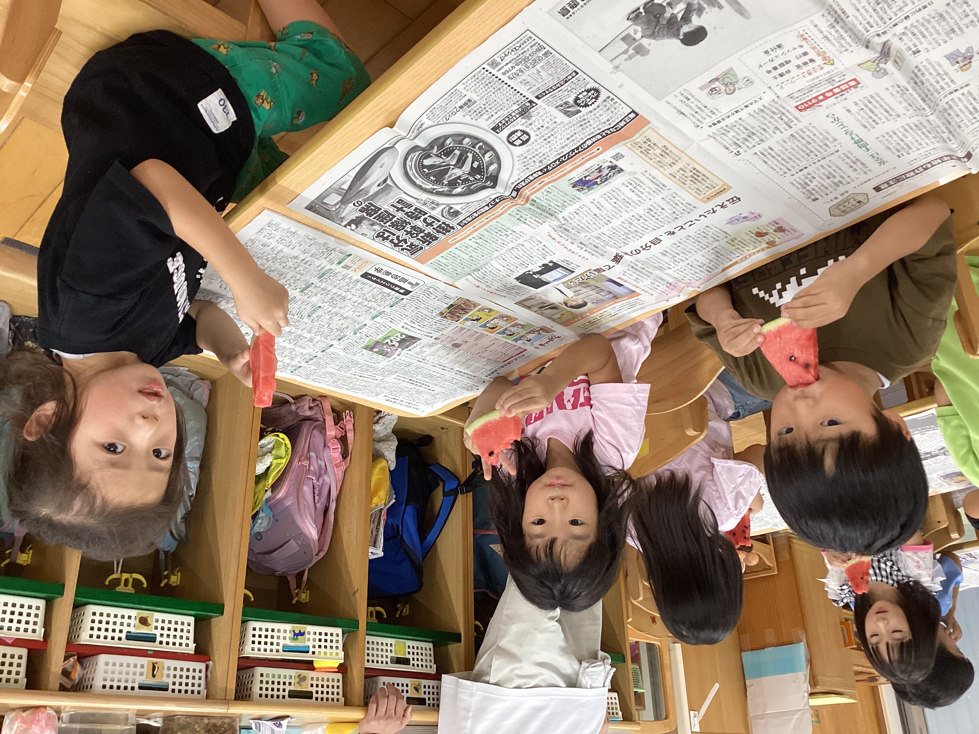 最後にお部屋に戻ってすいかを食べました。すいかが好きな子は何度もおかわりをしていて、苦手な子も自分から一口食べている姿が見られました。お友だちと「甘くておいしいね」や「もっと食べたいね」と言いながらとても嬉しそうに食べている姿がとてもかわいらしかったです。