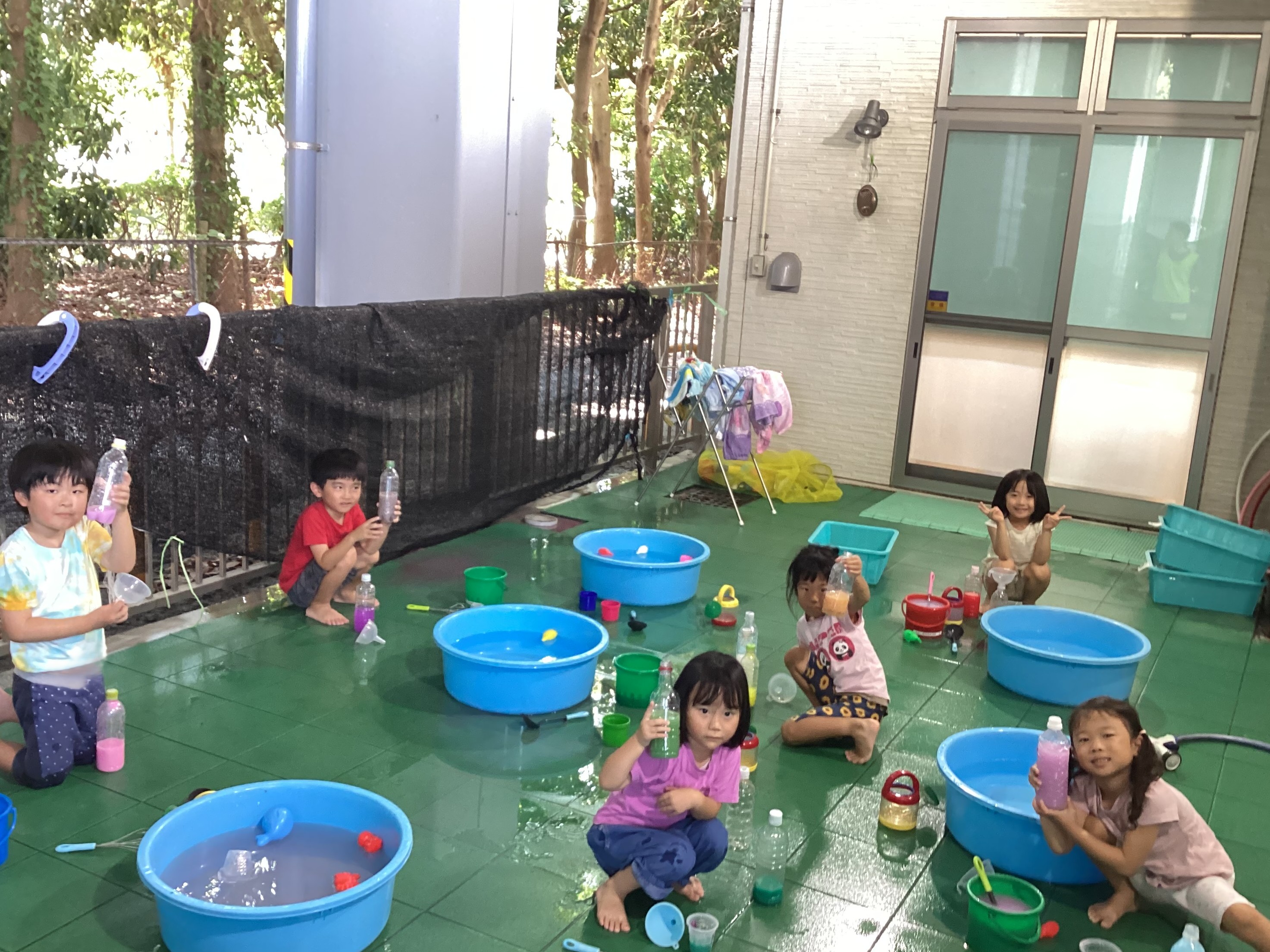 色水遊びでは、違う色と色を混ぜて何色が出来るかを楽しんでいました。「〇〇色になった!」と友だちと見せ合いっこする姿もありましたよ。