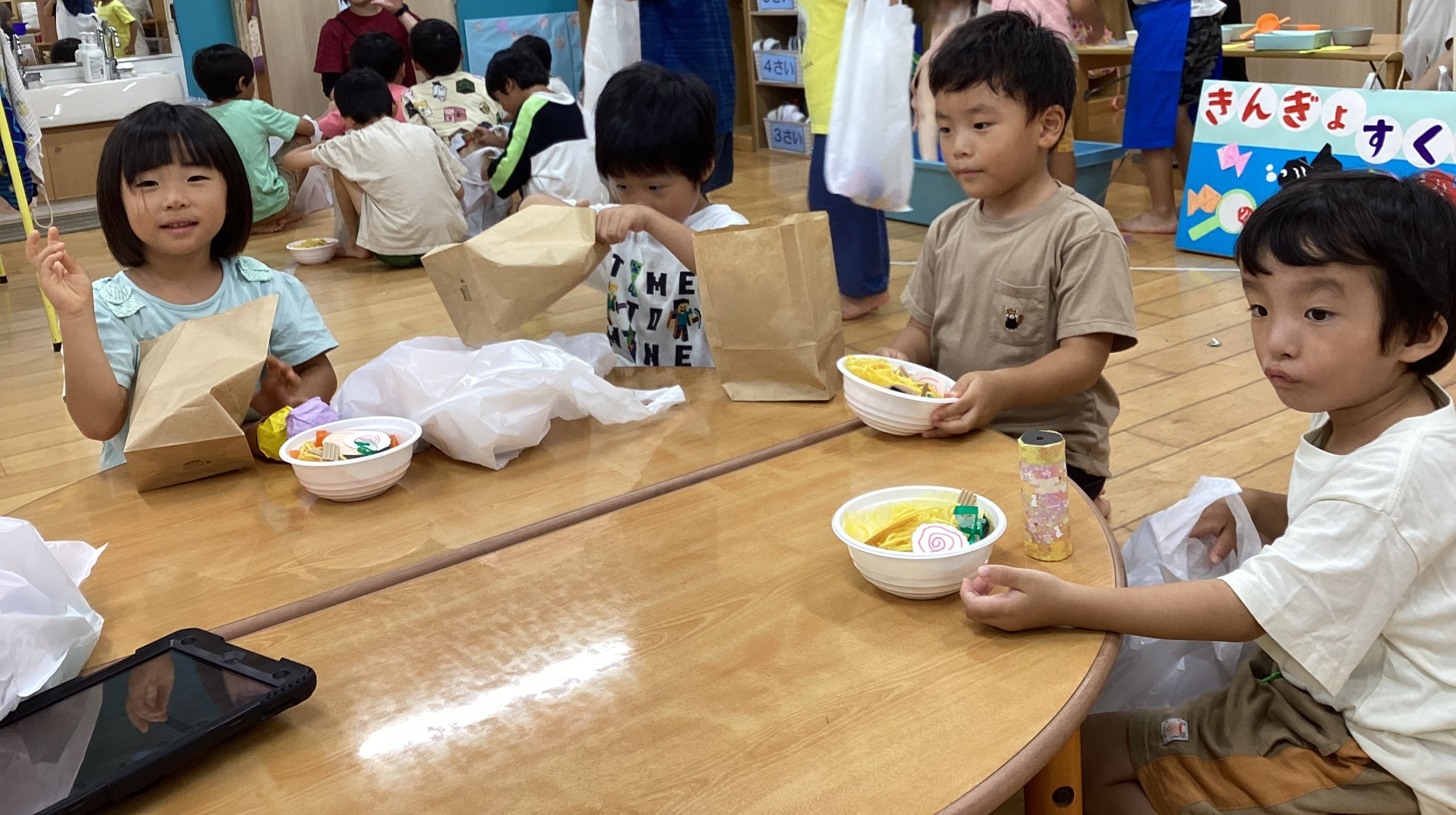 楽しみにしていたお店屋さんごっこでは、各お店で好きな物を選びました。イートインスペースでは、買ったご飯をお友だちと仲良く食べて楽しんでいました。