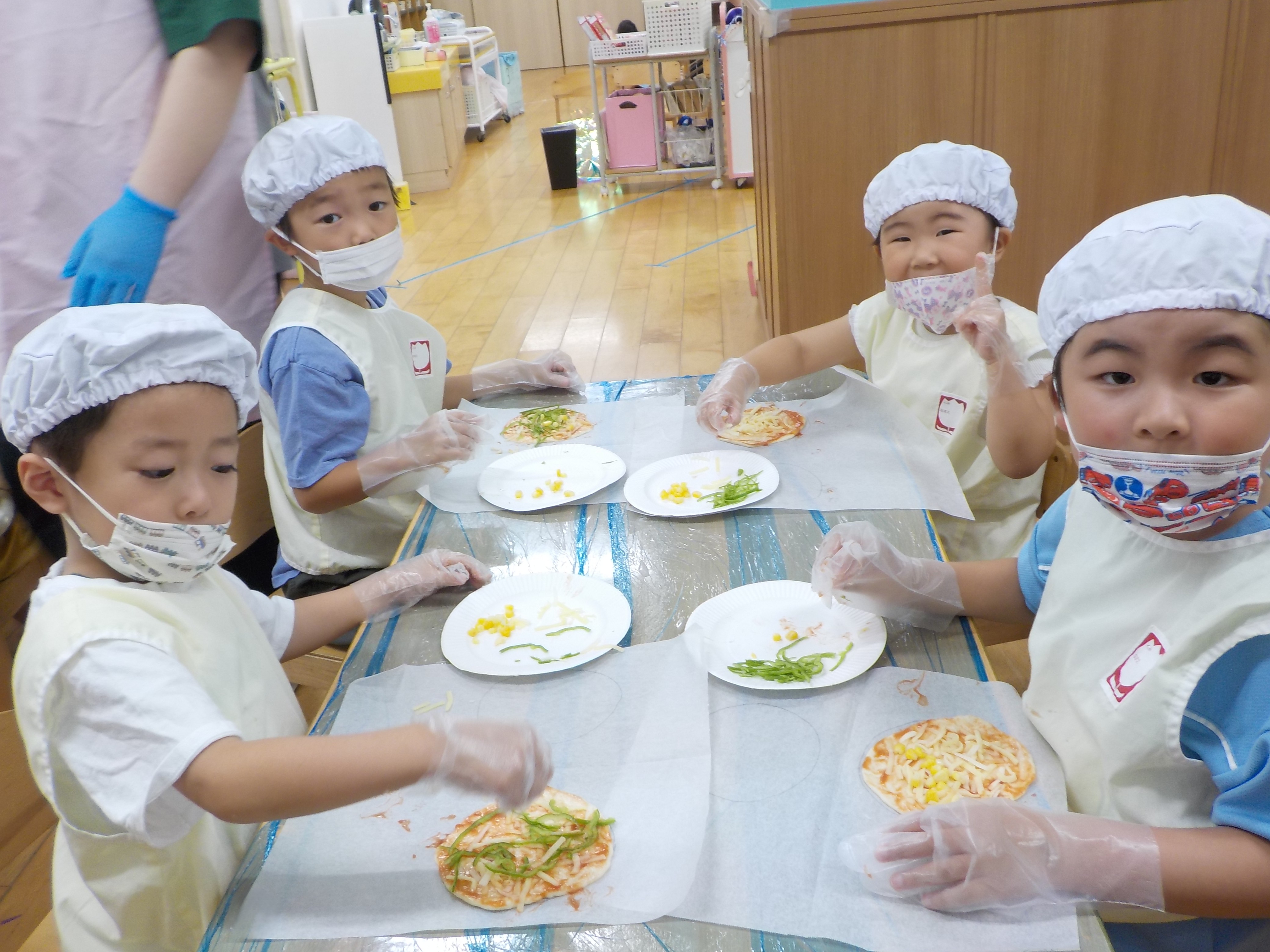 楽しみにしていたクッキングでは、ピザ作りをしました。お友だちと協力をしながら生地を混ぜたりこねたりしました。トッピングのせでは、「ピーマン苦手だけど、頑張る!!」と宣言し、おやつで美味しく食べました。