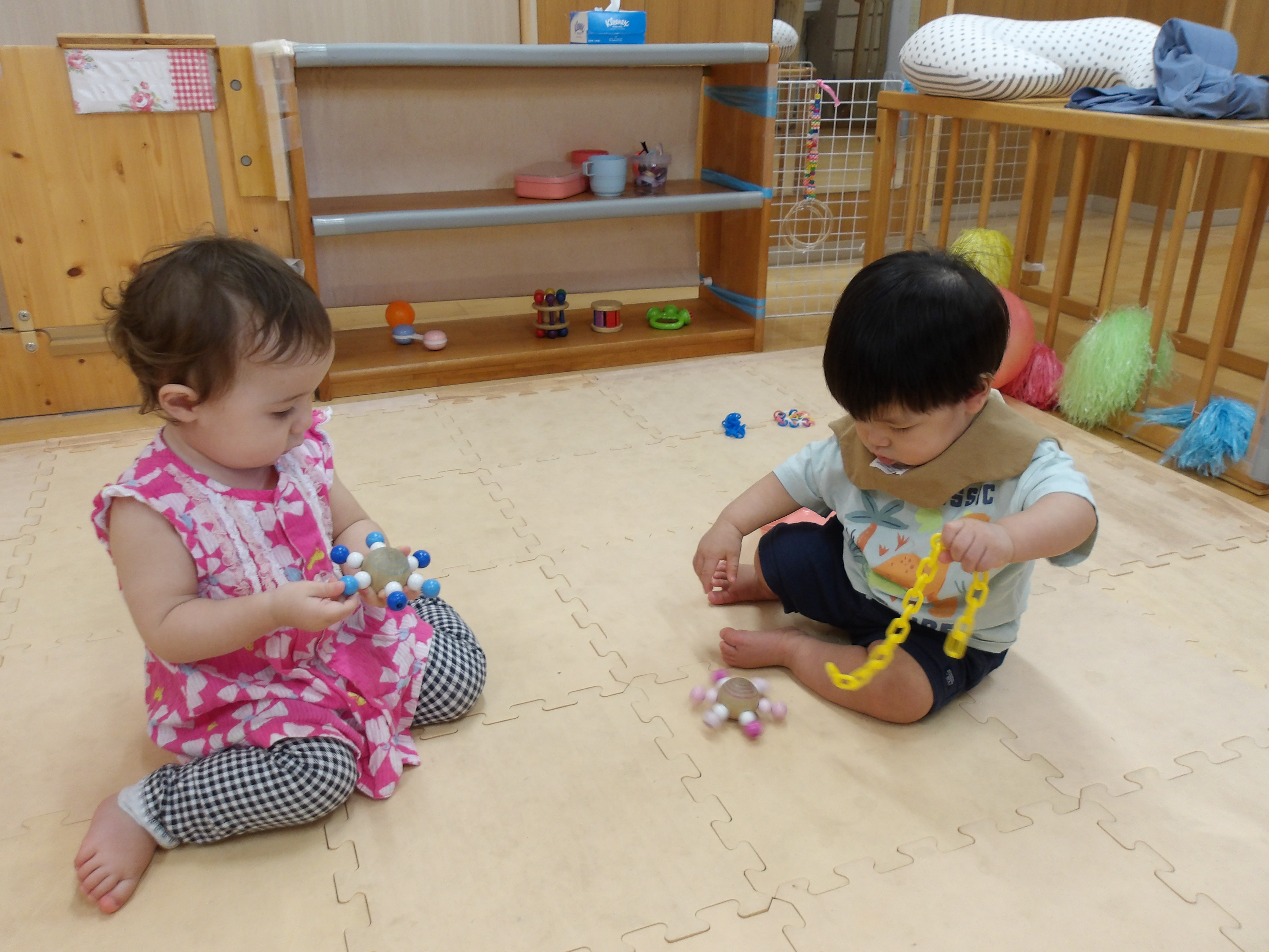 少しずつ友だちに興味が出始めてきたたまご組さんです。友だちが持っている玩具にも興味を示し、その玩具を眺めたり、同じ種類の玩具を持ってきたりします。特に人気の玩具は風船とチェーンです。木製でできているコマも好きなようで、保育者が回すとクルクルしている様子を興味津々で見つめています。