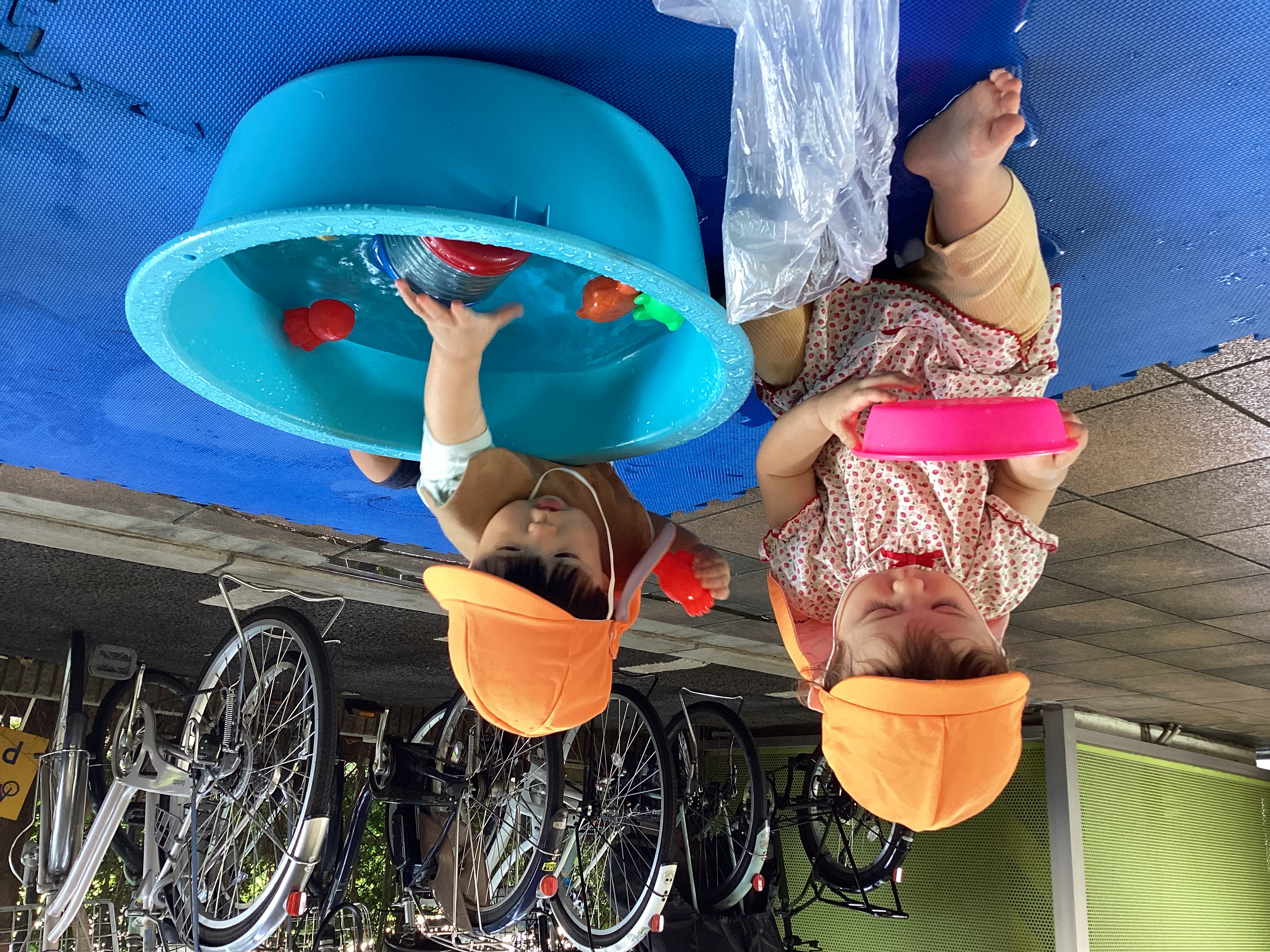 <水遊び>9月も暑い日が続いていましたが、水遊びを行い涼しさが感じられるように過ごしました。水遊びを始めた頃は、年上児が行っているのを眺めたり、少し水に触れたりして遊んでいましたが、何度か行ううちにすっかり水に慣れ両手で水に触れ水しぶきを出したり、玩具で遊んだりして楽しんでいる姿が見られました。