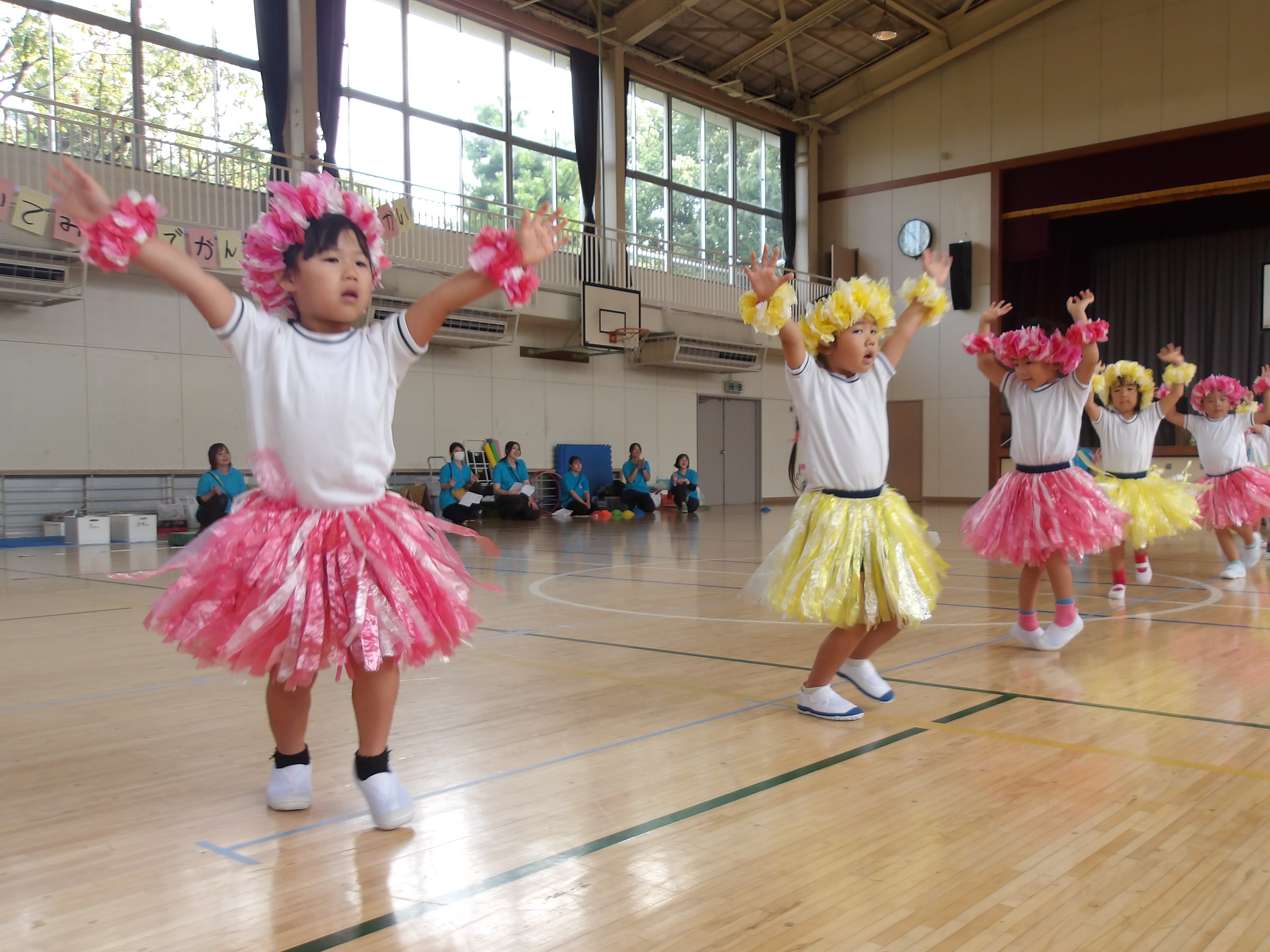 4歳児のダンスではフラダンス風の衣装を着て「アロアロアロハ!」を踊りました。「アロハ~」と元気よく入場して可愛らしかったですね。何度も隊形移動しながら大きく体を動かし踊っていた姿がとても素敵でした。