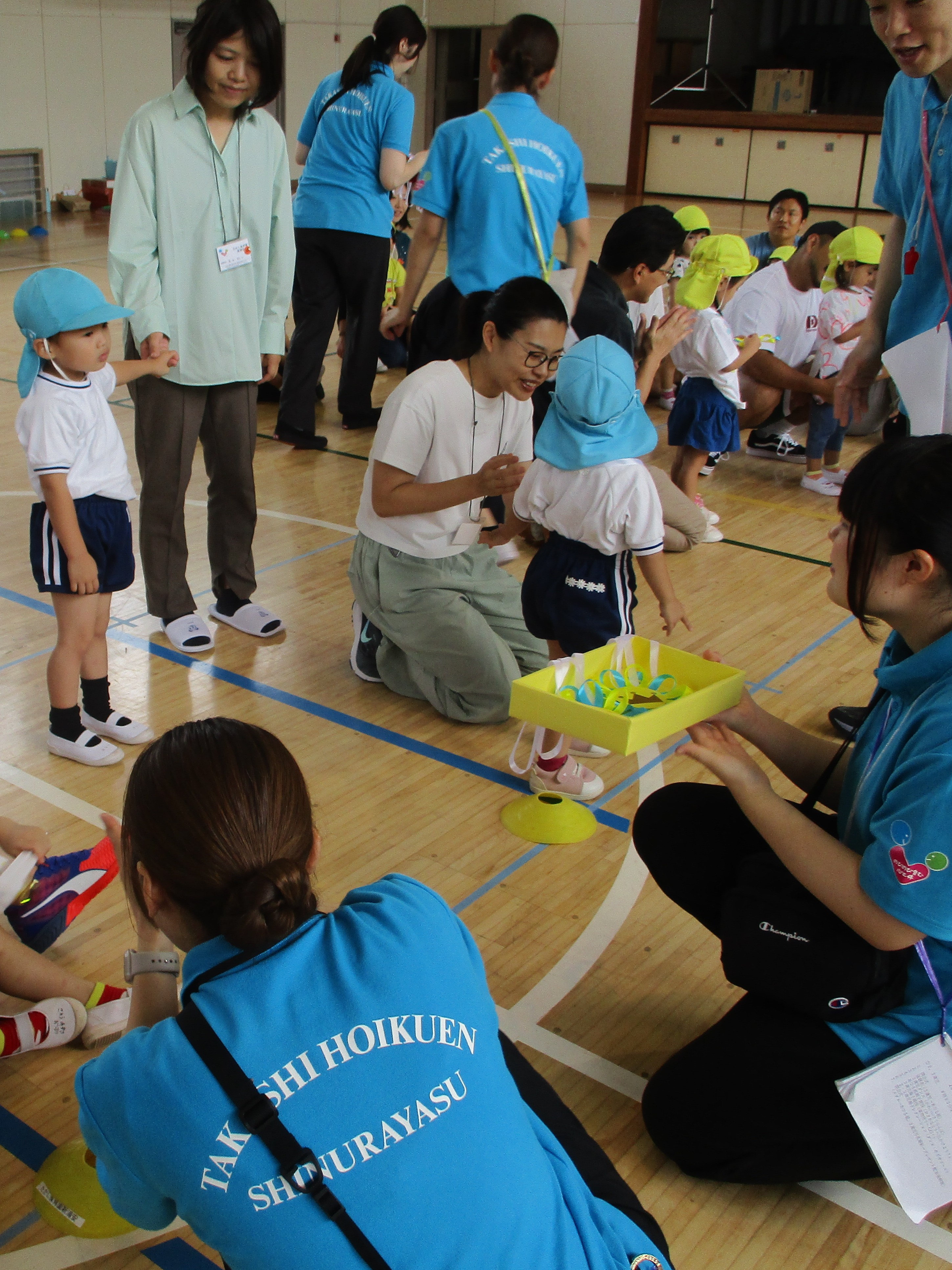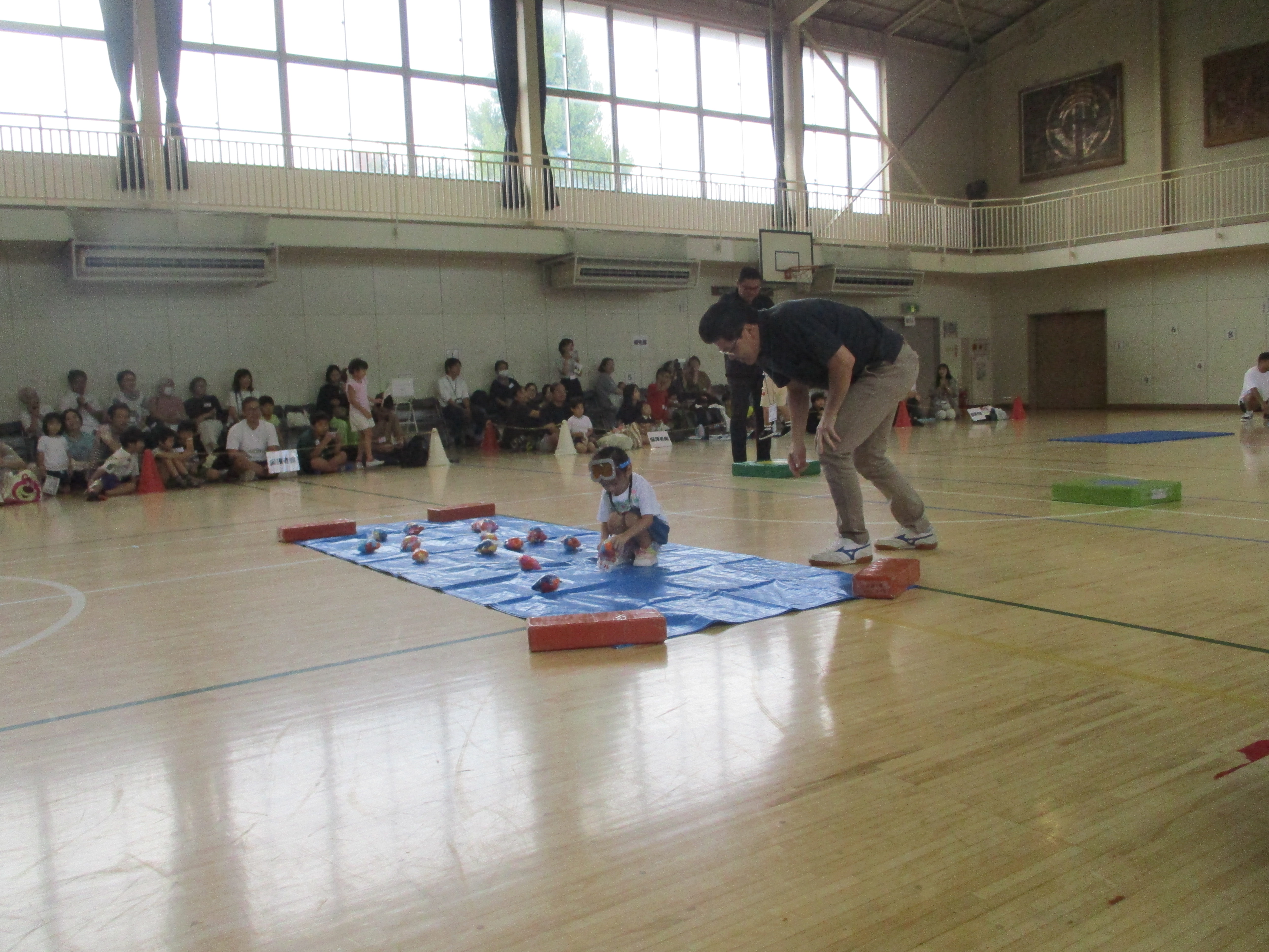 2歳児親子競技では、水中ゴーグルを付けて魚とりに出かけました。ハイハイやジャンプを難なくクリアし、自分たちが作った魚を網で上手に掬っていました。とった魚をしっかり握って、保護者の方と笑顔でゴールする姿が微笑ましかったです。