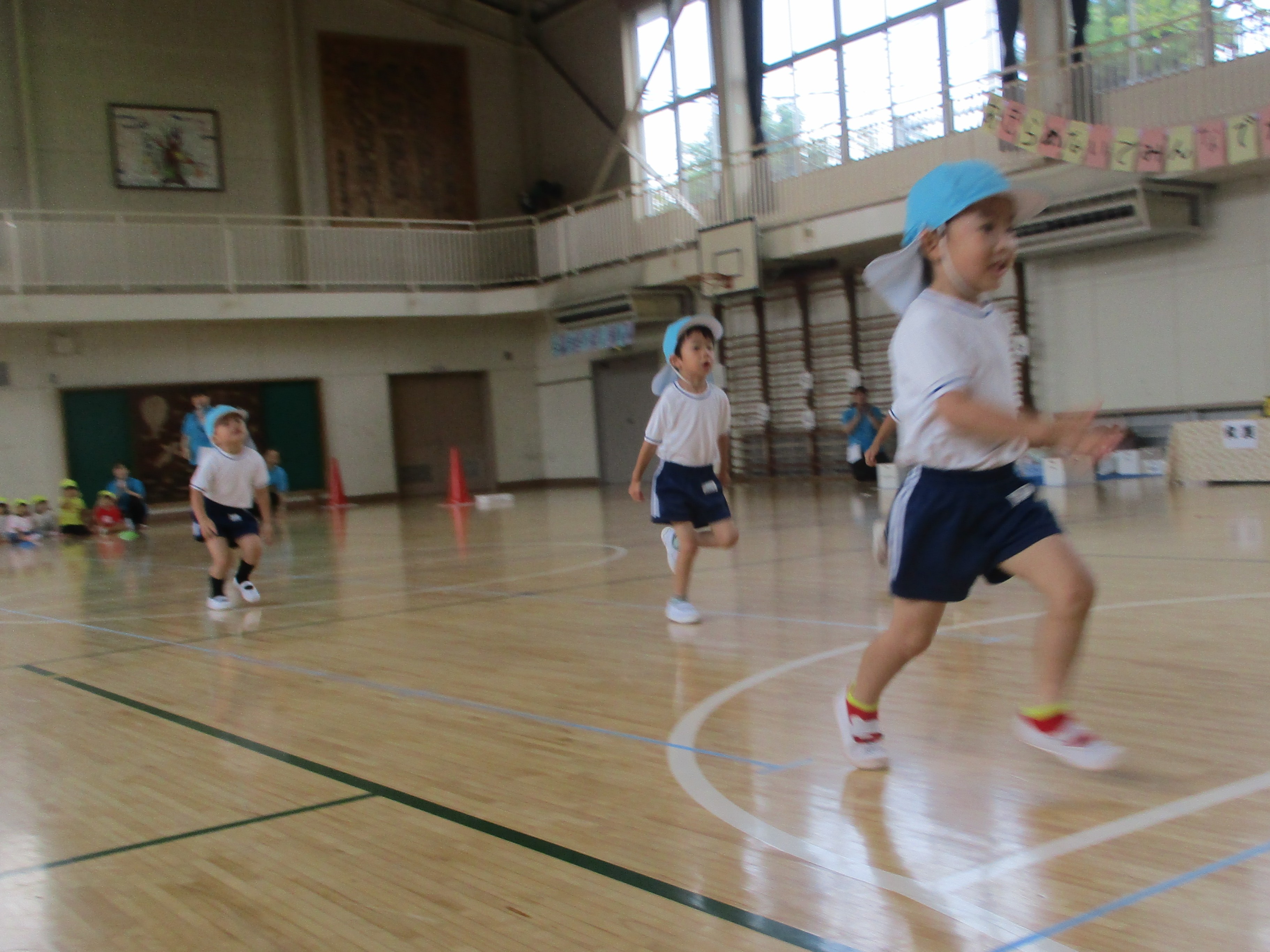 かけっこでは名前を呼ばれると元気よく返事をして、ゴールテープまで全力で走り抜けました。最後まで真剣に走る姿はとてもかっこ良かったです。