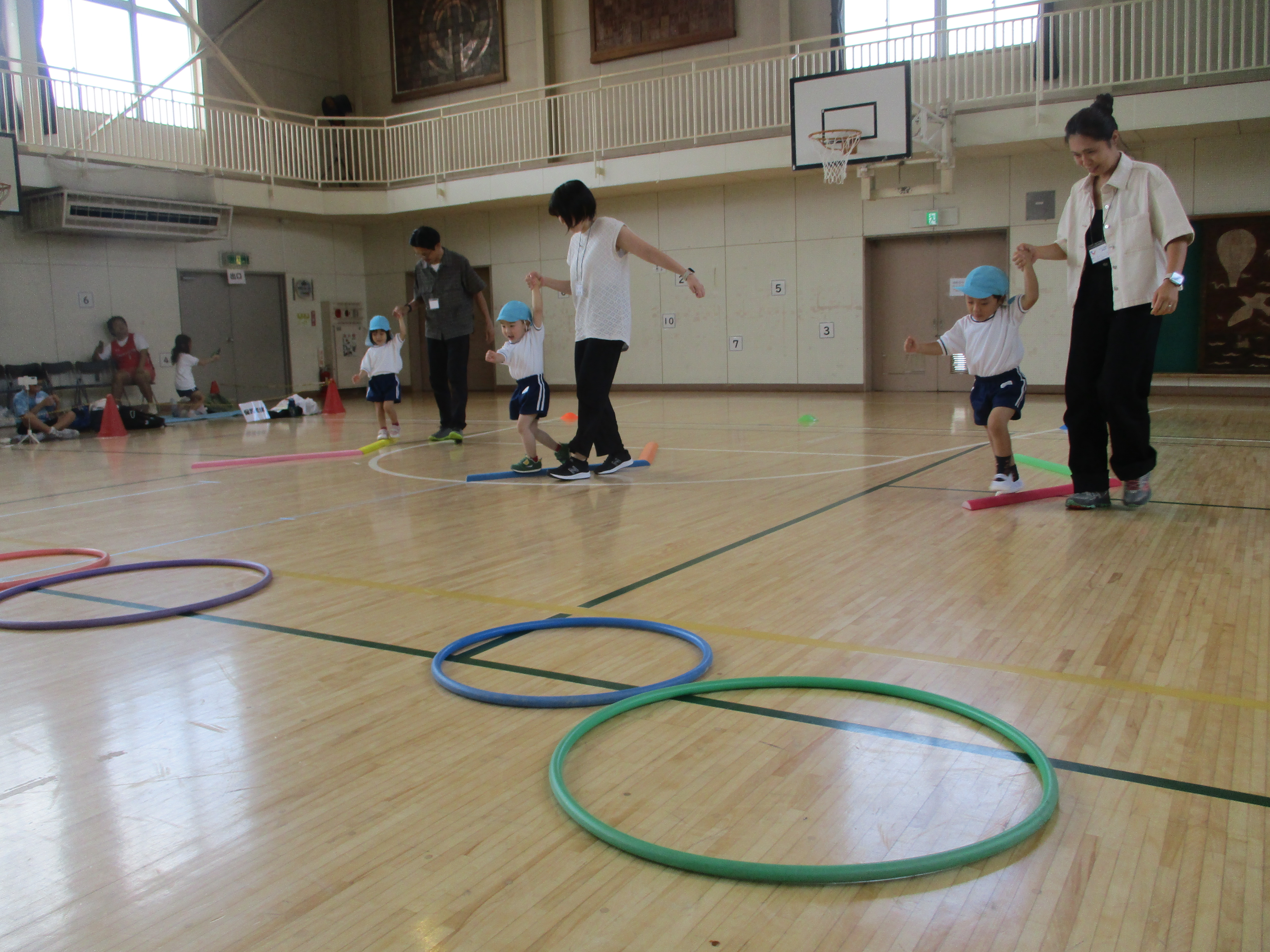 4・5歳児親子競技ではネットの下をくぐったり、親子で協力してフープをくぐったりしました。最後のボール運びでは、ボールが落ちないように挟んでお母さん、お父さんと協力してゴールしていましたね。