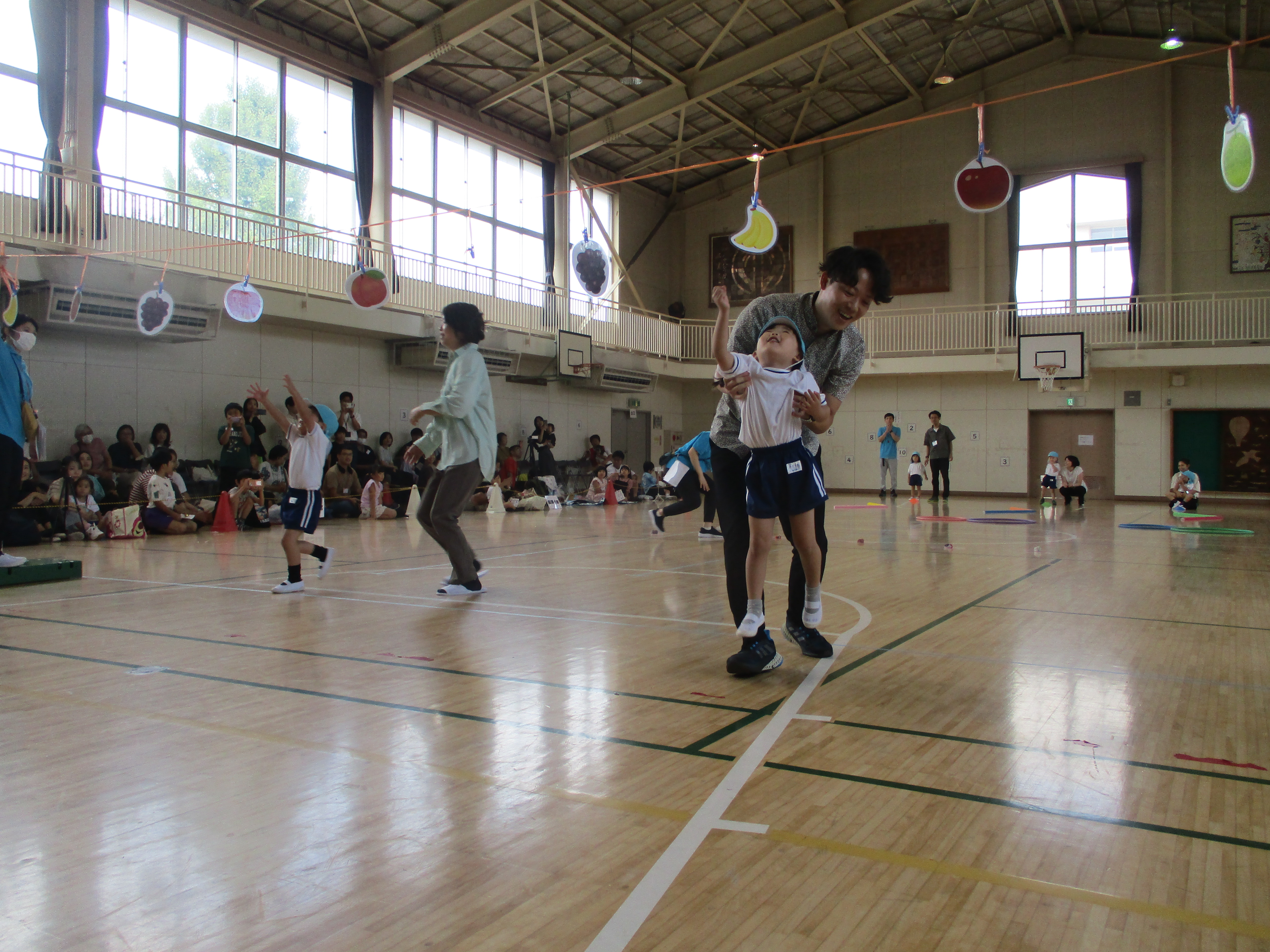 3歳児親子競技では、ジグザグの道を渡ったり、お父さんお母さんと一緒にフラフープをくぐったりしました。最後は引いたカードに描いてある果物を収穫しました。おんぶや抱っこをしてもらいながら、うんと手を伸ばして「とったぞ!」という表情が可愛かったです。