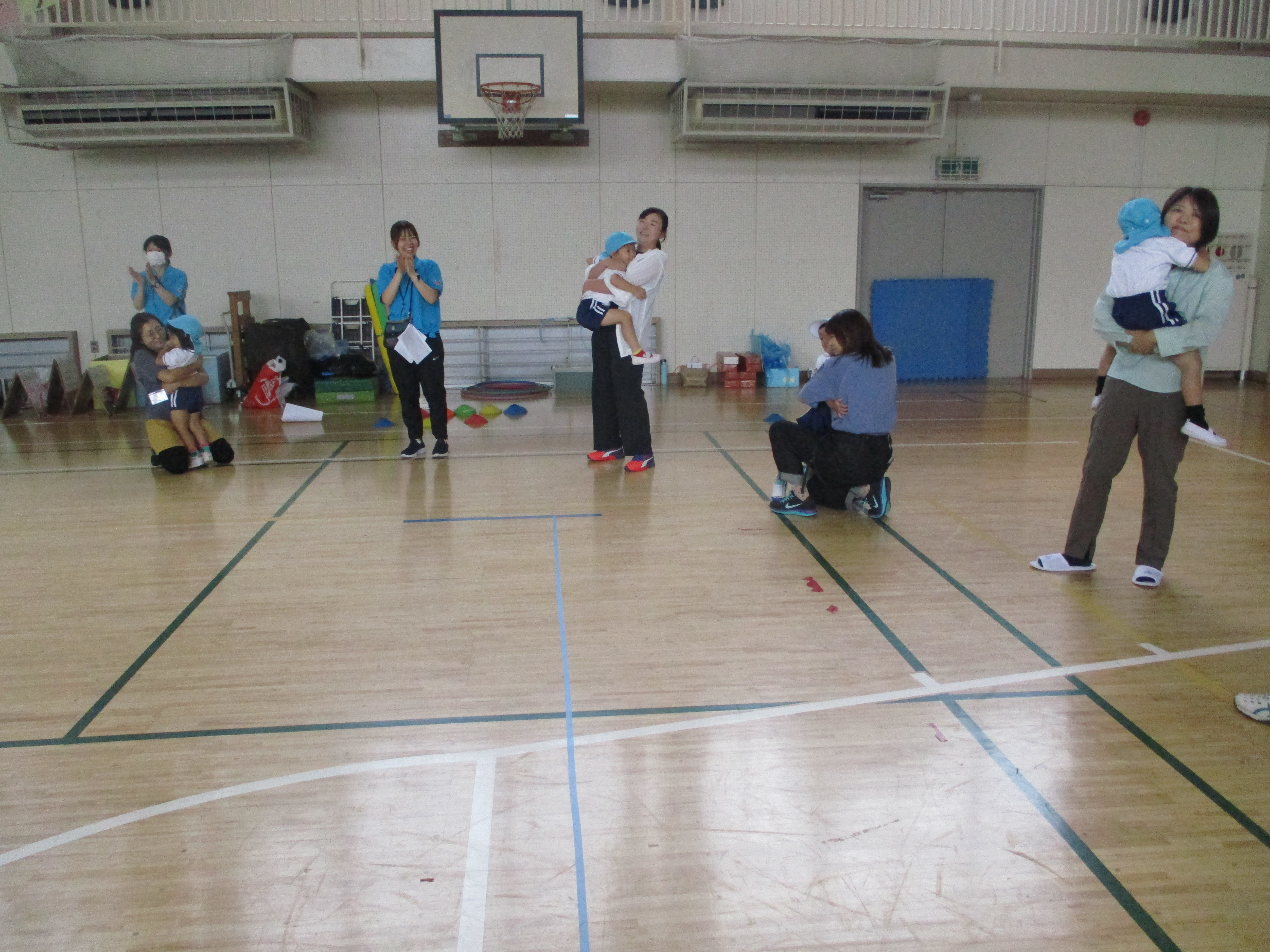 親子レクリエーションでは、お父さんお母さんと一緒に「めざせゴール」を踊りました。キラキラと手を動かしながらとても楽しそうに踊っていましたね。手を繋いで踊り最後にぎゅっと抱きしめてもらうと、嬉しくて笑顔があふれるこどもたちの姿にほっこりしました。