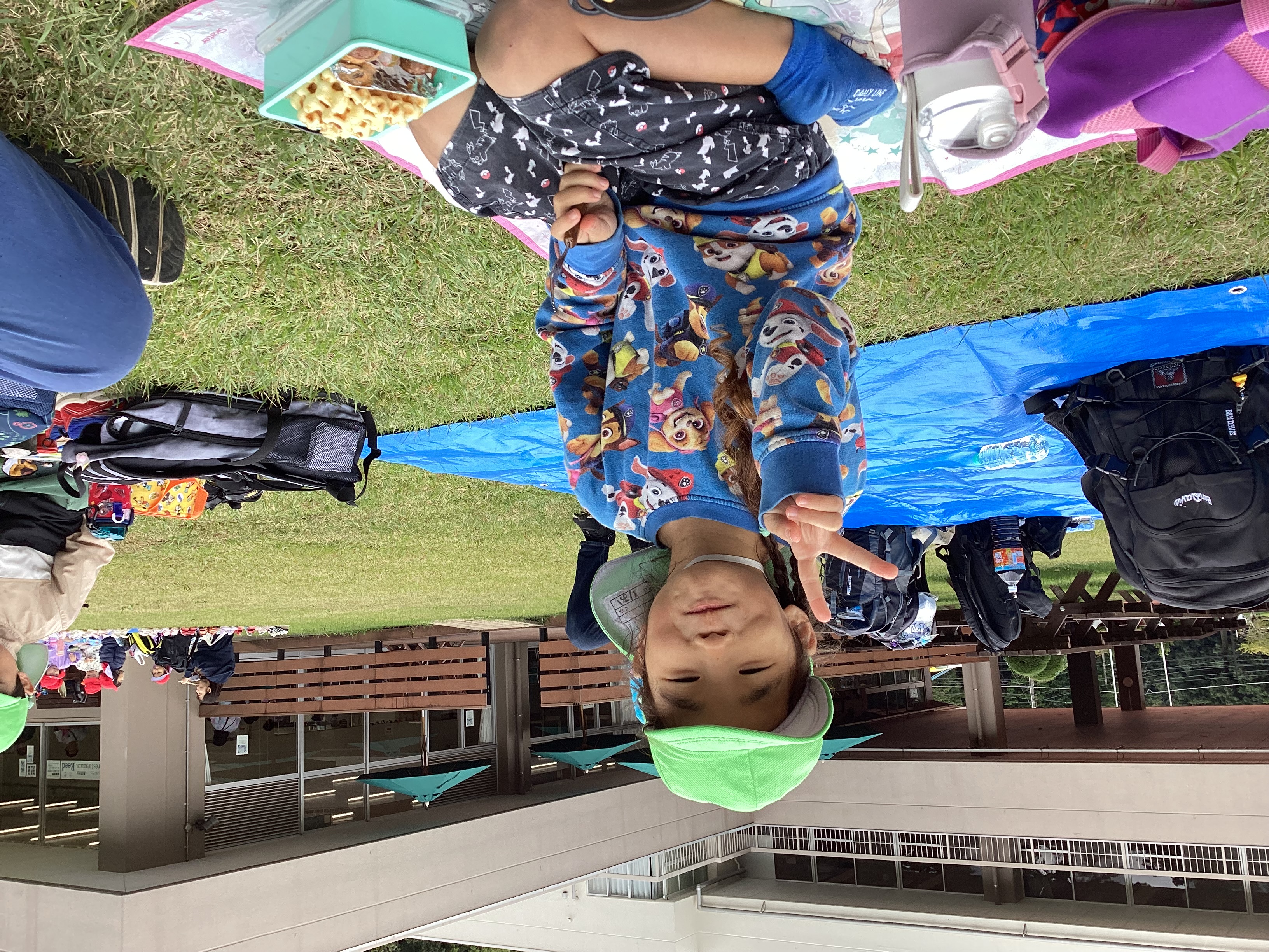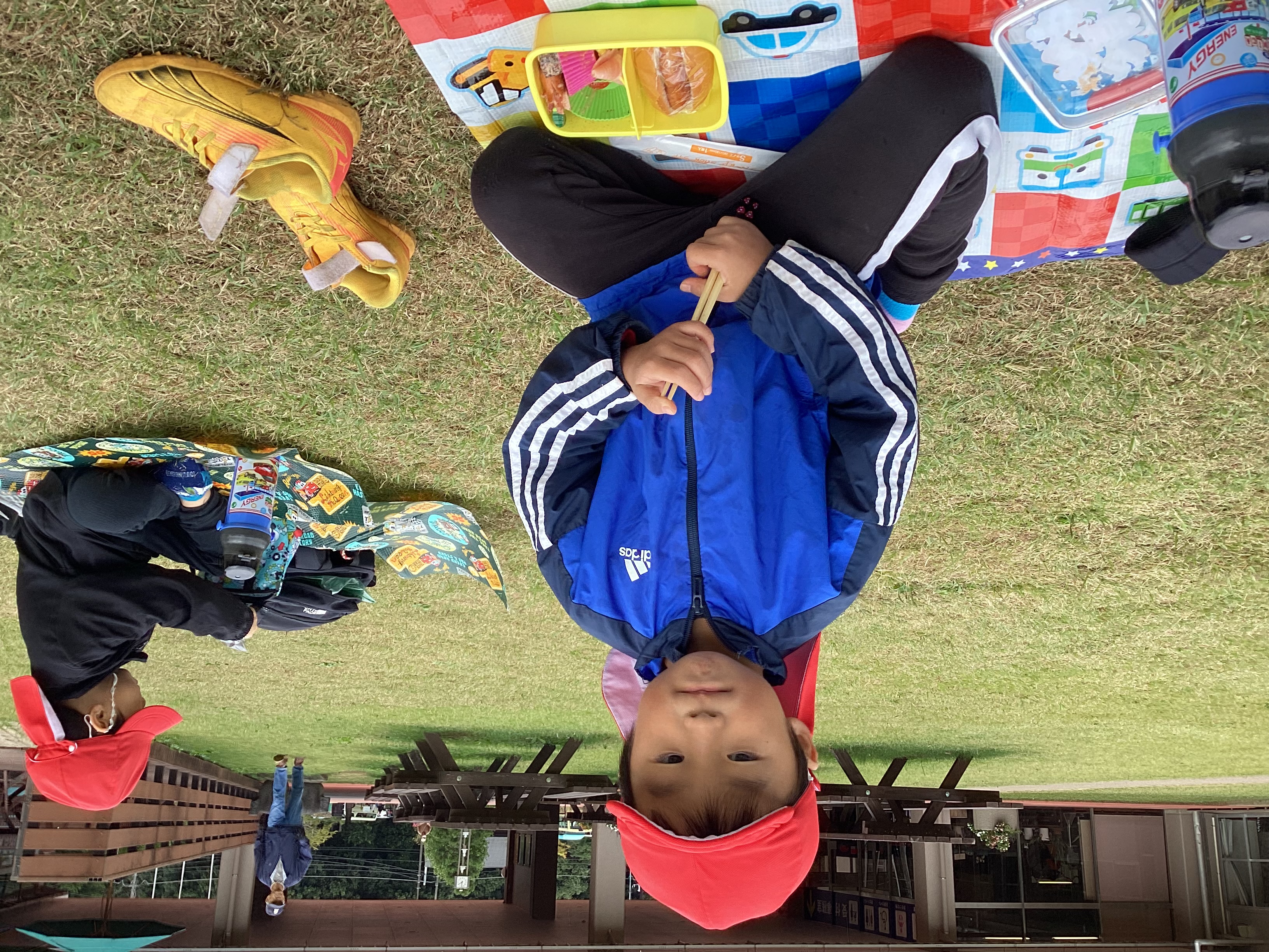 たくさんお芋を掘った後は、待ちに待ったお弁当!好きな場所にレジャーシートを広げ、友だちとのお話を楽しみながら、昼食の時間を楽しみました。「見て!ママが食べやすいように作ってくれたサンドイッチだよ!」等と話し、美味しそうに食べていました。