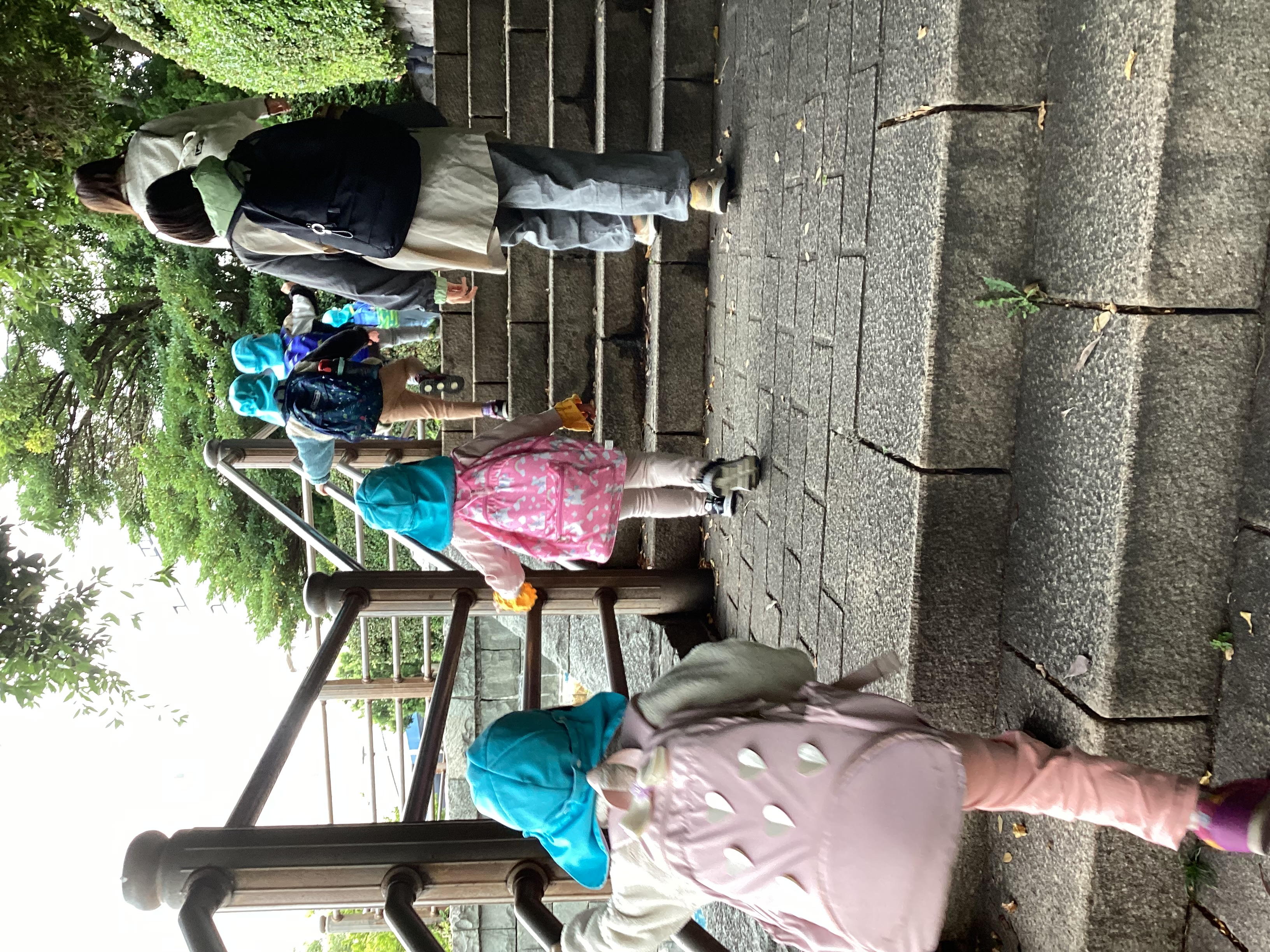 若潮公園にピクニックに行きました。前日の帰りの会では、持ち物を忘れないように、話をよく聞いていました。お弁当箱の形やおかずの事を教えてくれる等、楽しみにしている様子が可愛かったです。公園に向かう時には、歩道や階段もしっかりと上手に歩いてくれました。お友達や保護者ボランティアの方々とも楽しく会話して、歩く時間も楽しんでくれたようです。