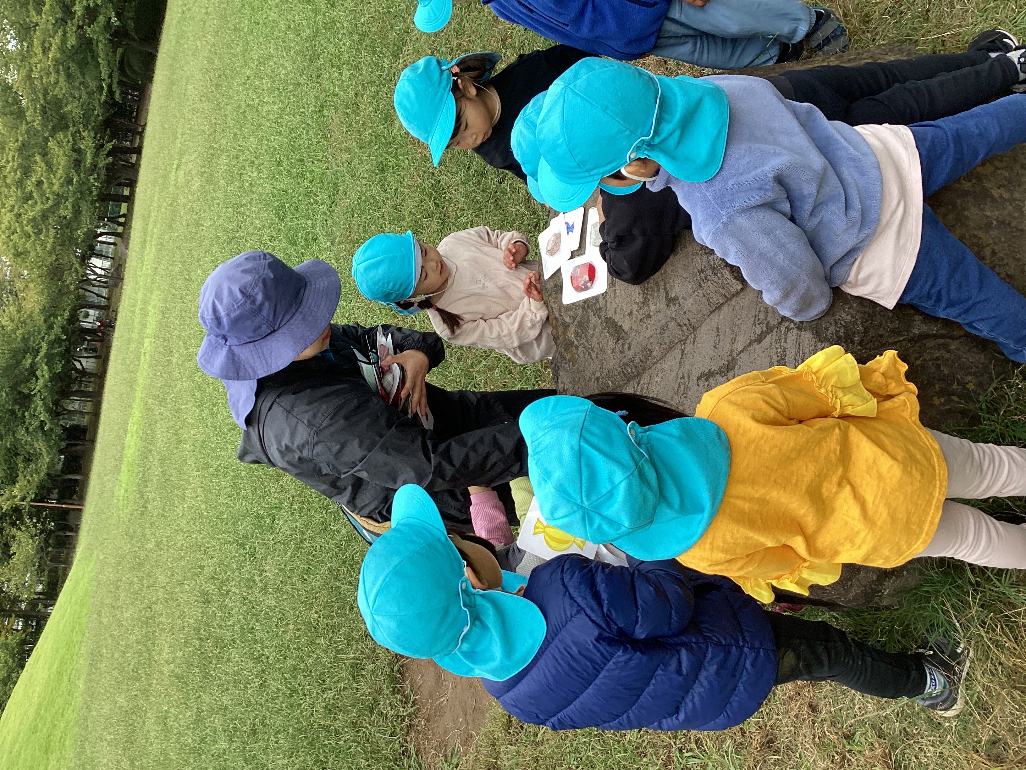 宝探しゲームでは、木の後ろ等に隠されたカードを探しました。見つからない時には、友だちと「こっちじゃない?」等と相談しながら一緒に探していましたよ。最後には集めた枚数を数えて「全部あったー!」とみんなで喜びました。