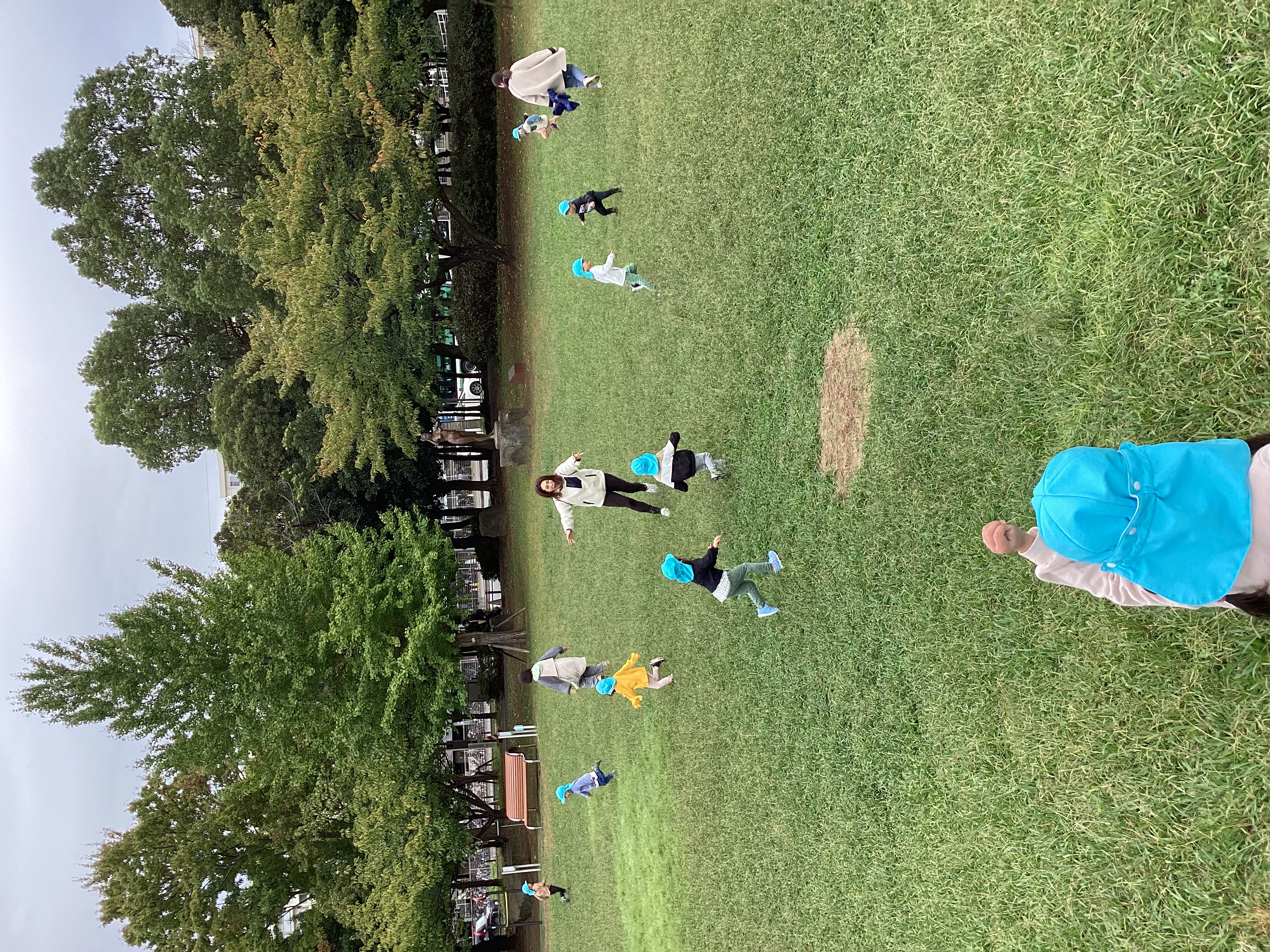 公園では、初めにしっぽ取りをしました。しっぽを取られないように上手に逃げて最後まで残る子や、「しっぽをこんなに取ったよ」と嬉しそうに見せてくれる子もいました。しっぽを取られてしまった子も、ボランティアさんたちと一緒に声を上げて応援をして、笑顔を見せてくれました。