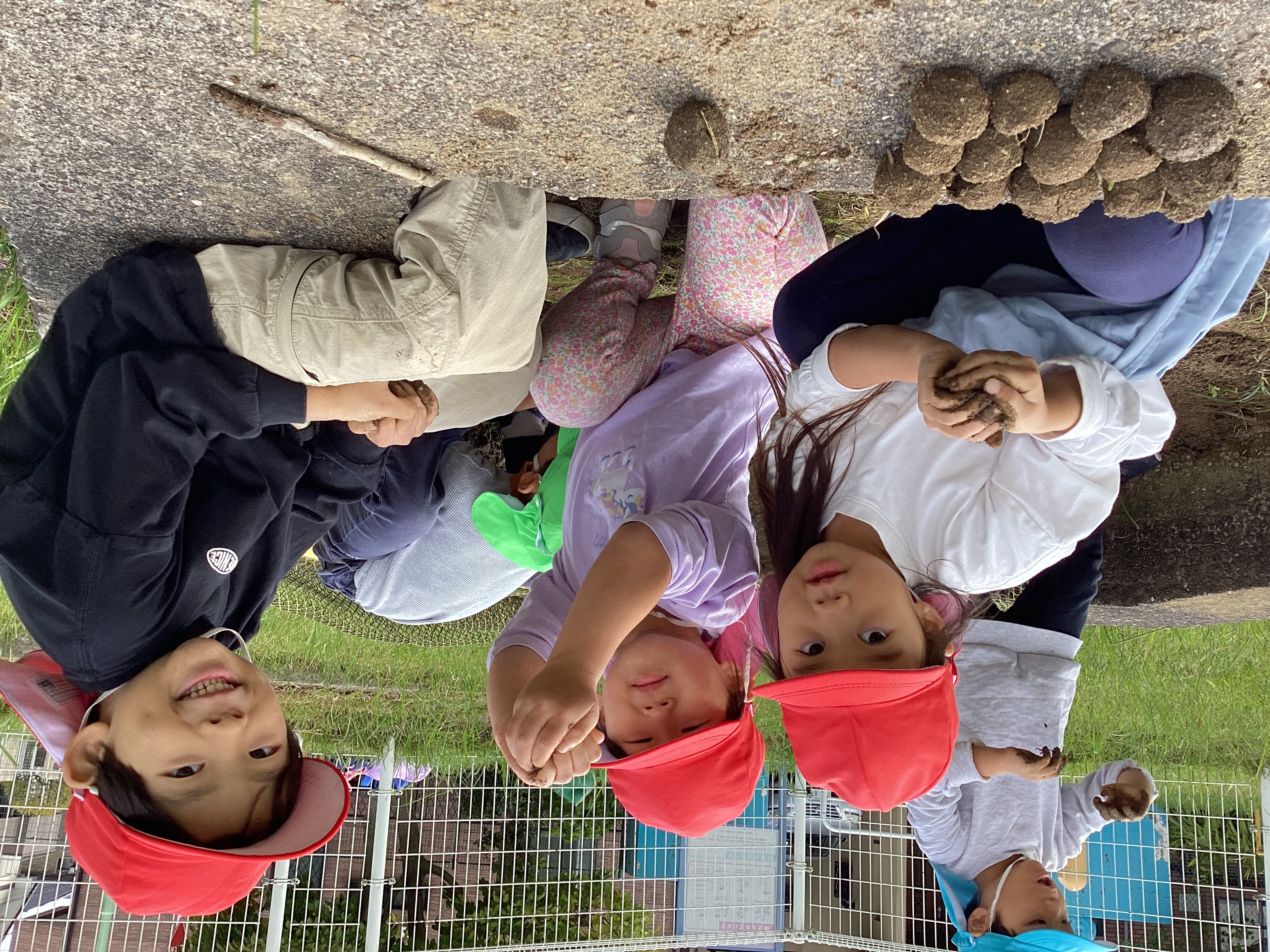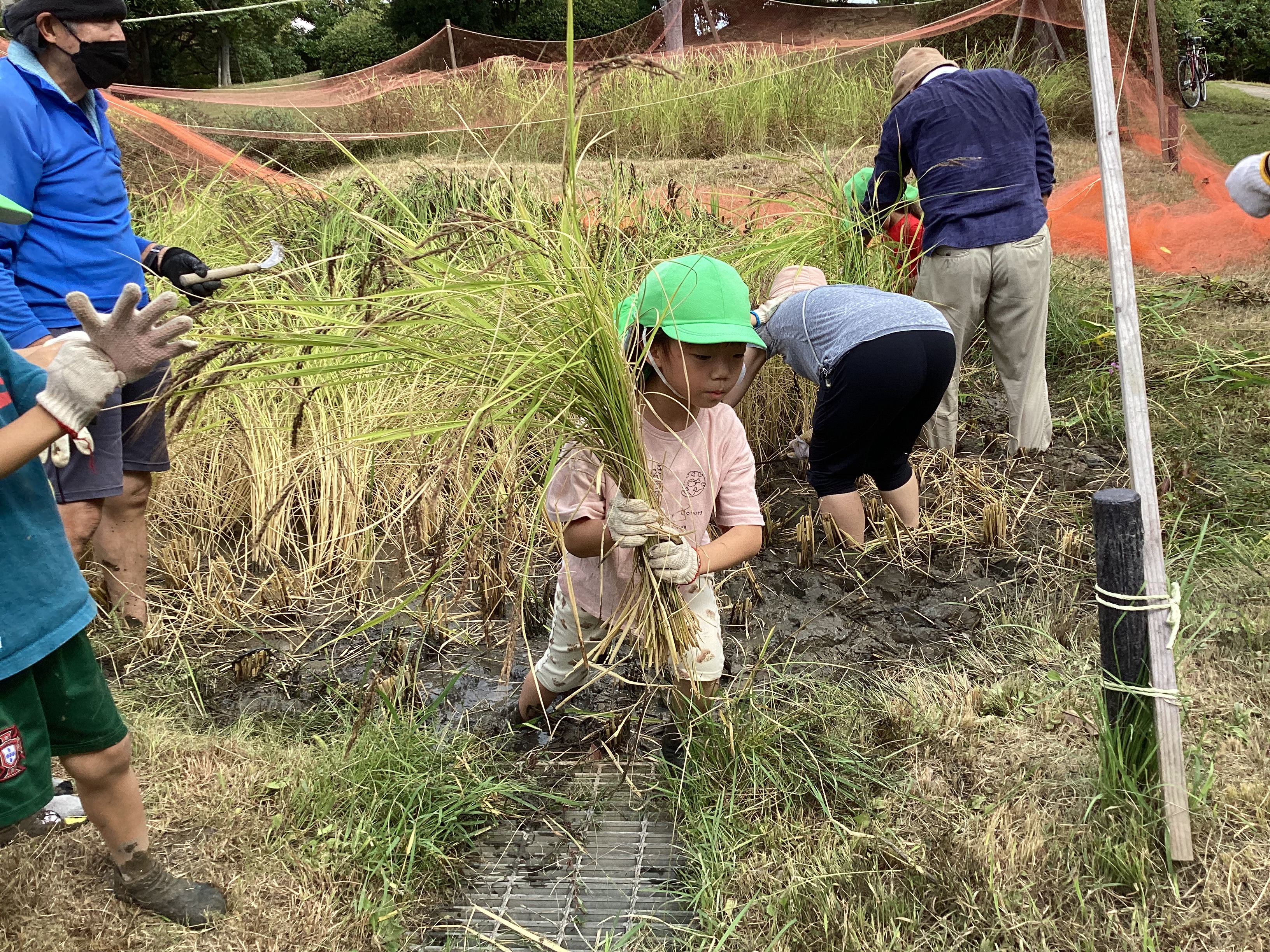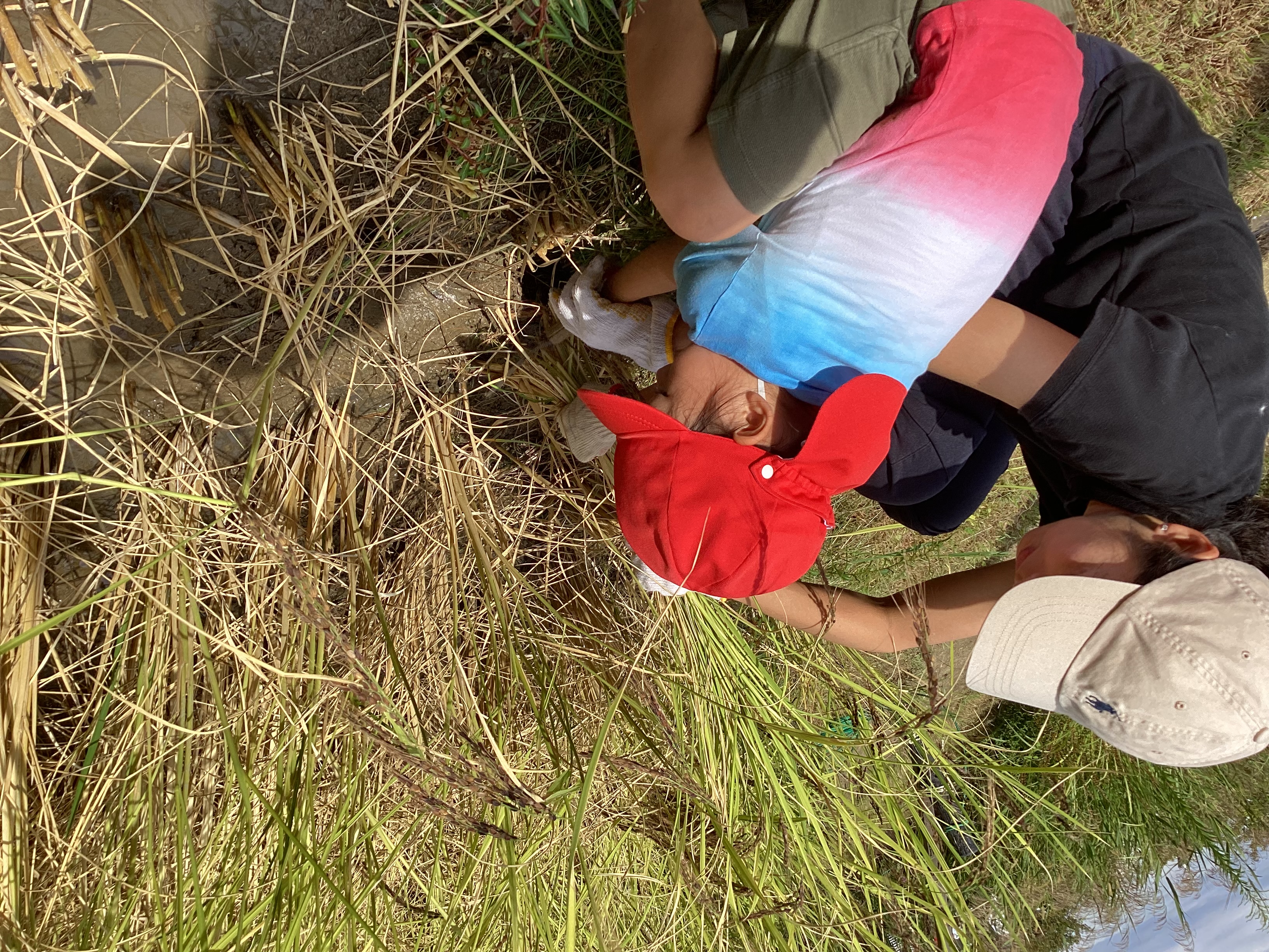 10月6日に明海の丘公園へ稲刈りに行ってきました。自分の身長よりも大きく成長している稲に驚く子どもたち。鎌を使って刈ることにドキドキしている姿も見られましたが、上手に刈ることができ、「できたー!」ととても嬉しそうに教えてくれた4.5歳さんでした!