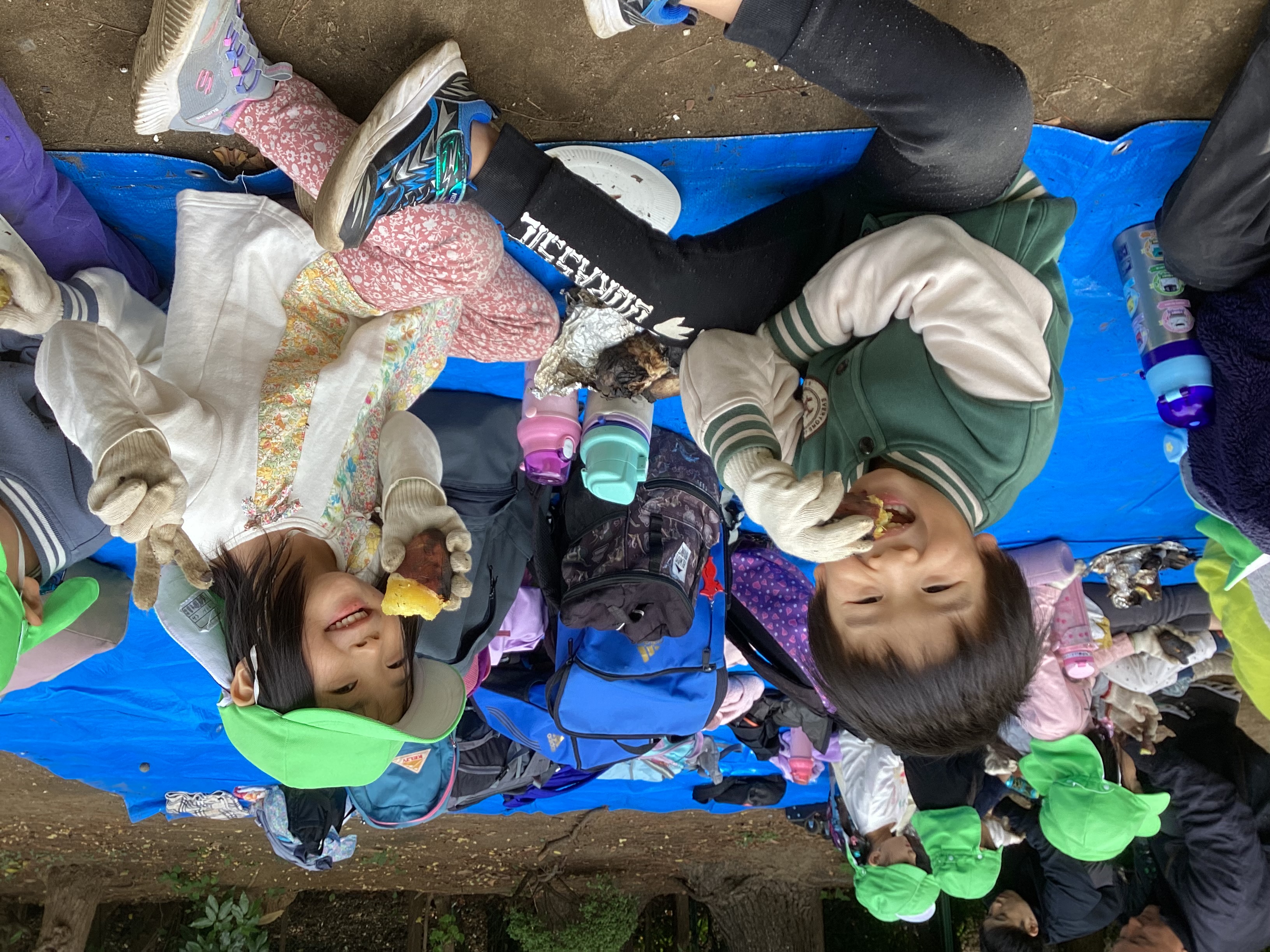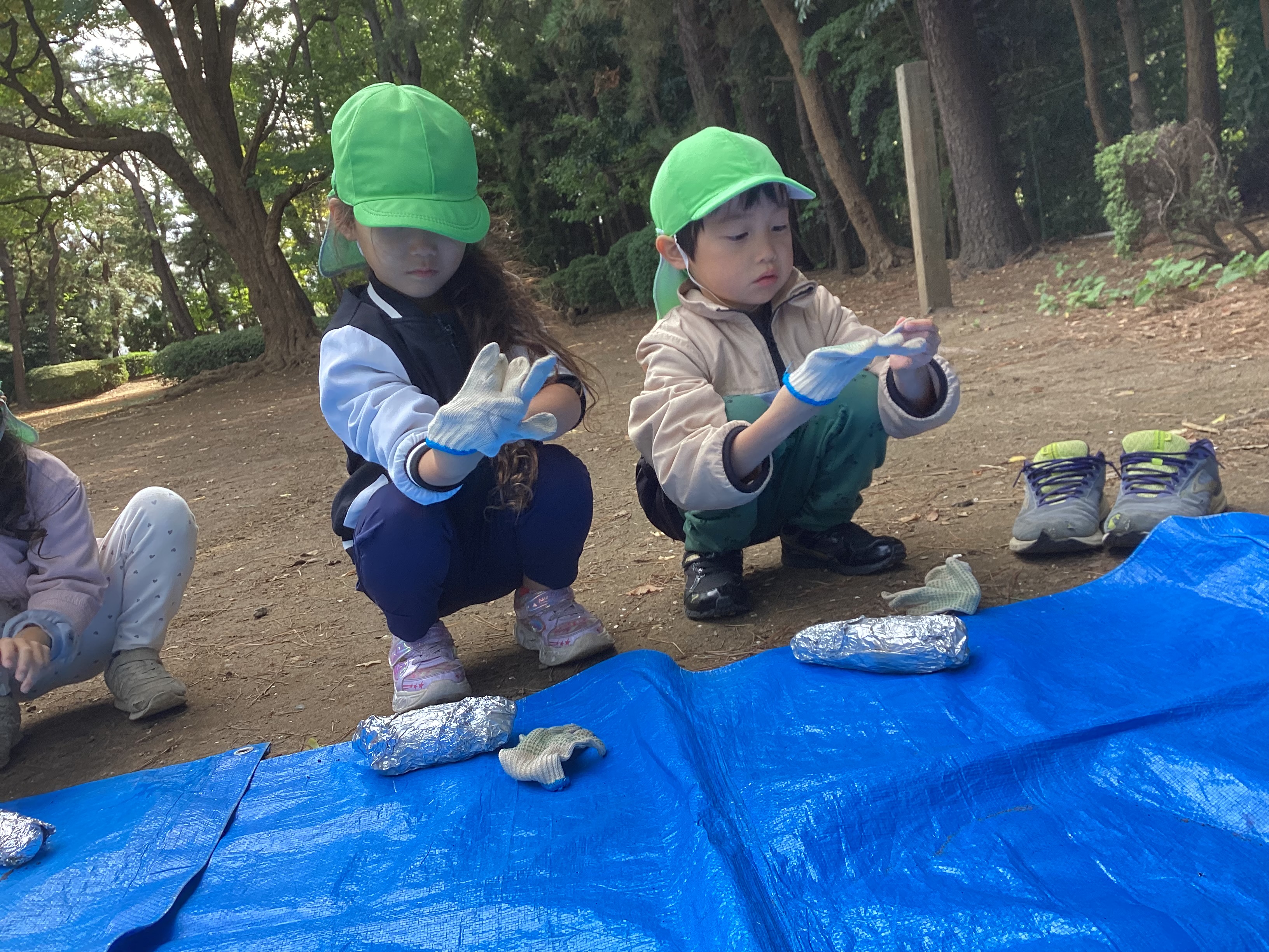 10月29日に浦安市少年の広場で焼き芋体験を行いました。芋を新聞紙やアルミホイルで上手に包み、広場内で木の棒や松ぼっくり等の燃える物も探しました。友だちや保育者に「おいしい!」や「もっと食べたい!」等の感想を楽しそうに話していました!