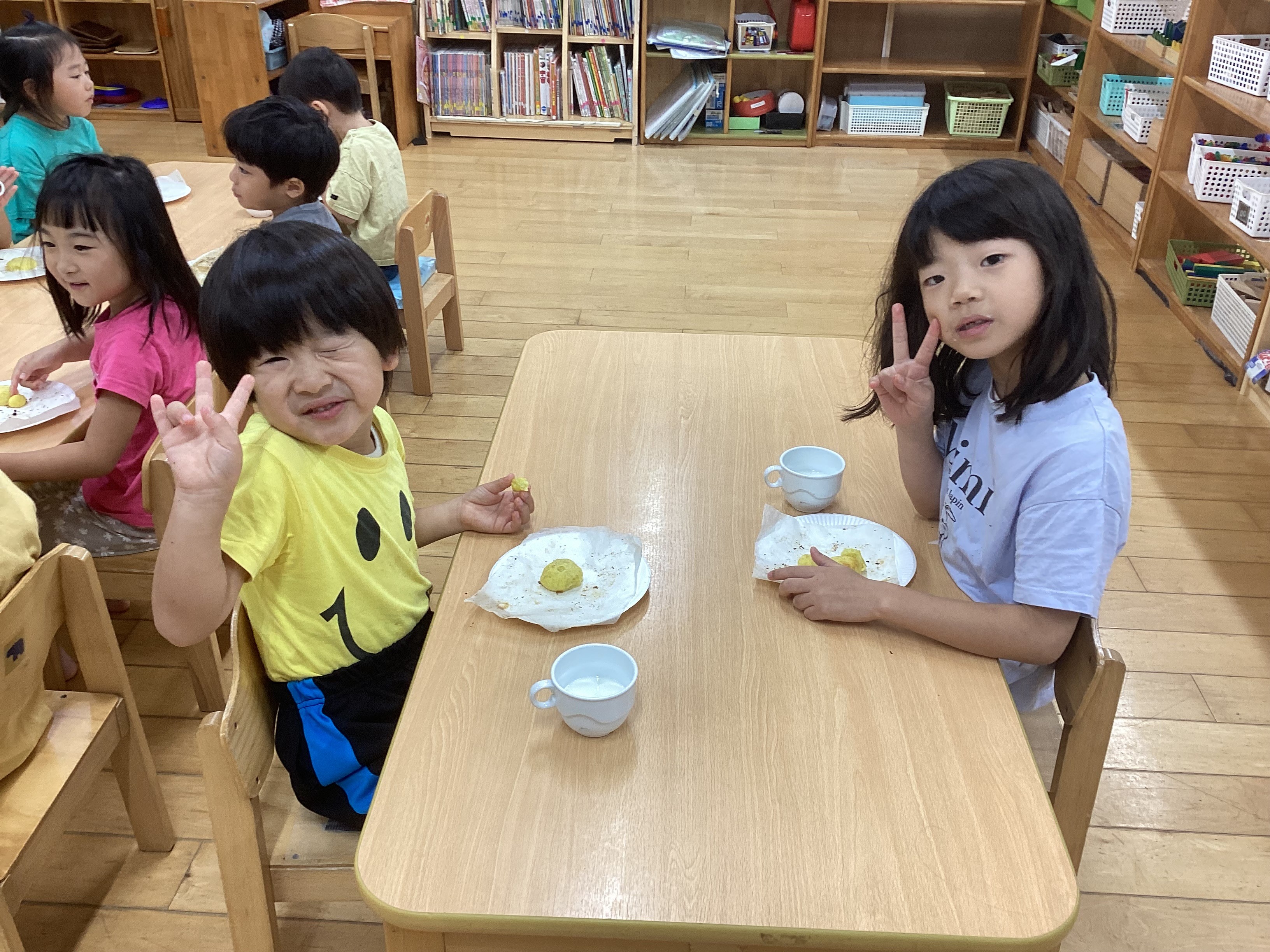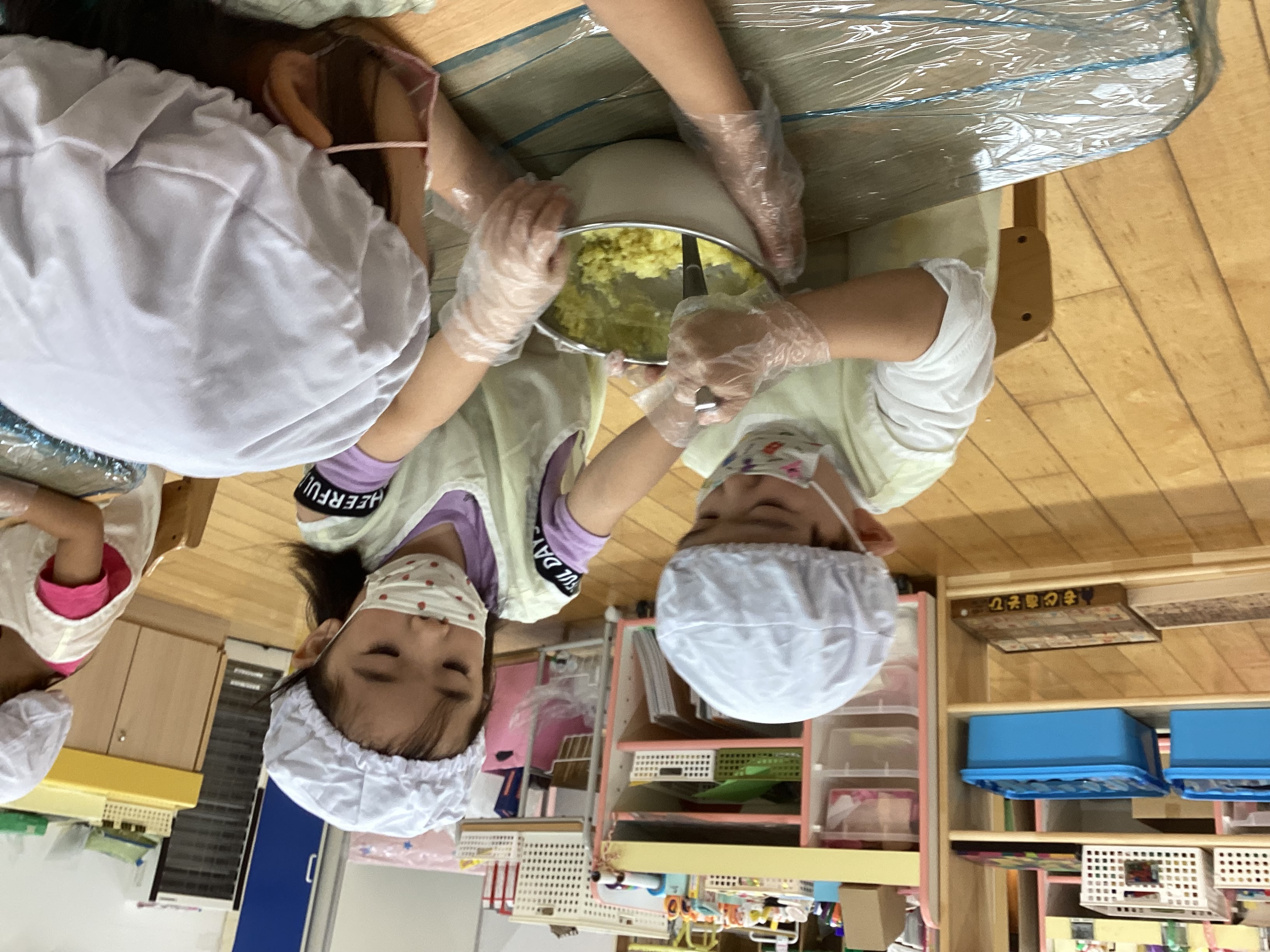 クッキングではスイートポテト作りをしました。友だちと協力して芋を潰したり材料を混ぜたりしました。熊や魚など好きな形を作り「早く食べたい!」とわくわくしていて、おやつで焼き上がったスイートポテトを食べると「おいしい!」とニコニコ笑顔でした!