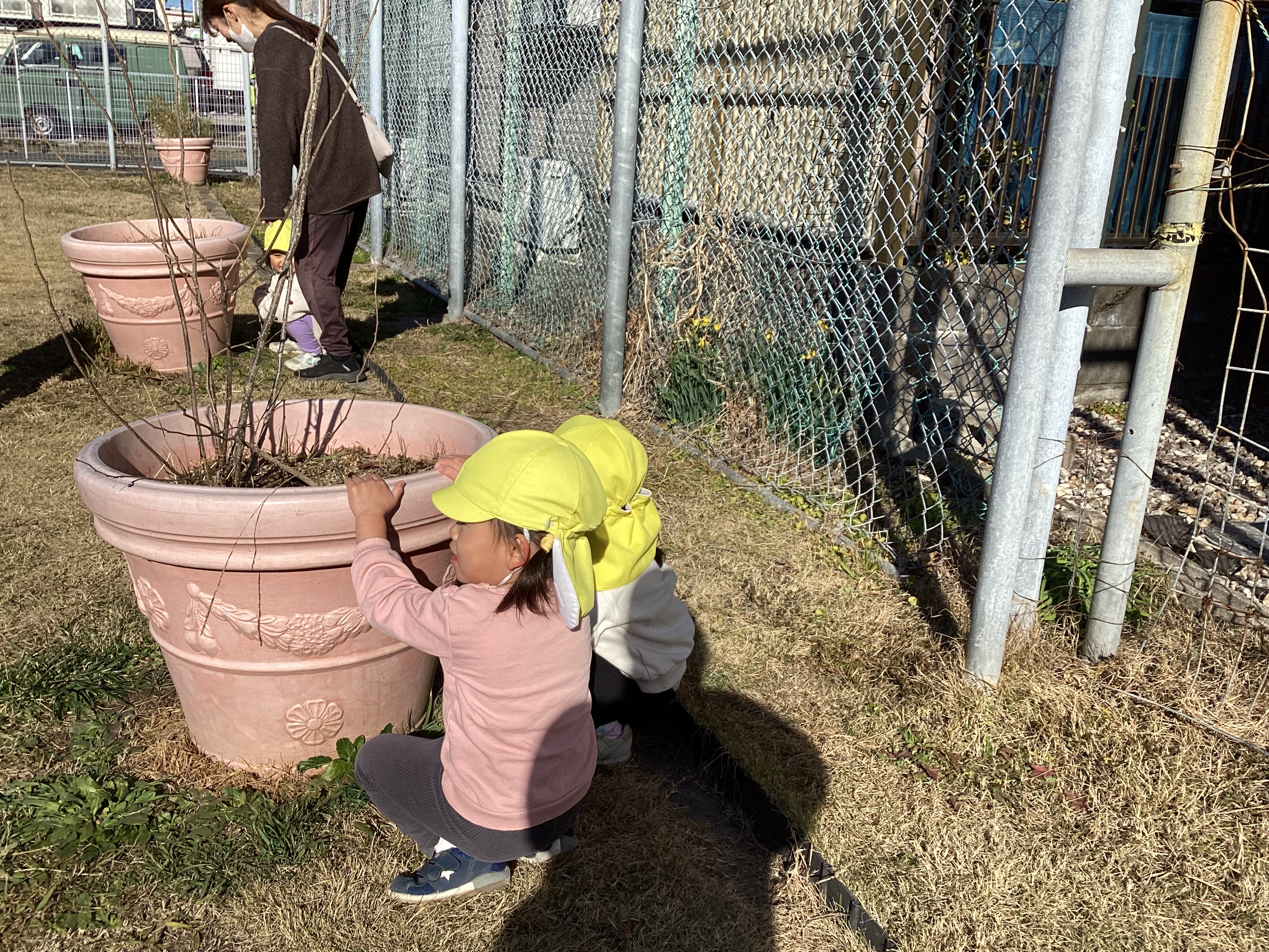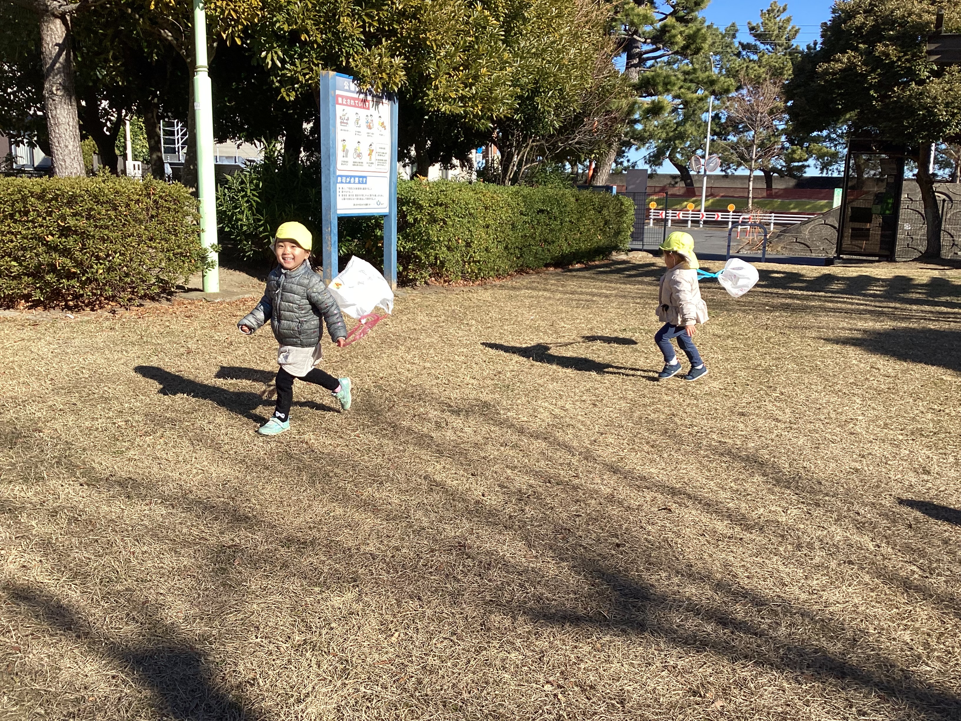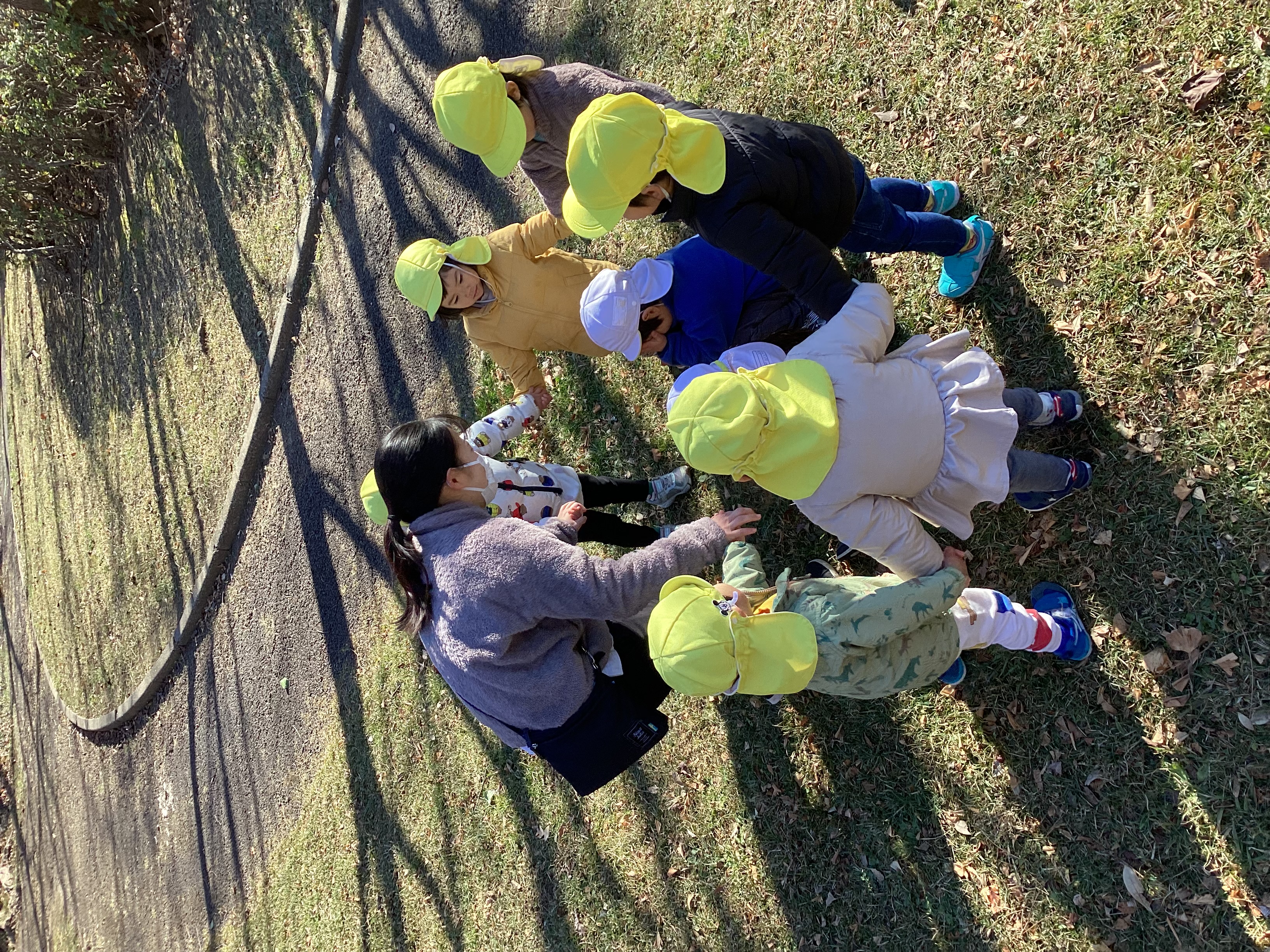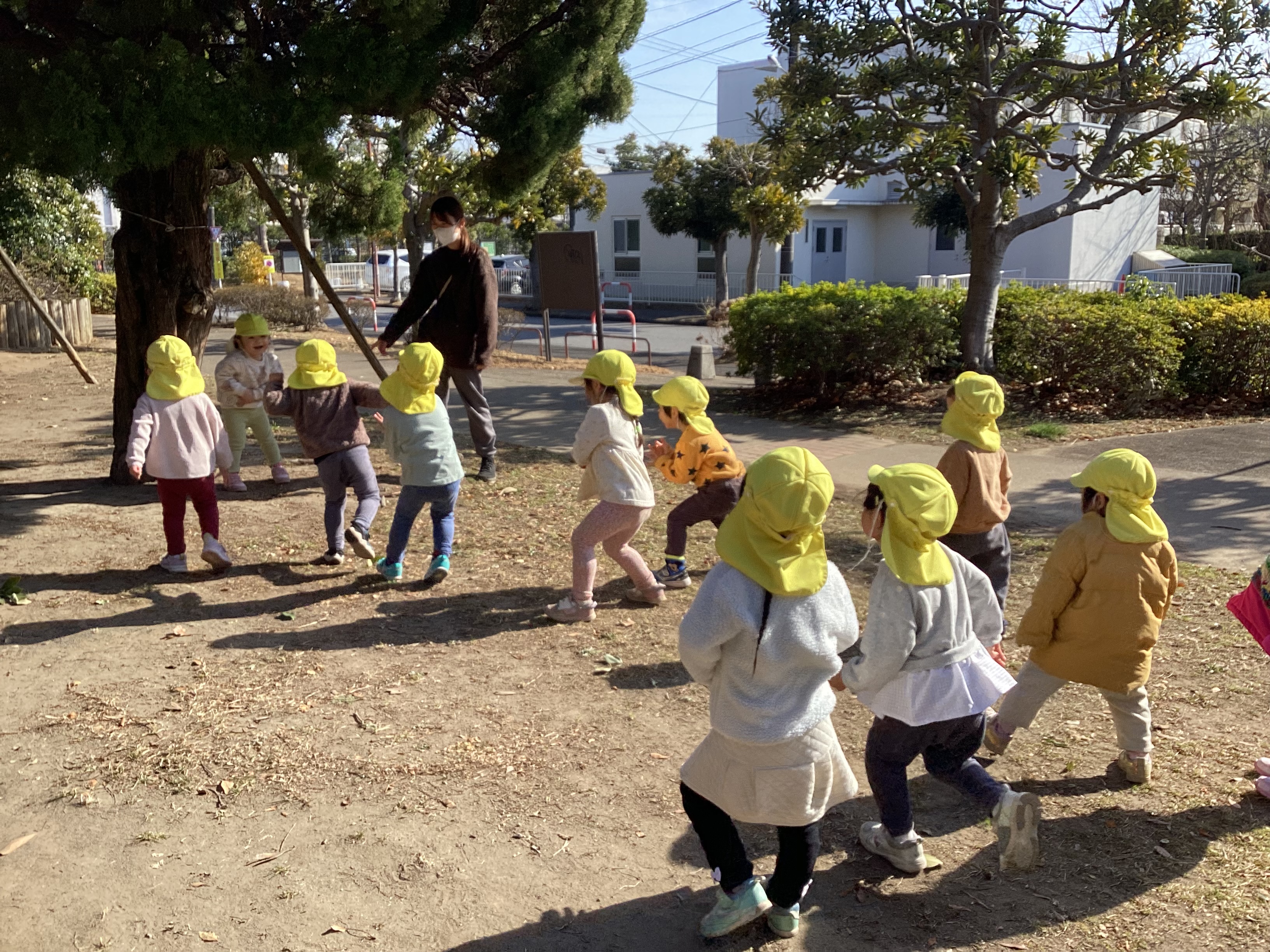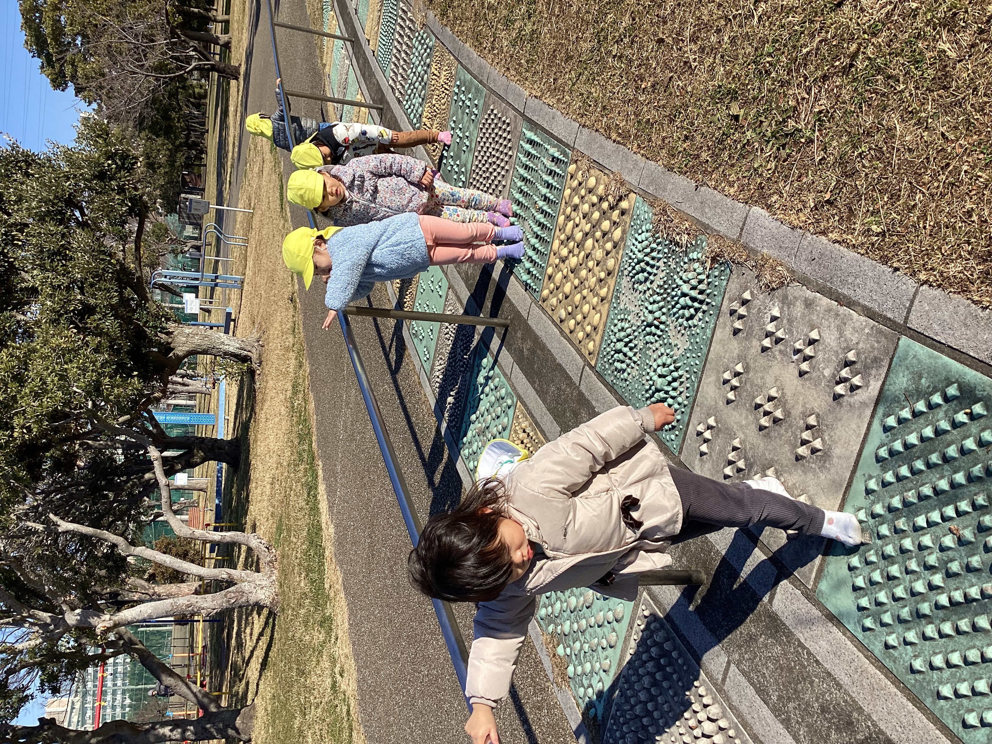 1月中旬には初めて海楽公園に出かけました。いつも行く公園よりだいぶ遠かったですが、「あと少し?」「何して遊ぶ?」とわくわくした様子のこどもたちでした。公園では足つぼに挑戦しました。余裕の表情で何周もするこどもたちの姿に驚きです。帰り道は疲れが見られましたが、無事に保育園に到着すると「今日沢山歩いたよね」「やっと保育園着いた」など達成感を感じている姿も見られましたよ。一生懸命歩くこどもたちを見て成長を感じました。