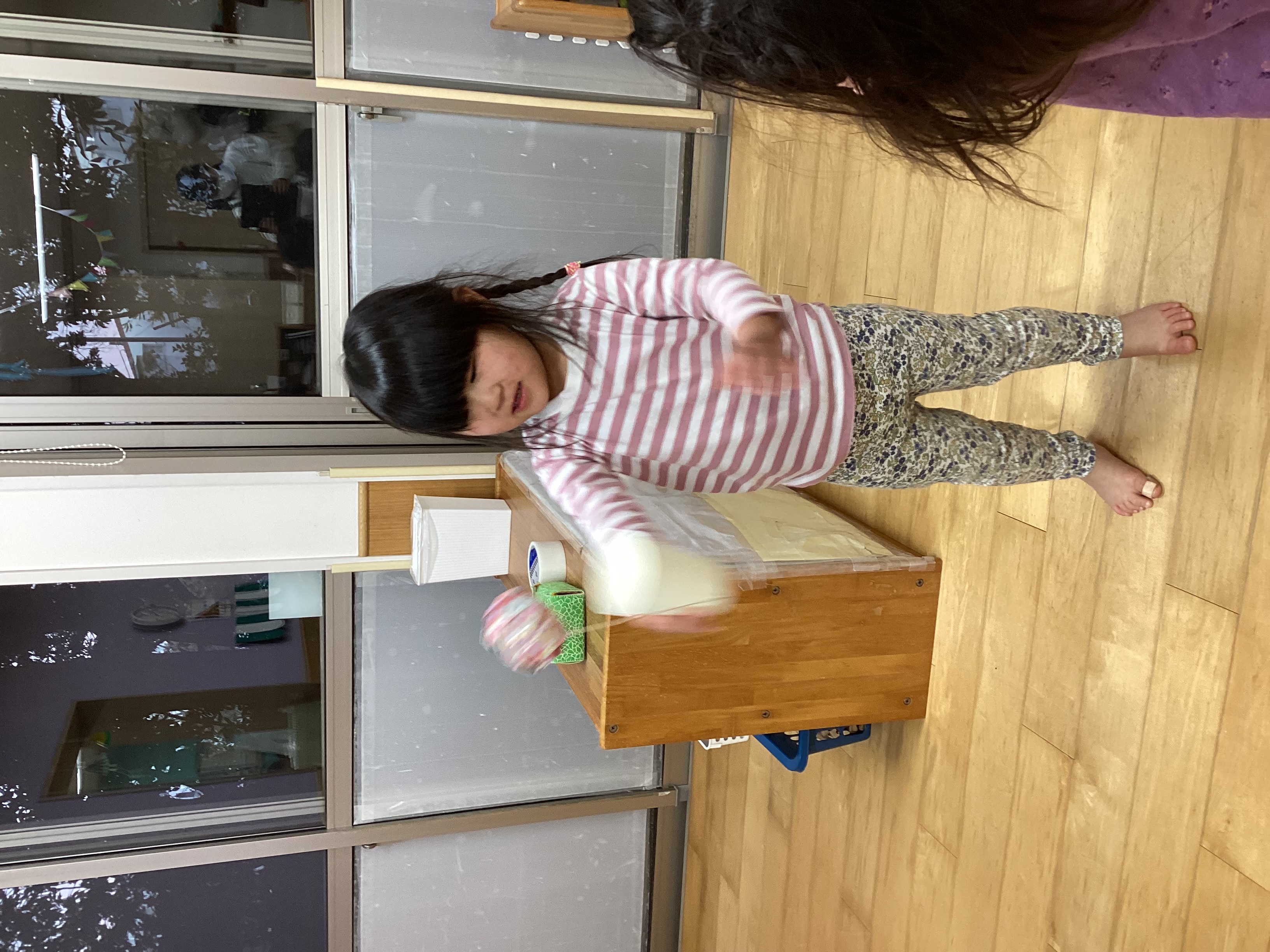 また、凧揚げやけん玉など正月遊びを楽しみました。自分でビニール袋に絵を描いて凧を作り、風を受けて凧が揚がると「わぁ!」と大喜びでした。けん玉では手を上に振るタイミングが難しく苦戦していましたが、保育者の見本を見ながら一生懸命頑張っていましたよ。