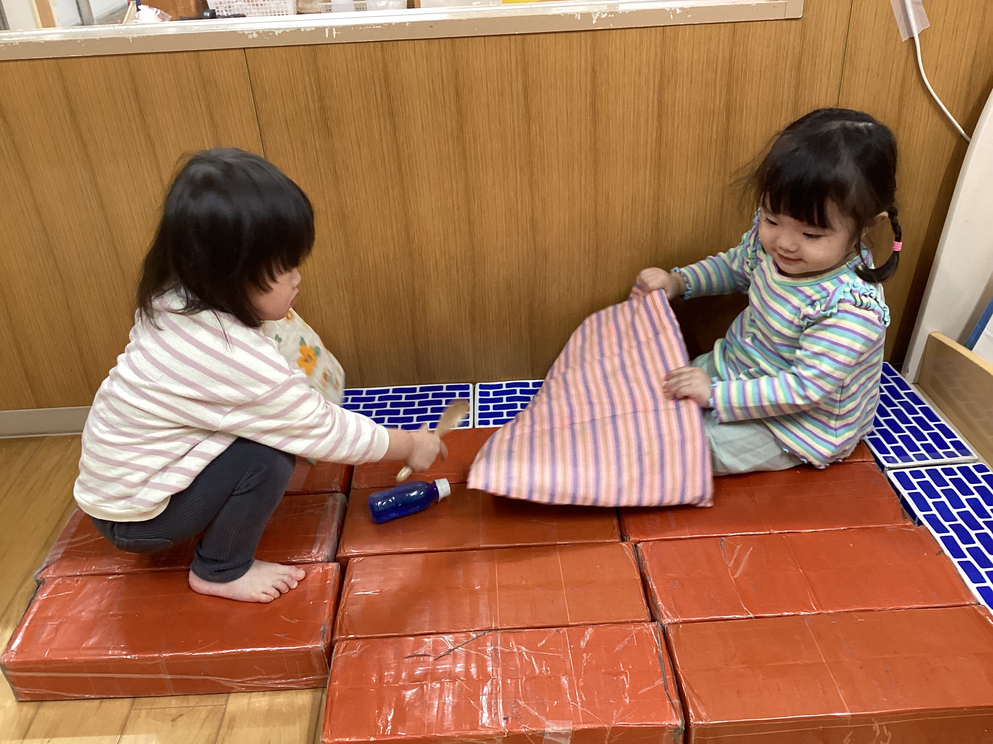 室内遊びでは、レンガブロックで家やベッドを作ってごっこ遊びを楽しむ姿も見られます。「私ママ役ね」「ここは○○にしよう」などイメージを共有し相談しながら遊ぶ姿が可愛いです。
