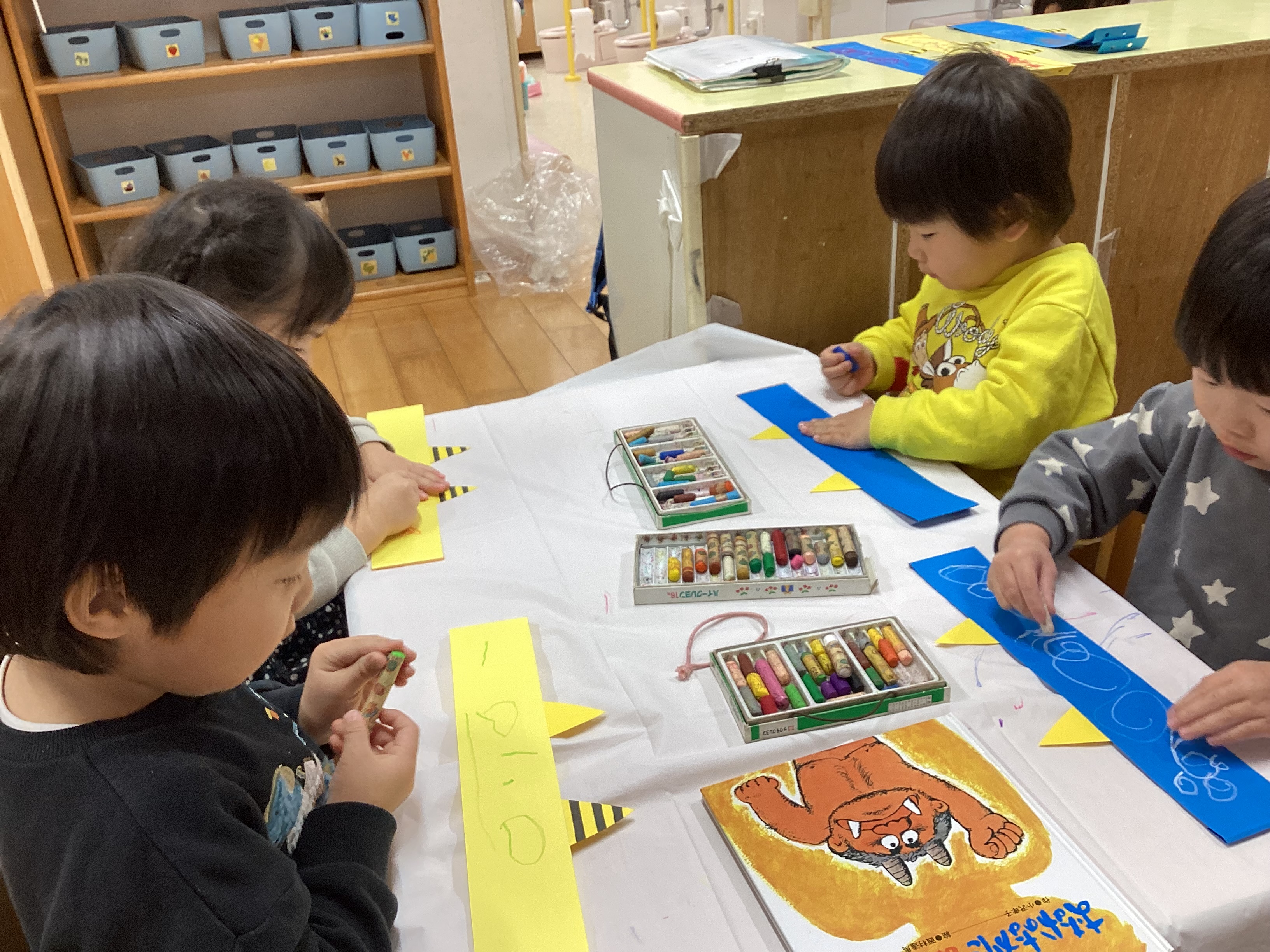 1月のあひる組の様子をお伝えします。年末年始の休み明けの登園では、「あけましておめでとうございます」と保育者や友だちに新年の挨拶をしたり、「じいじとばあばのお家に行ってお餅ぺったんしたよ」「お願いしに行ったよ」など休み中の出来事を教えてくれたりする姿が見られました。
