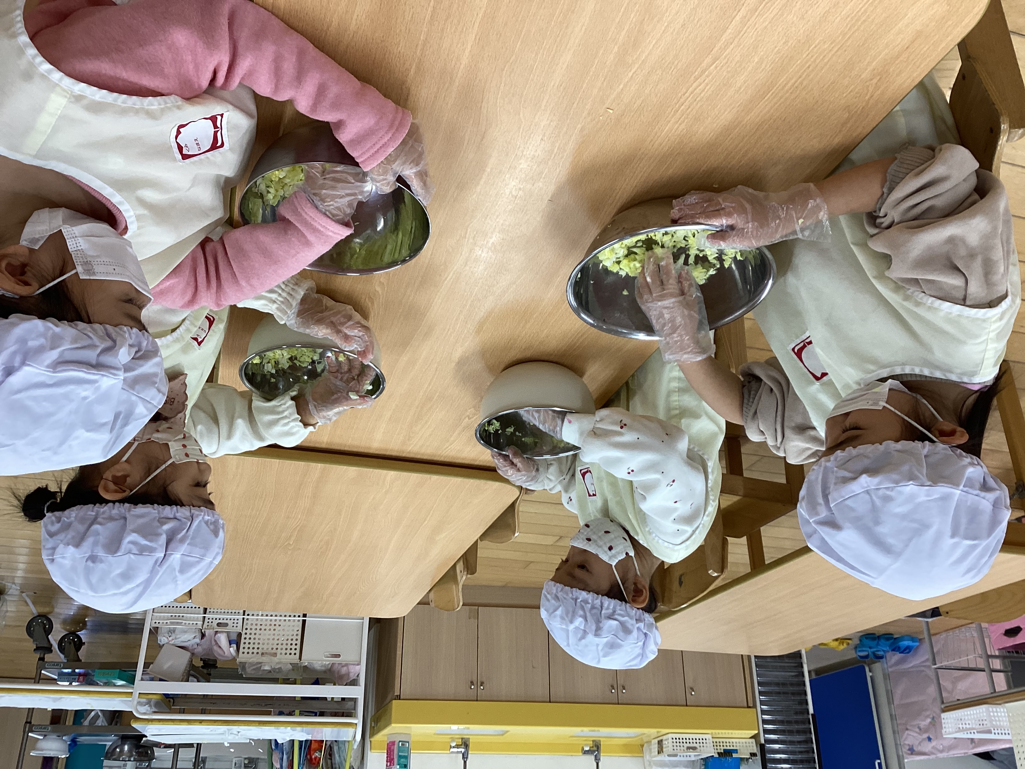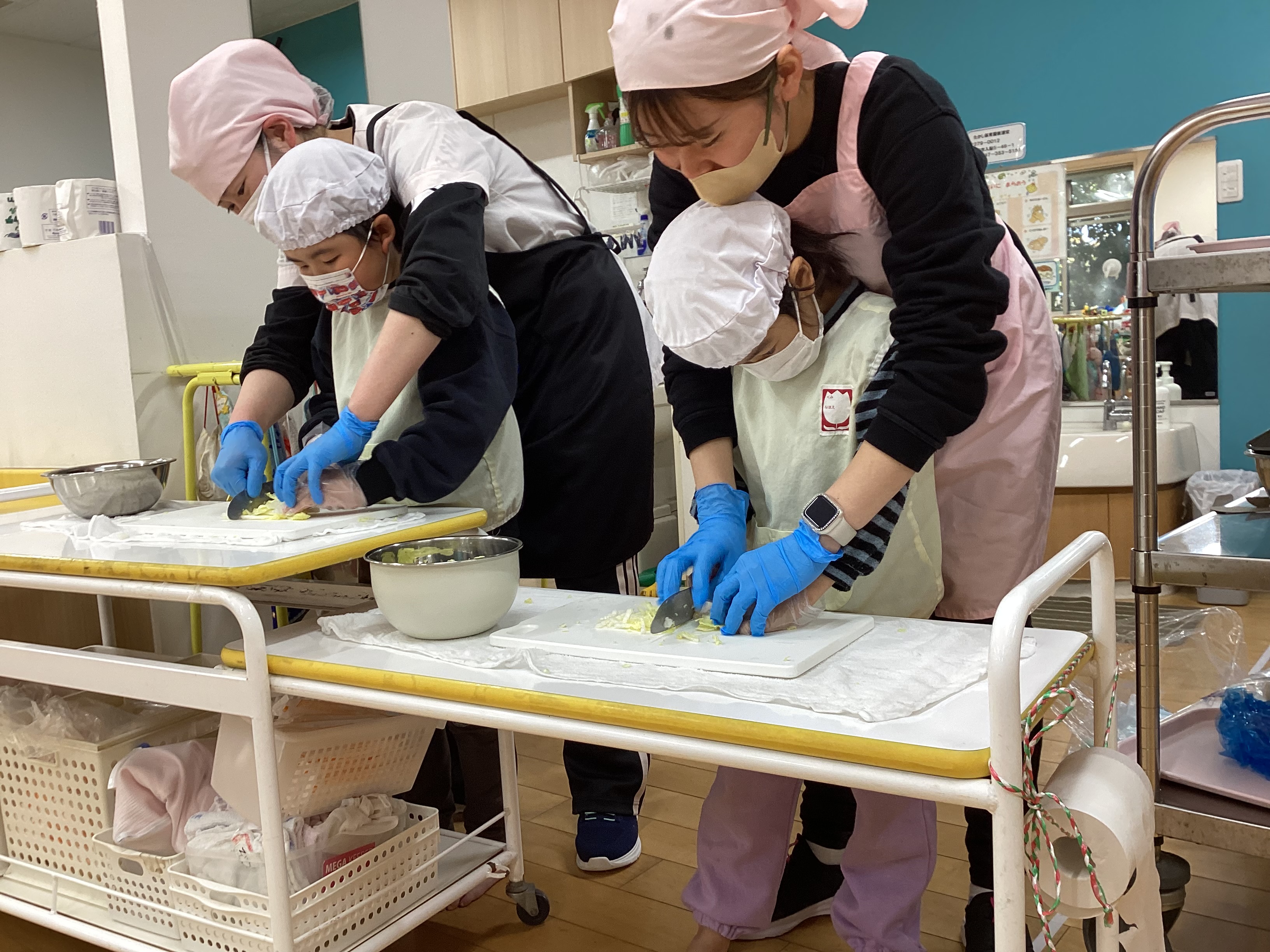 5歳さんは餃子に包むキャベツや白菜などの具材を大人と一緒に包丁を使って切りました。包丁の使い方や食材を押さえる手の形など栄養士に教わりながら慎重に切っていきました。具材が切り終わったら肉と野菜をよく混ぜ合わせて栄養士に餃子の包み方を教わり自分の餃子を作りました。